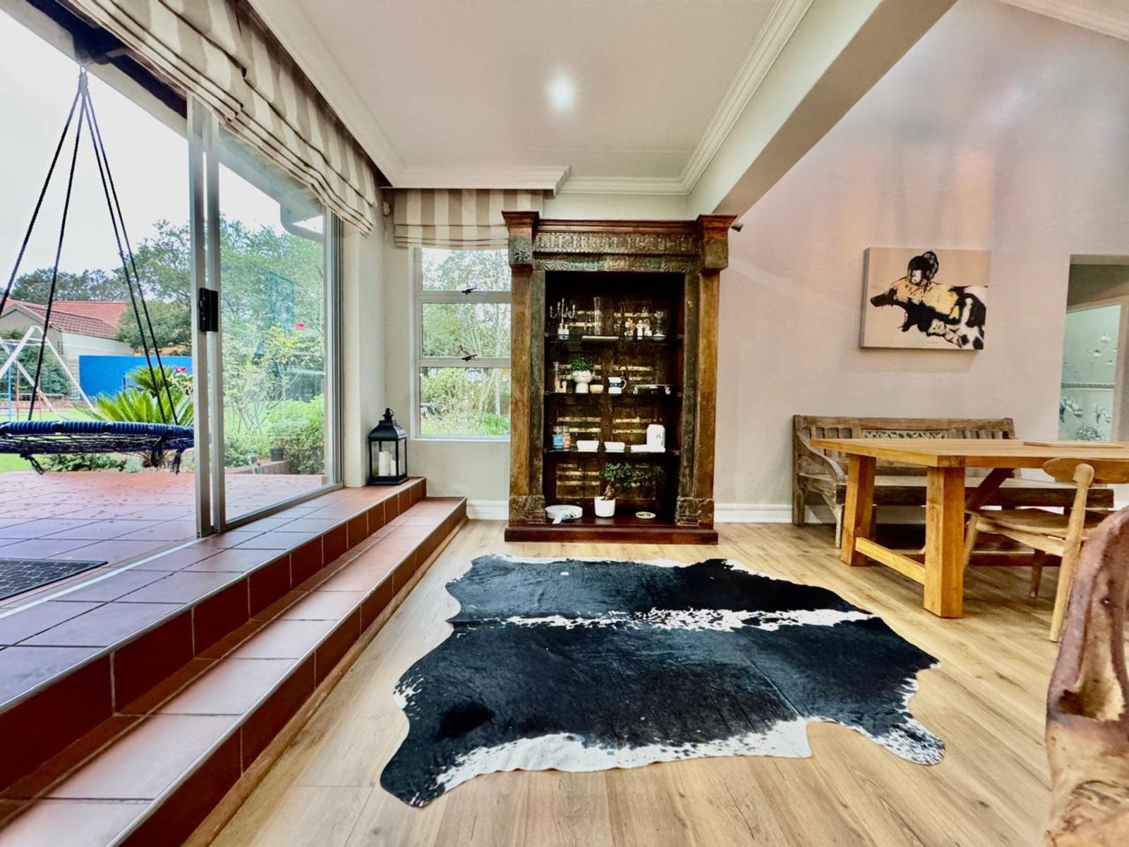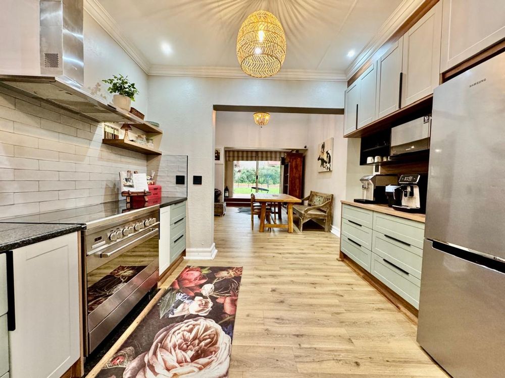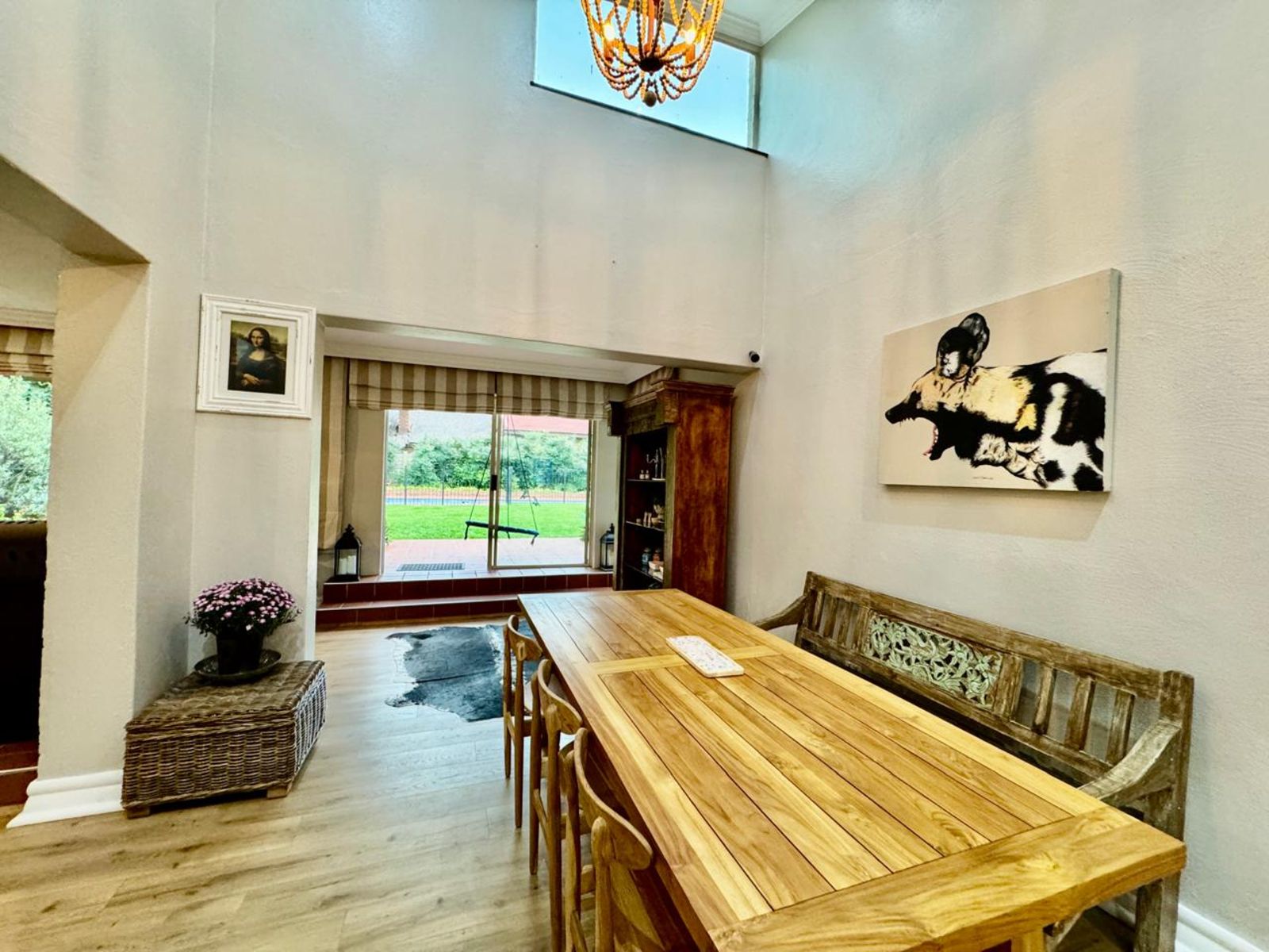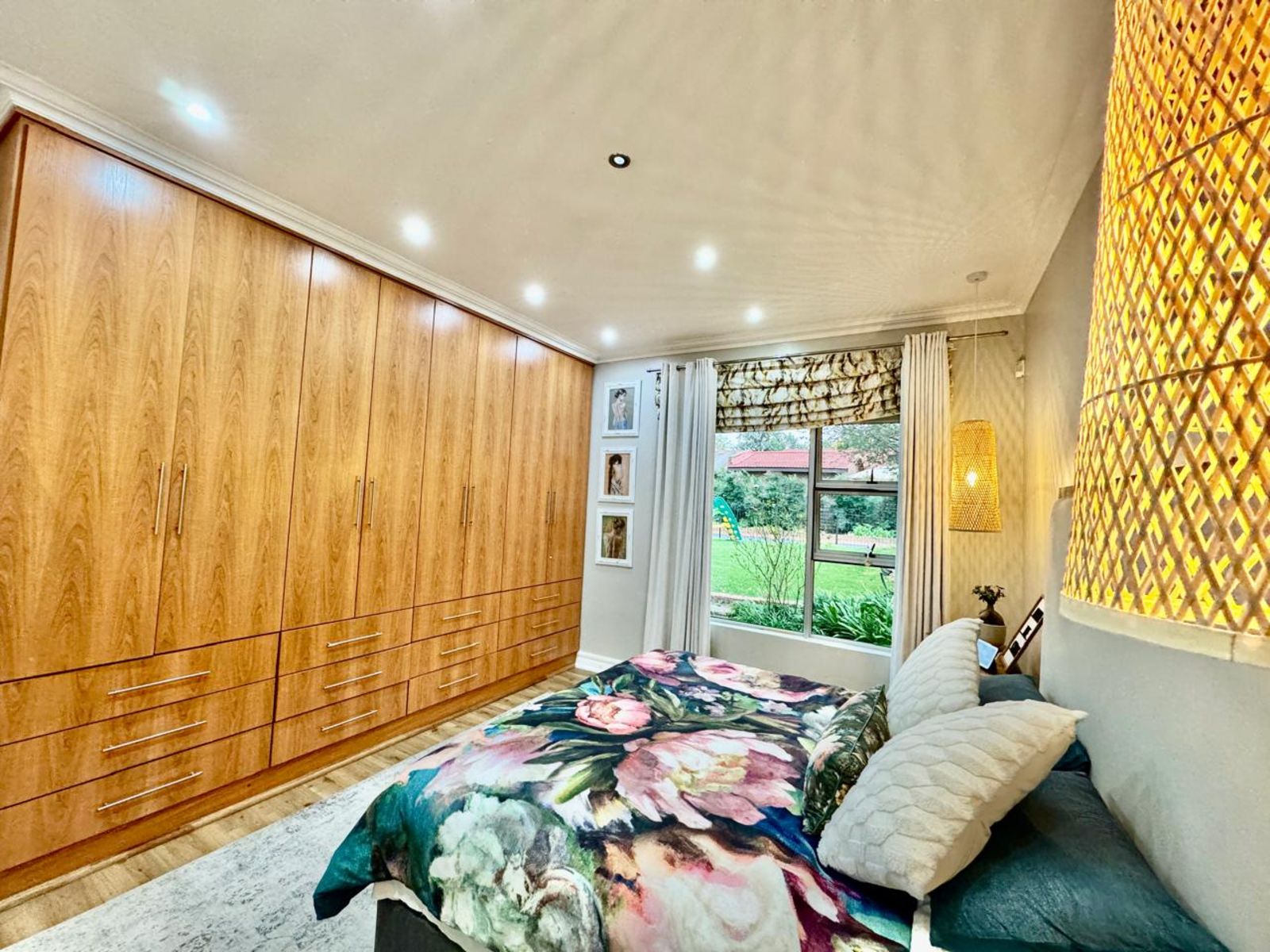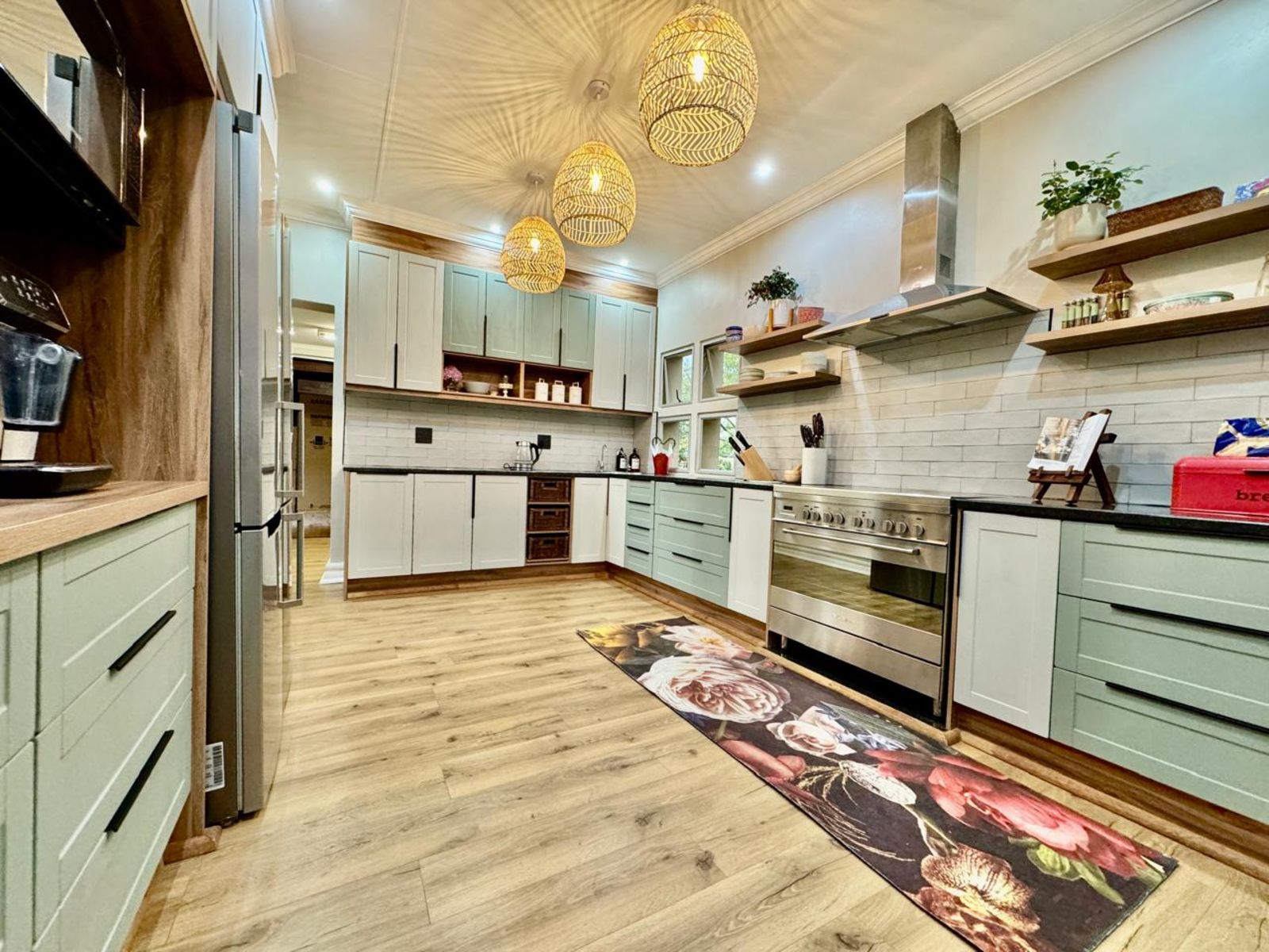 The modern kitchen is equipped with sleek finishes, quality appliances, and elegant lighting, complemented by a separate scullery to keep the entertaining area pristine. The dining area opens directly onto the garden patio, perfect for summer braais and family gatherings.