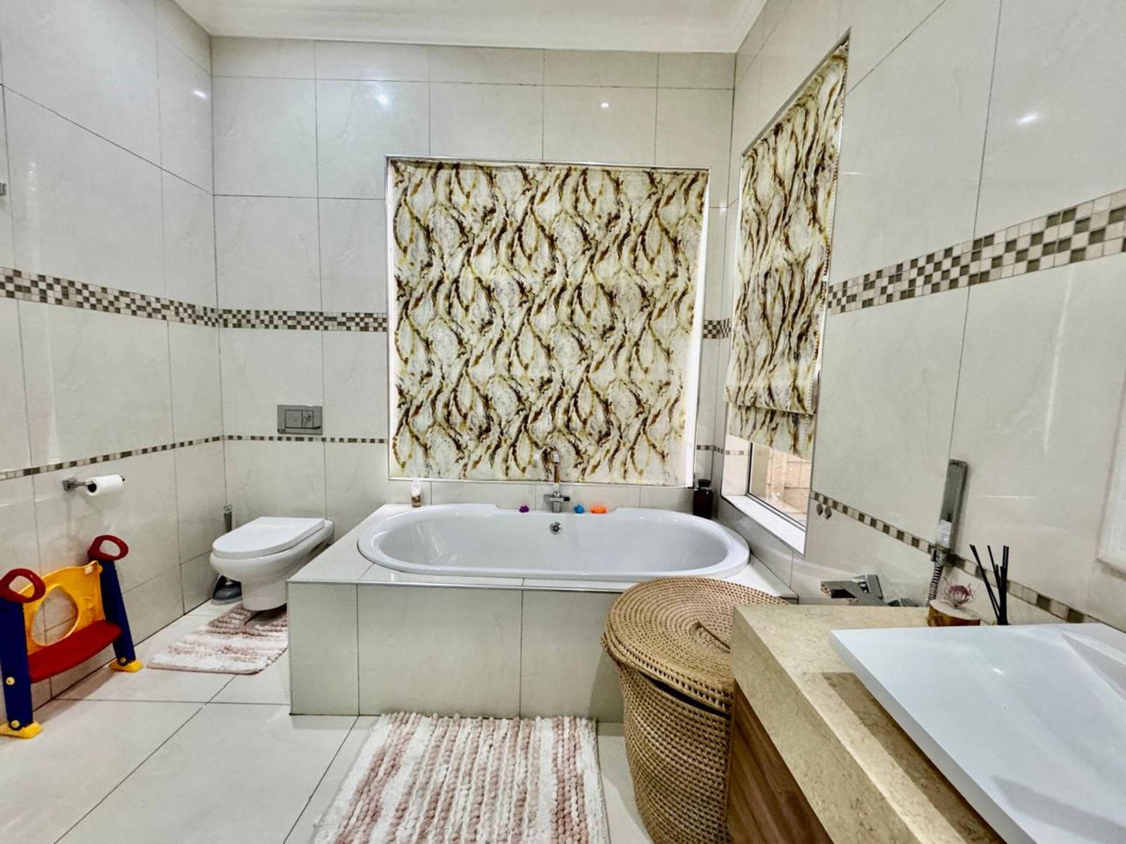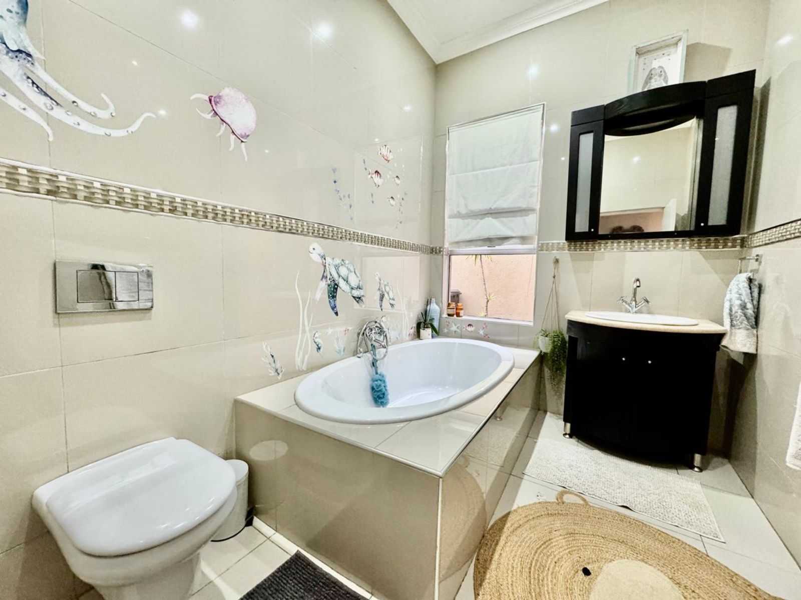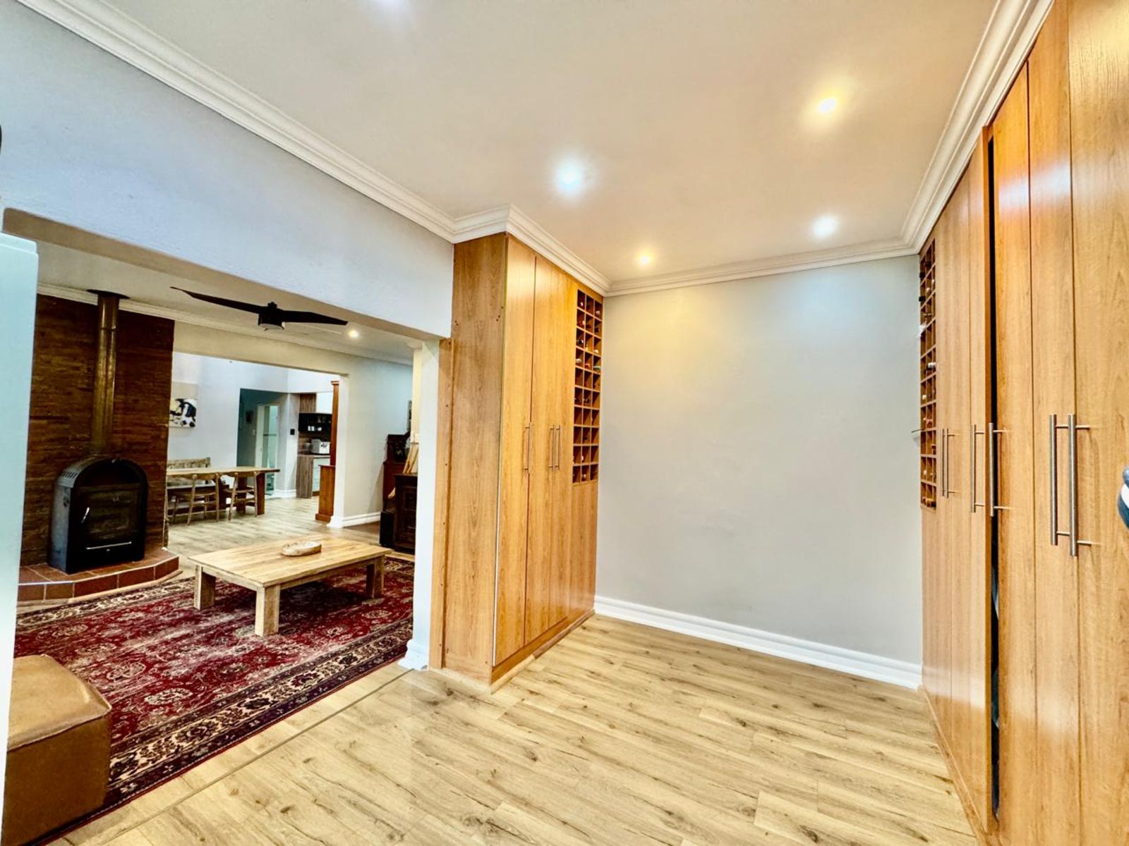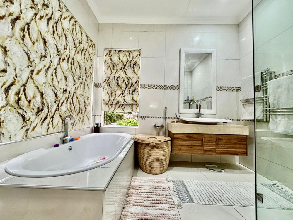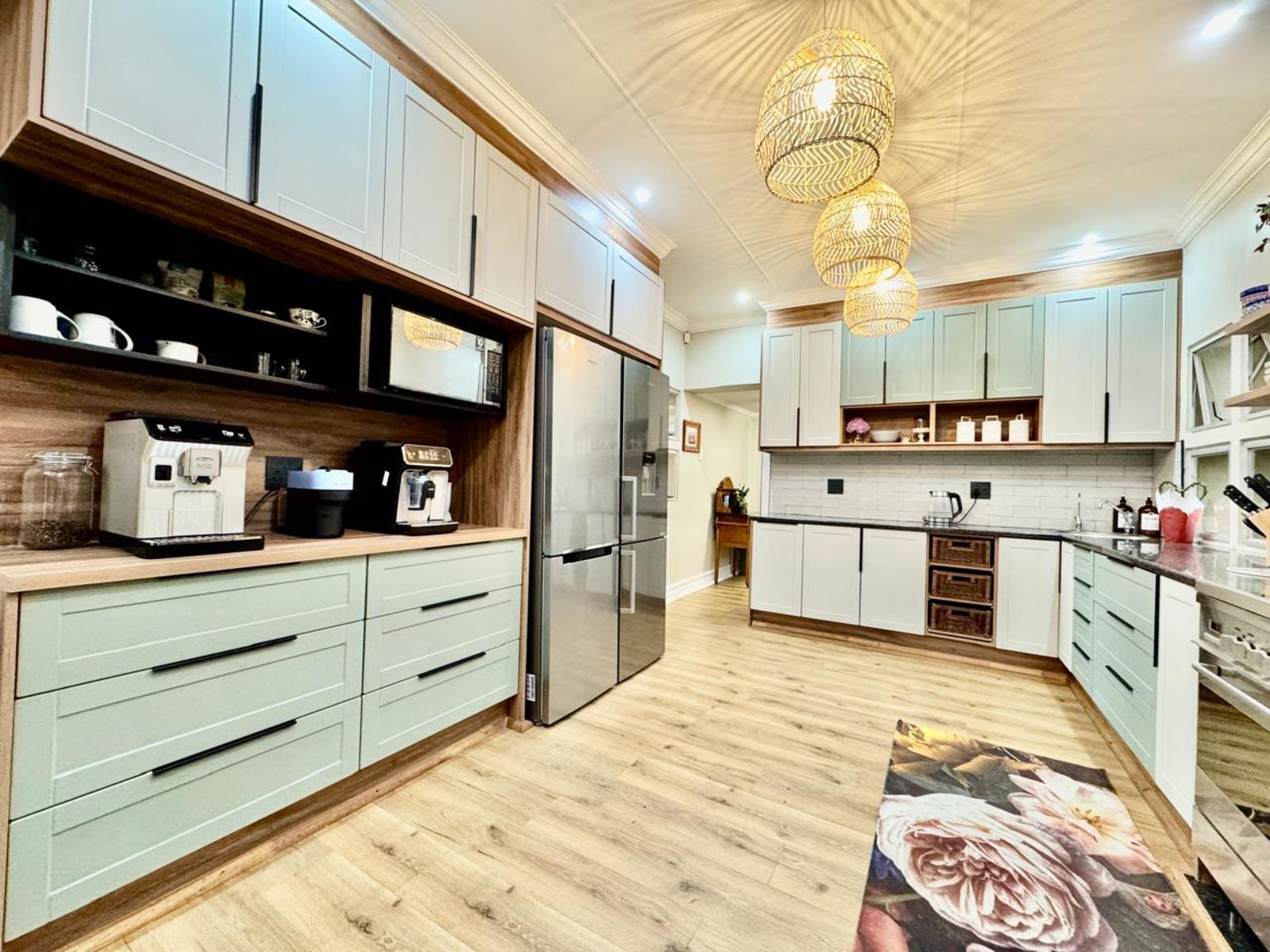 The modern kitchen is equipped with sleek finishes, quality appliances, and elegant lighting, complemented by a separate scullery to keep the entertaining area pristine. The dining area opens directly onto the garden patio, perfect for summer braais and family gatherings.