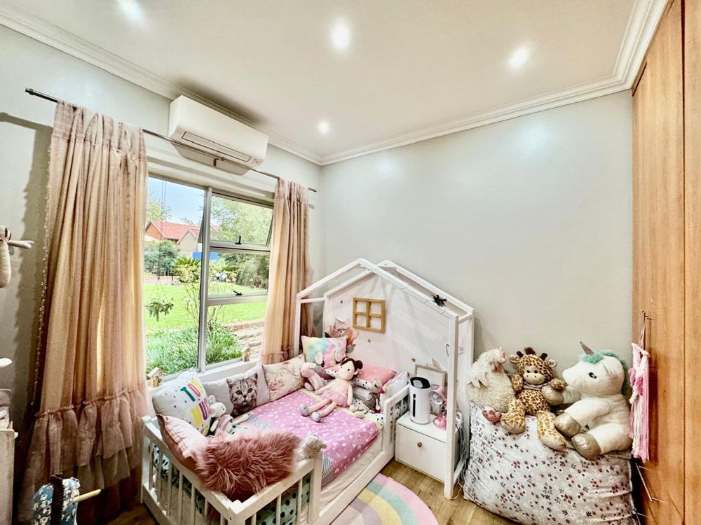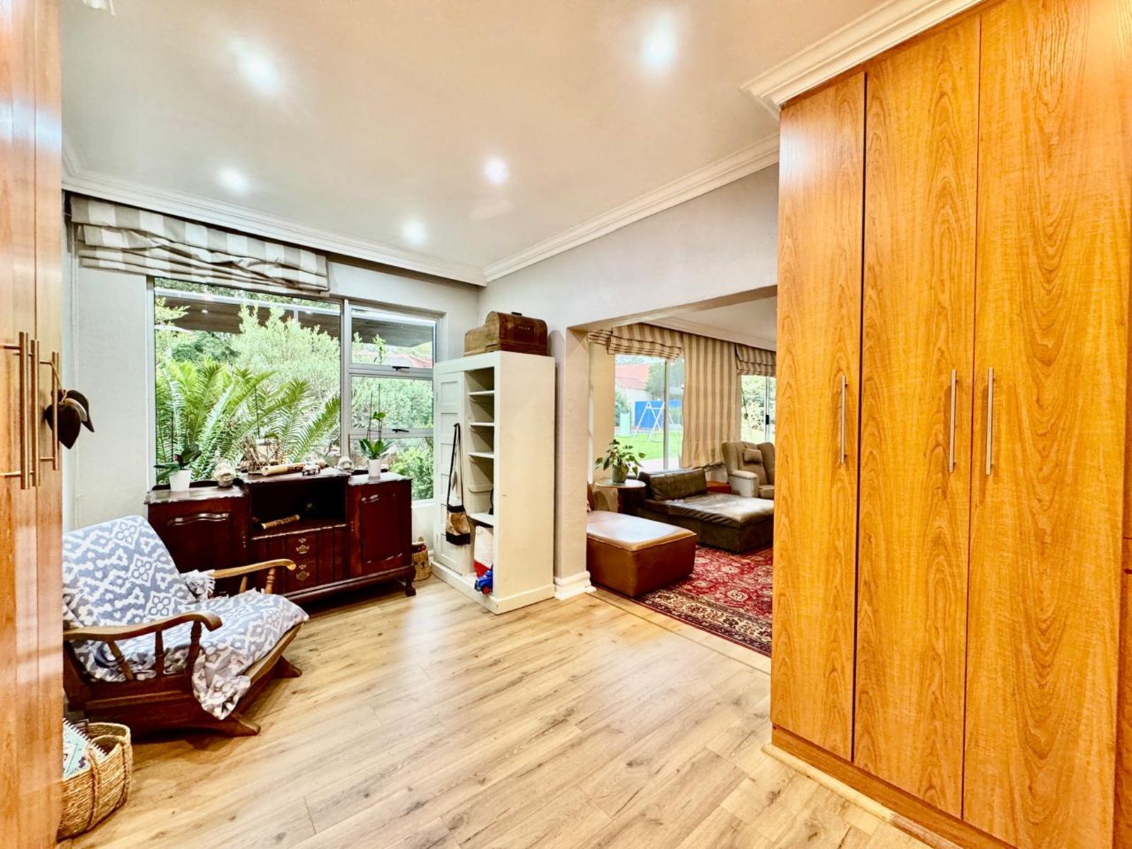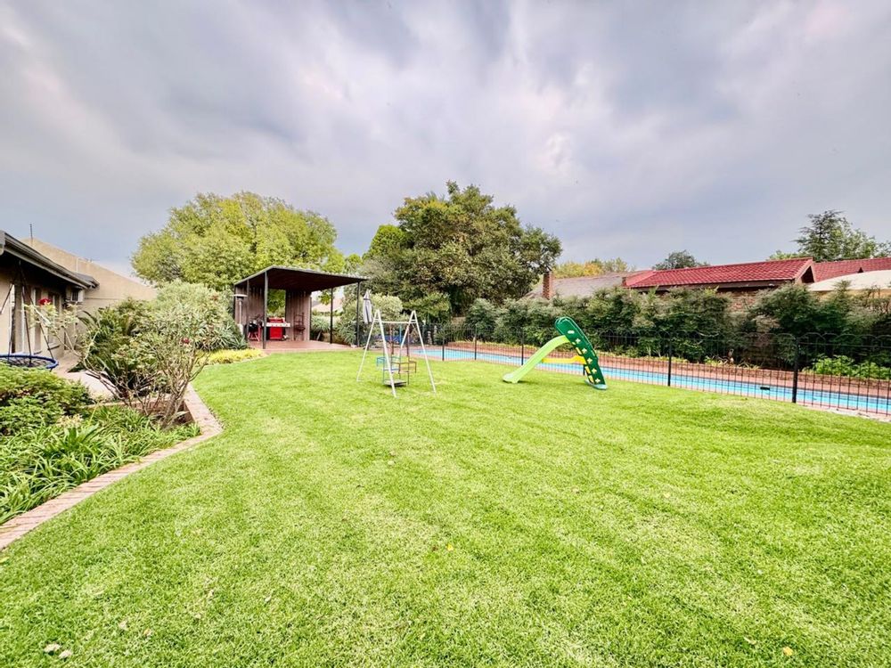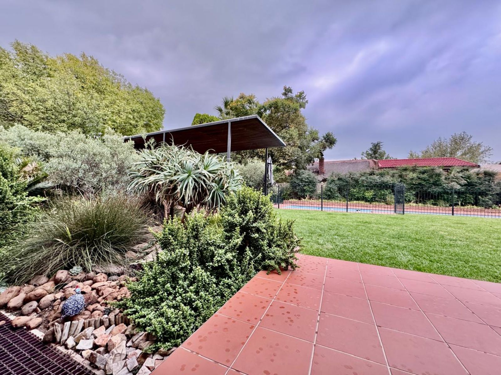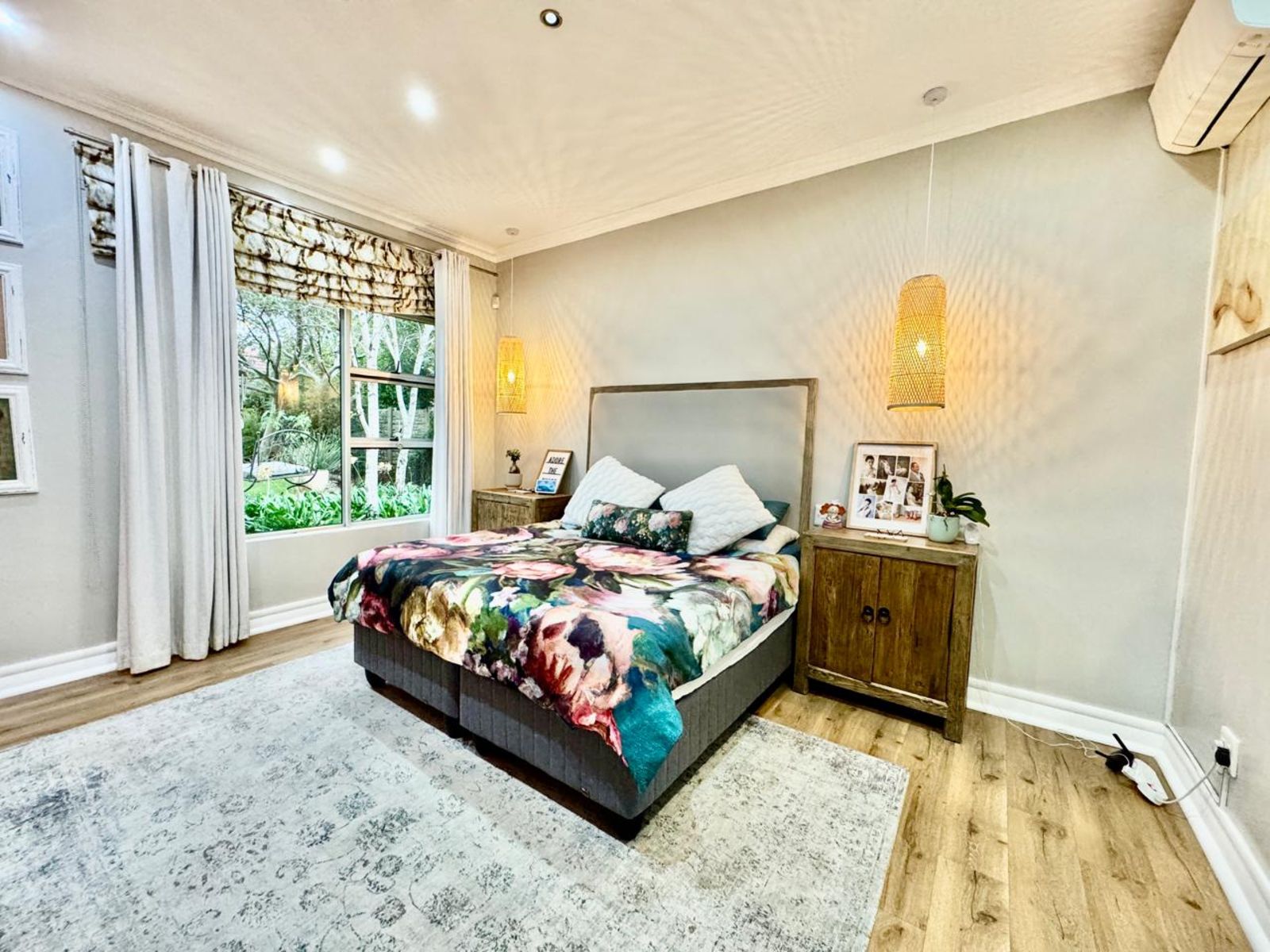 The modern kitchen is equipped with sleek finishes, quality appliances, and elegant lighting, complemented by a separate scullery to keep the entertaining area pristine. The dining area opens directly onto the garden patio, perfect for summer braais and family gatherings.