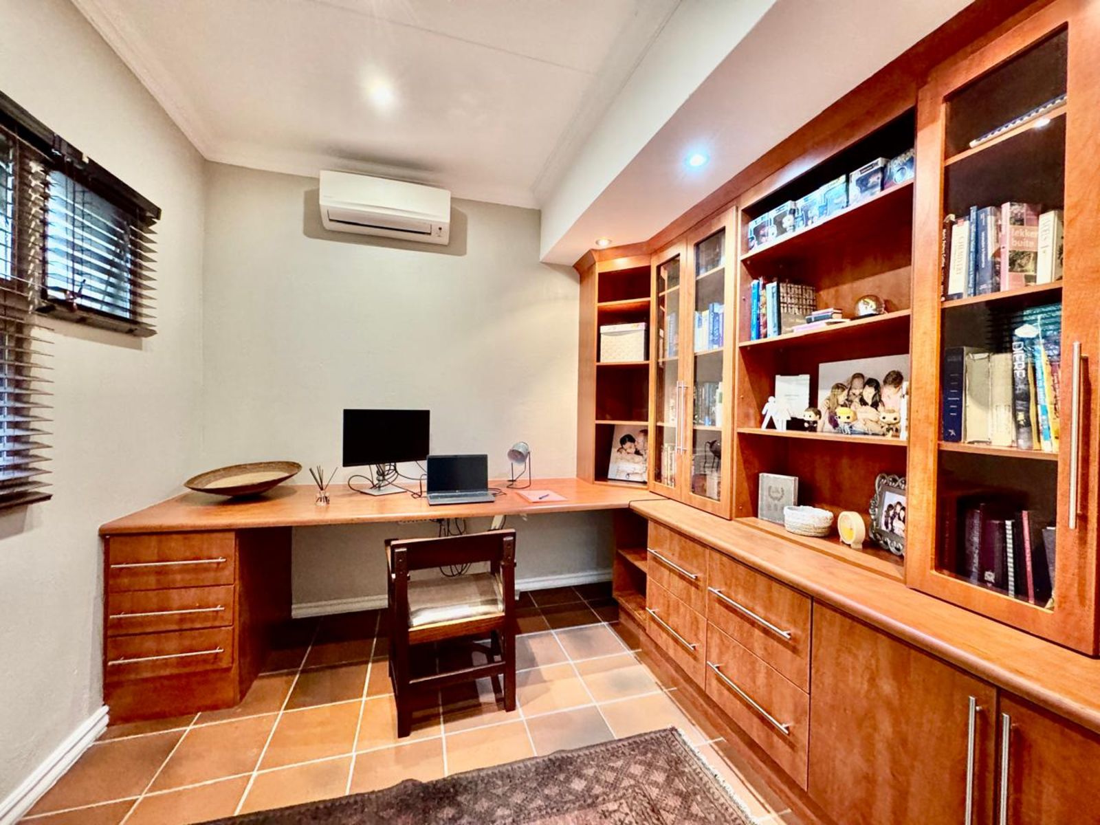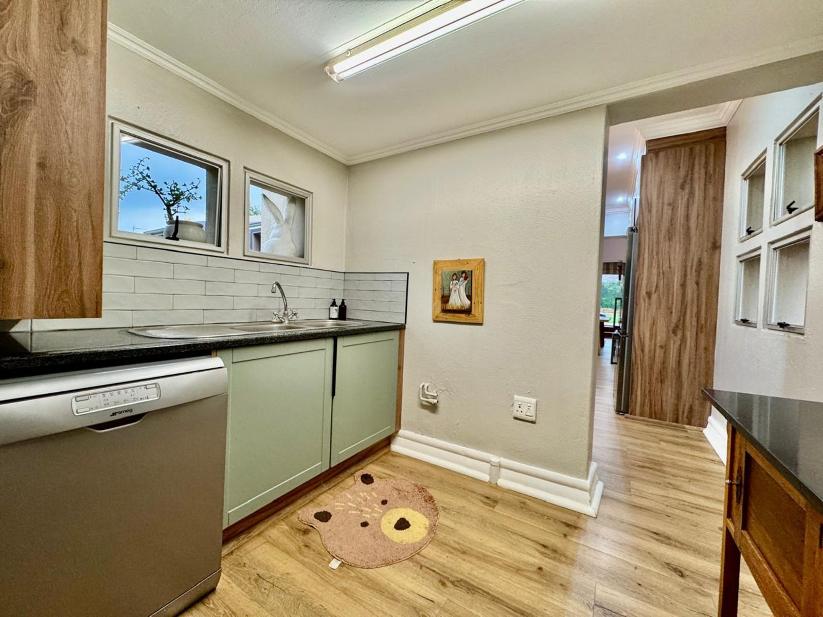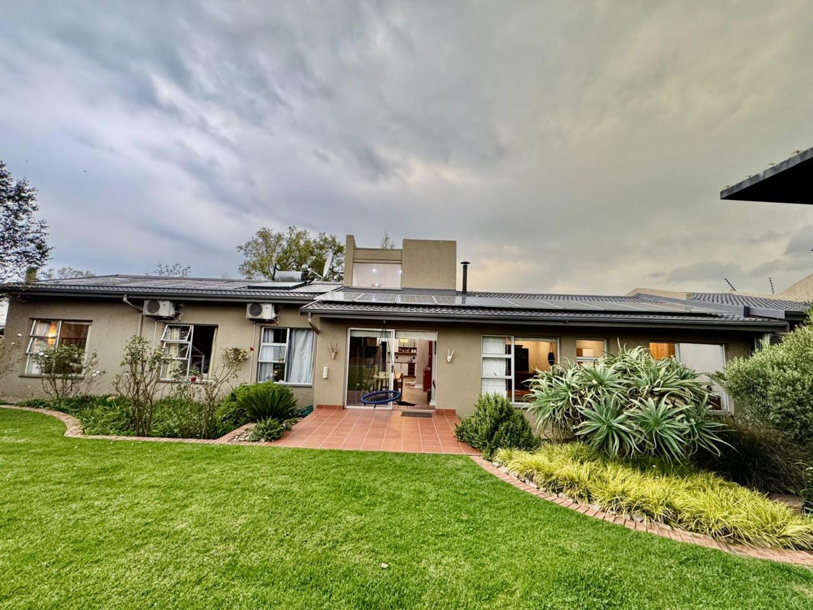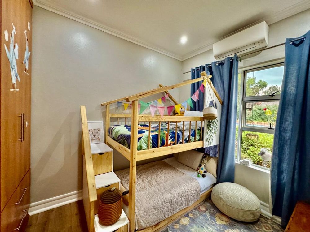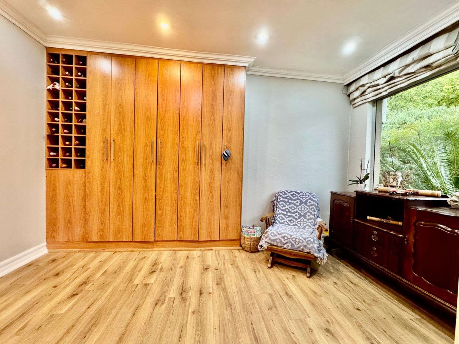 The modern kitchen is equipped with sleek finishes, quality appliances, and elegant lighting, complemented by a separate scullery to keep the entertaining area pristine. The dining area opens directly onto the garden patio, perfect for summer braais and family gatherings.