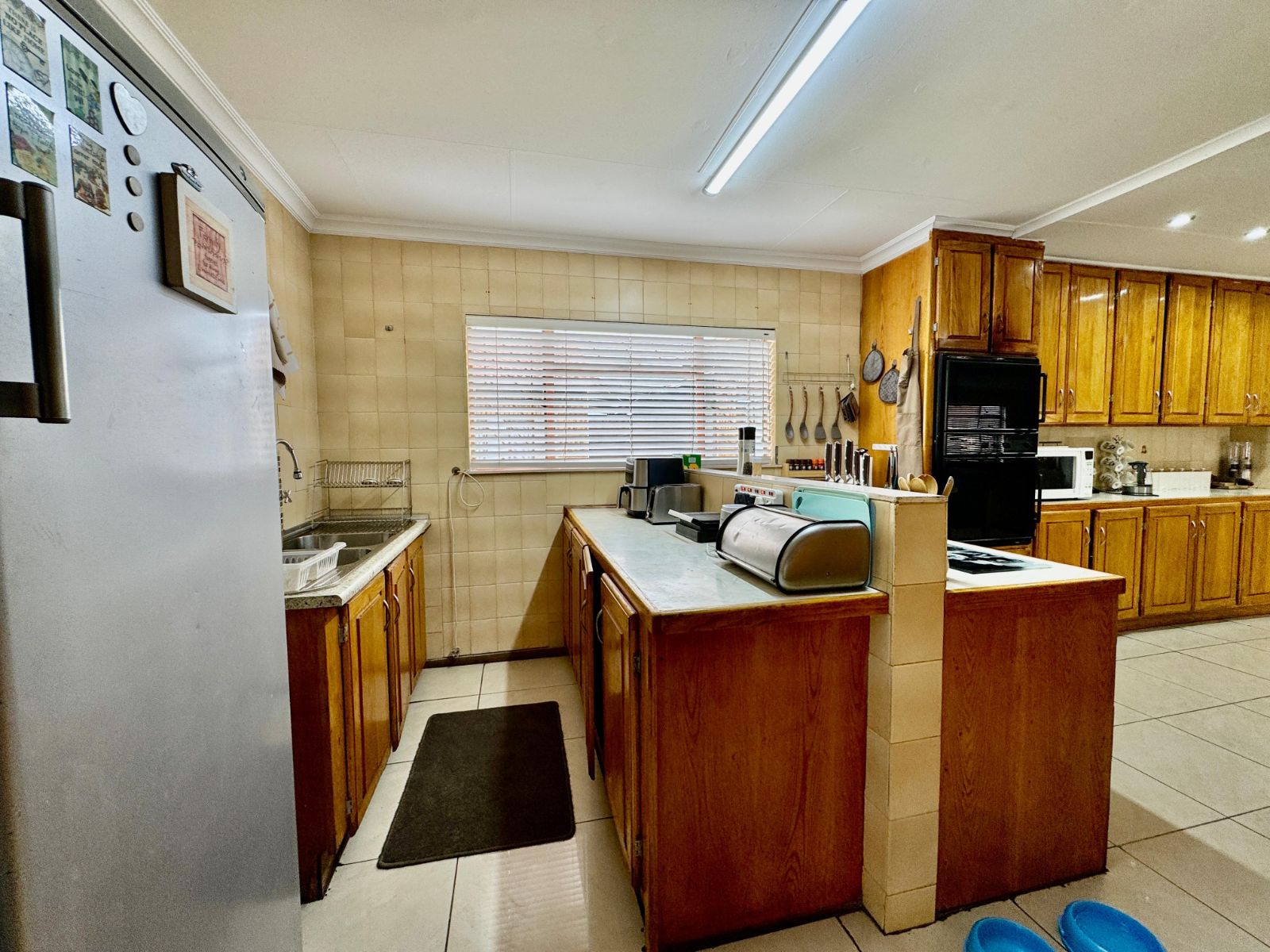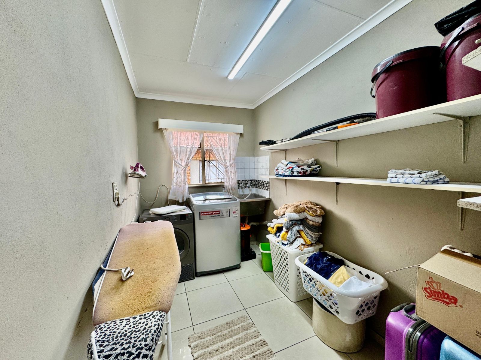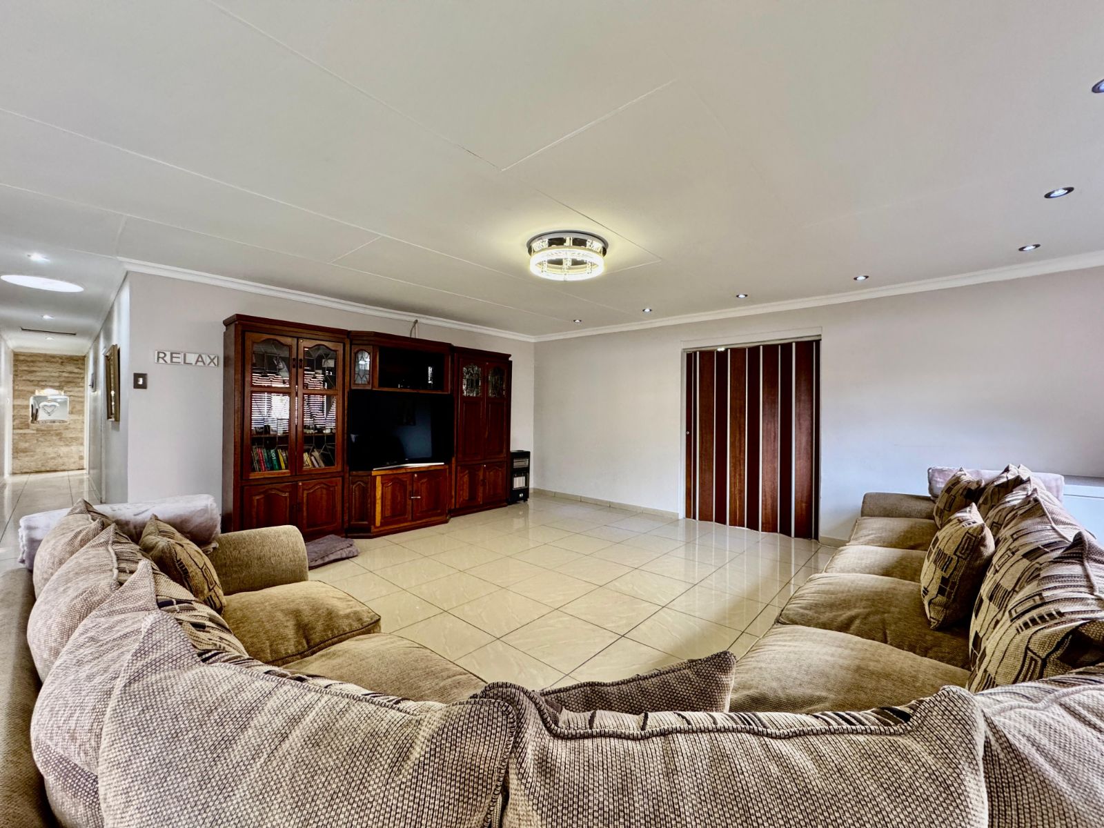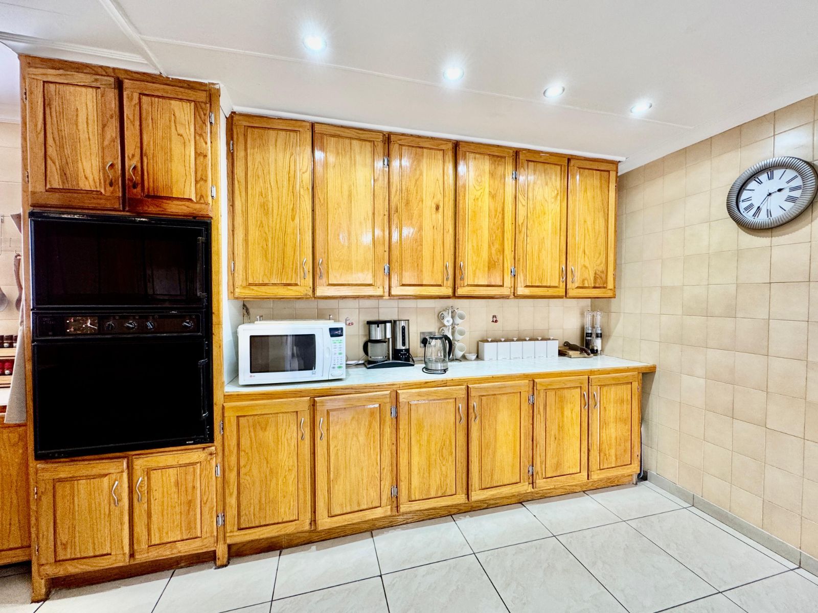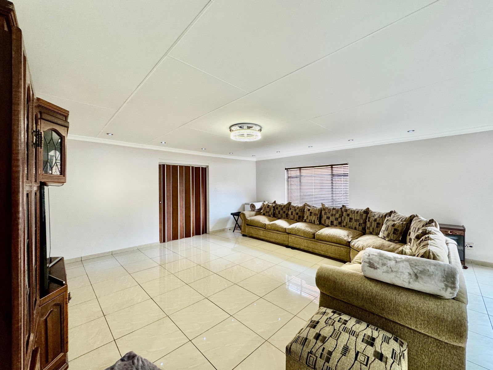 Step into a bright and inviting atmosphere with two large open-plan living areas, tiled throughout and beautifully lit with sleek downlights. The heart of the home is the modern kitchen, designed for social living, with solid wooden cupboards, loads of counter space, two eye-level ovens, a 5-plate gas hob, and a prepping basin – perfect for cooking up a storm! A scullery and large laundry room add everyday convenience and functionality.