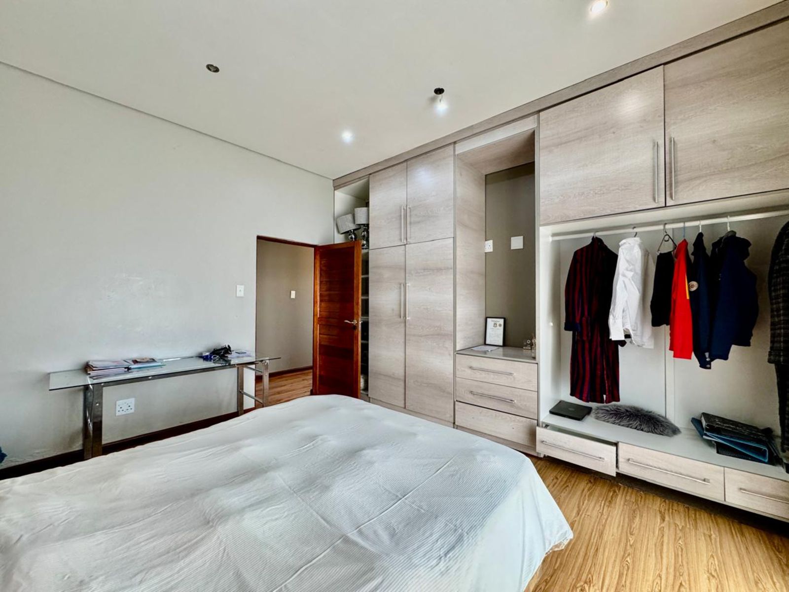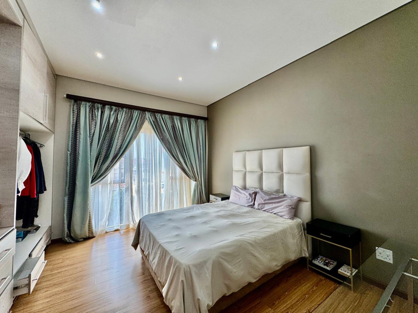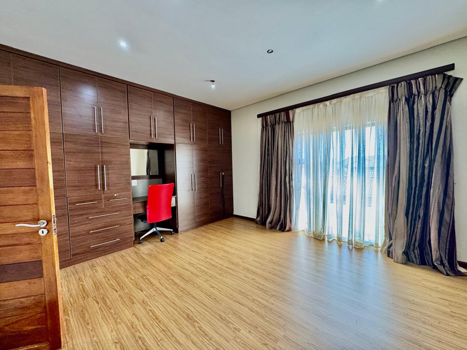 Upstairs, four luxurious bedrooms await — each with built-in cupboards and modern finishes. The main bedroom feels like a high-end hotel suite, complete with a private dressing area, balcony access, and a spa-style ensuite bathroom.