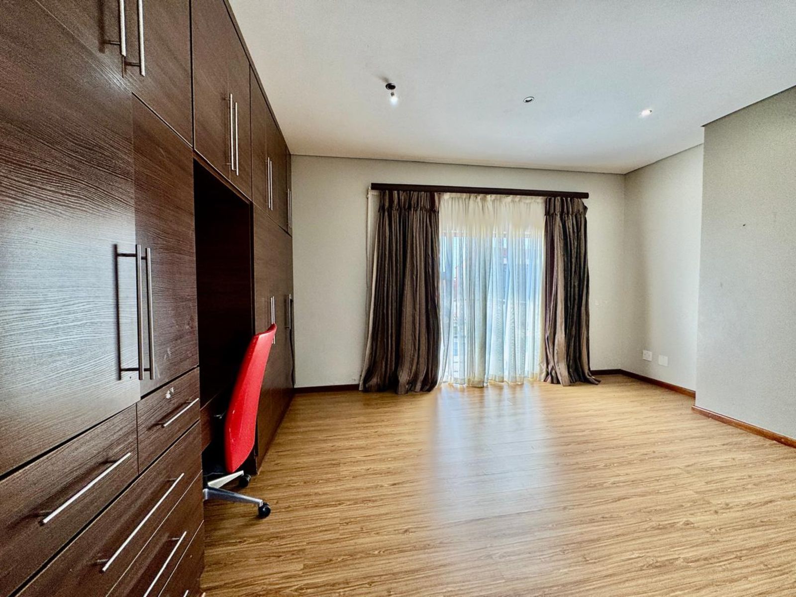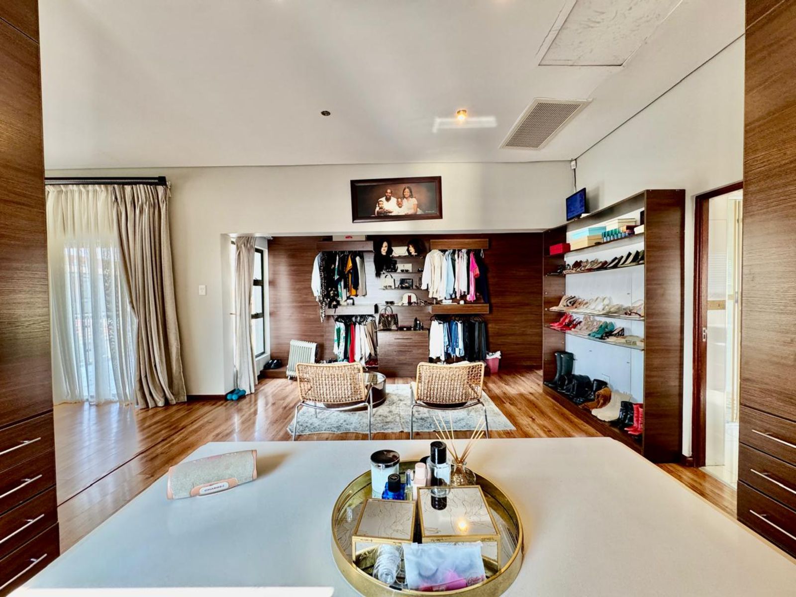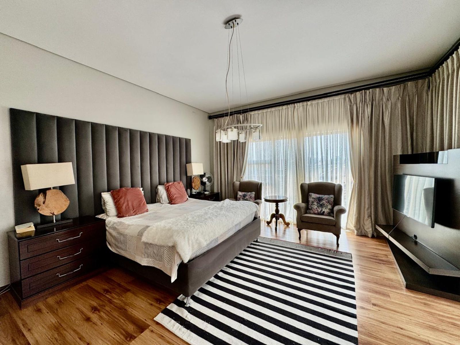 Upstairs, four luxurious bedrooms await — each with built-in cupboards and modern finishes. The main bedroom feels like a high-end hotel suite, complete with a private dressing area, balcony access, and a spa-style ensuite bathroom.