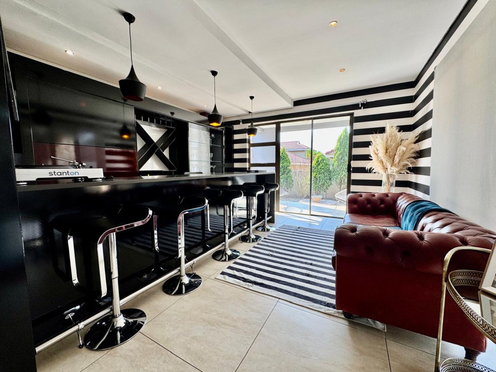 The main lounge and dining area share a designer fireplace — perfect for winter nights — while stacking doors open to a private entertainment patio with a built-in braai overlooking a sparkling pool. It’s a homemade treat to impress.