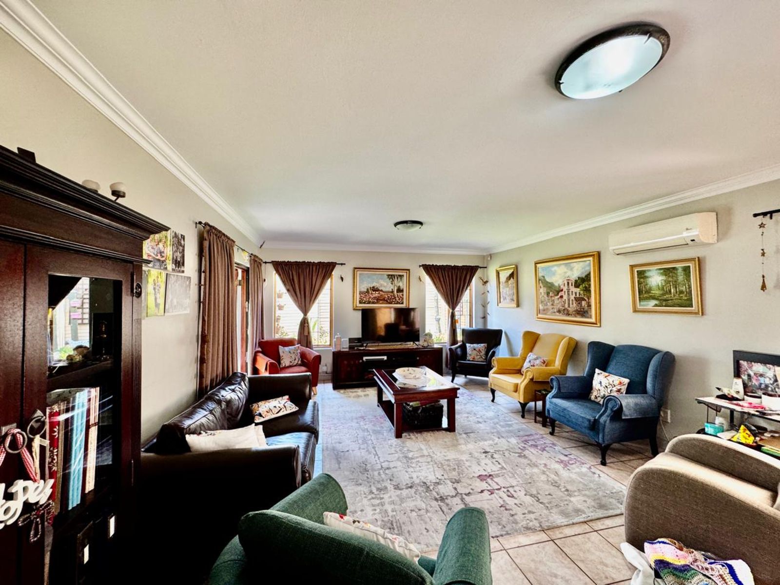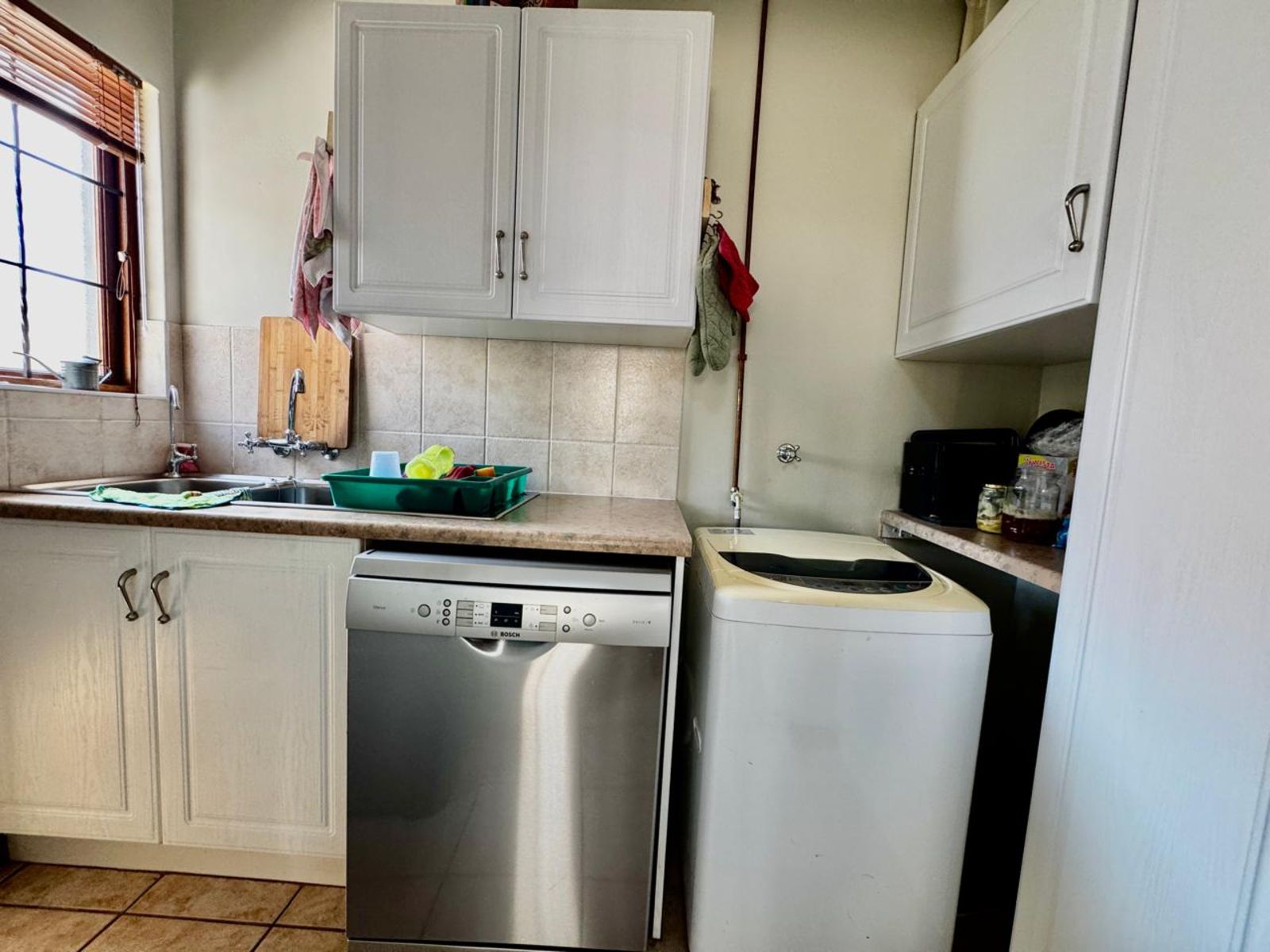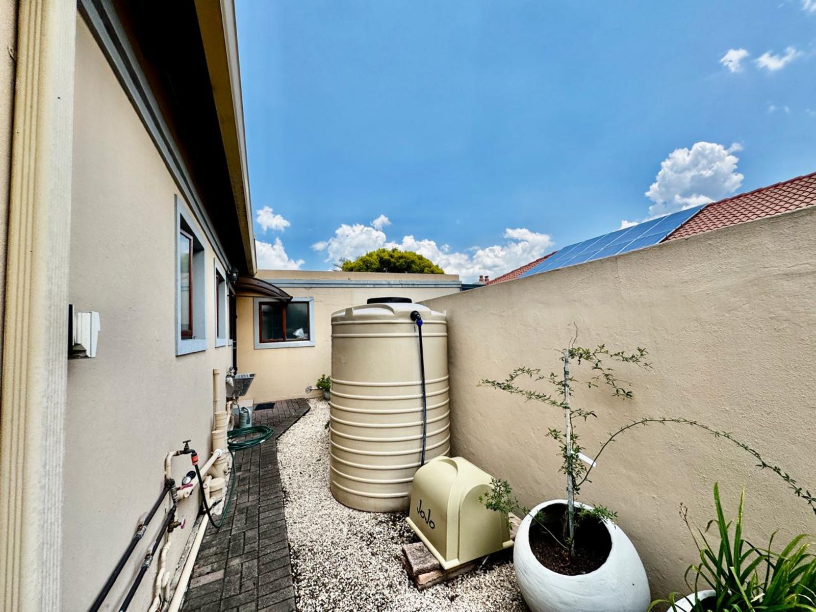 Practical extras elevate the lifestyle on offer: a neatly tiled double garage with built-in cupboards for additional storage, an inverter system with backup battery for uninterrupted power, and a JoJo tank for added water security.