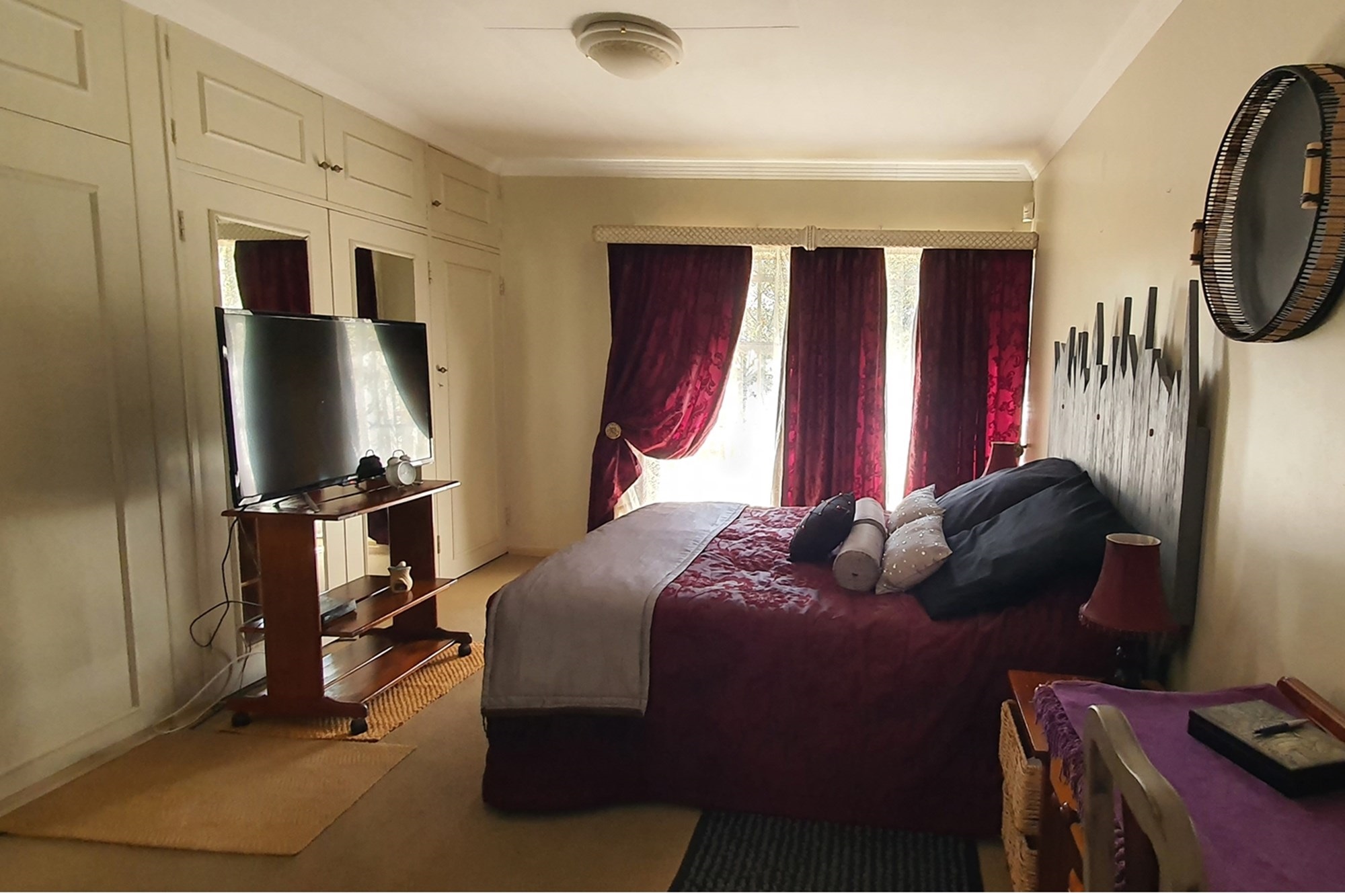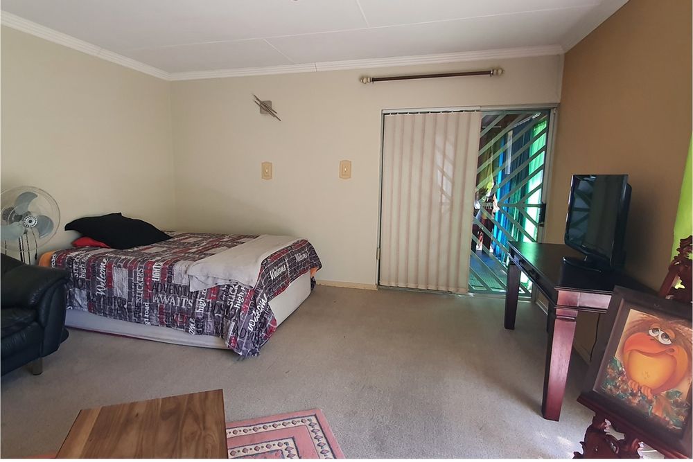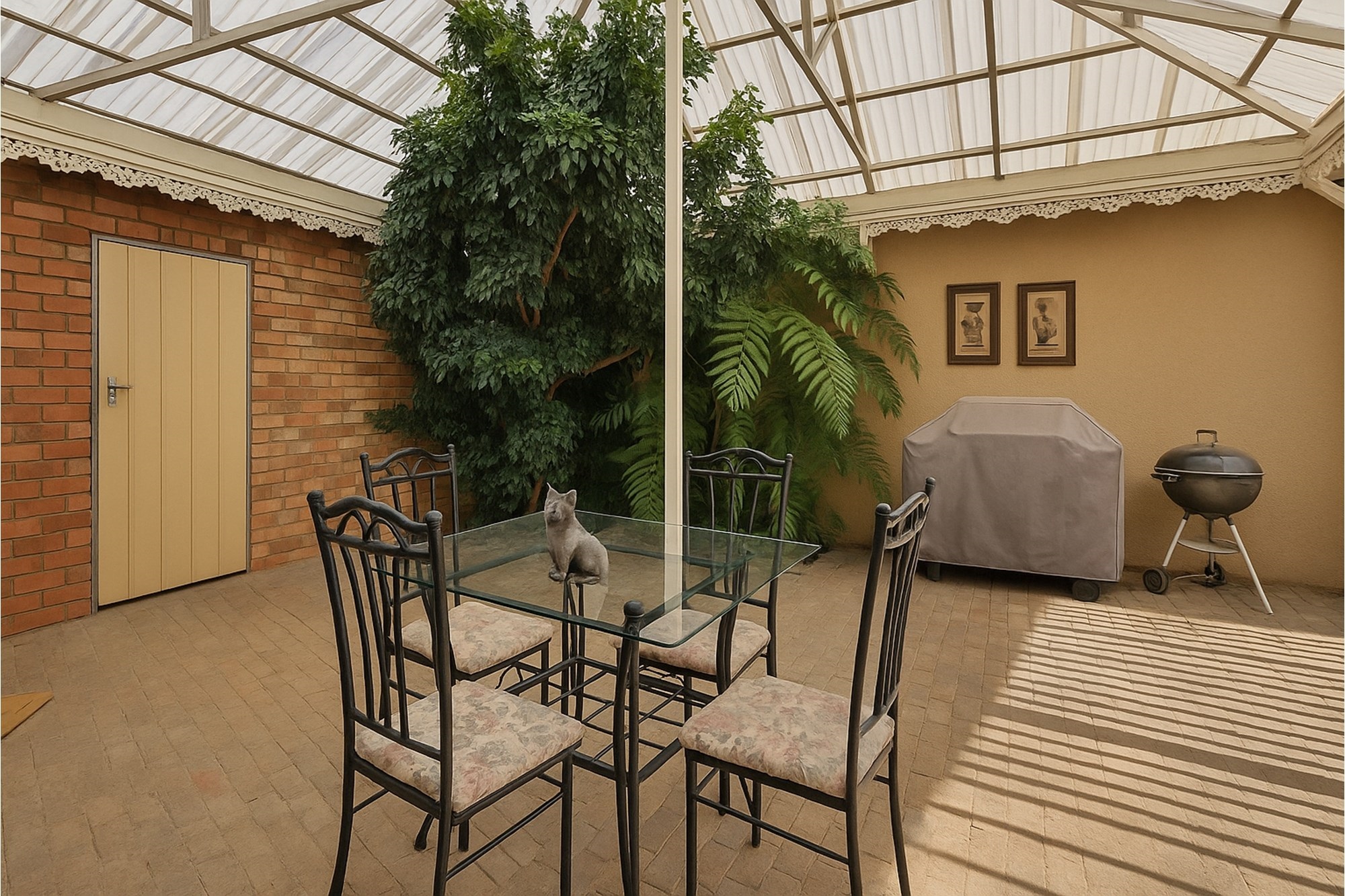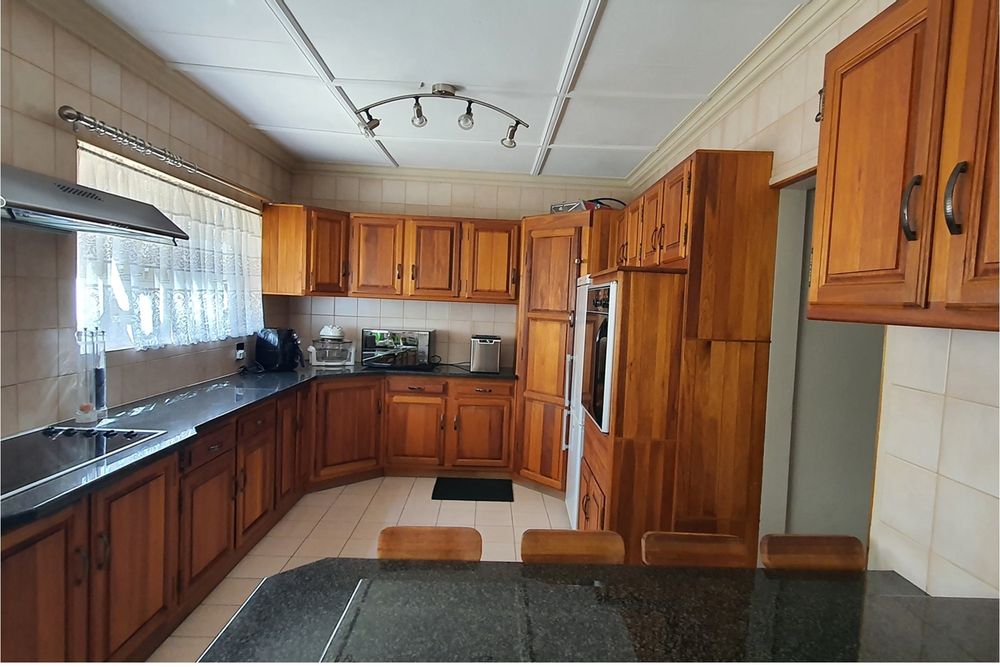 The main house features four spacious bedrooms, all with built-in cupboards, including a master suite complete with an en-suite bathroom. A second full bathroom is located off the hallway, which also offers ample built-in storage. The living spaces are thoughtfully arranged to balance comfort and sophistication, comprising a cosy lounge, a refined dining room, and a welcoming family room that opens to a covered patio—perfect for relaxed gatherings. The kitchen is a standout, beautifully appointed with solid Saligna wood cabinetry, granite countertops, an eye-level oven, and a sleek electric glass-top hob. A separate laundry room adds practicality to this well-designed space. Outside, the property offers a large, manicured lawn, a Wendy house, and a covered entertainment area, ideal for hosting family and friends. Four garages, each with independent access, provide secure and ample parking.