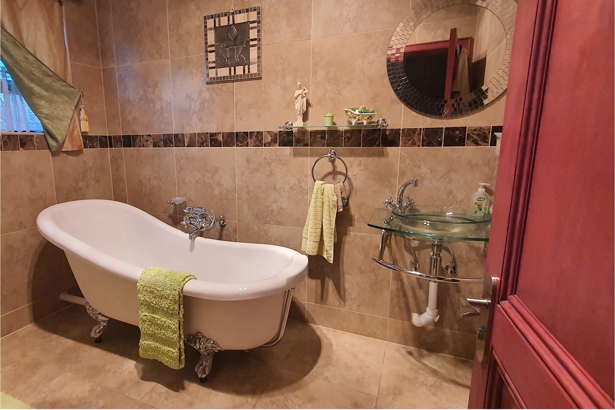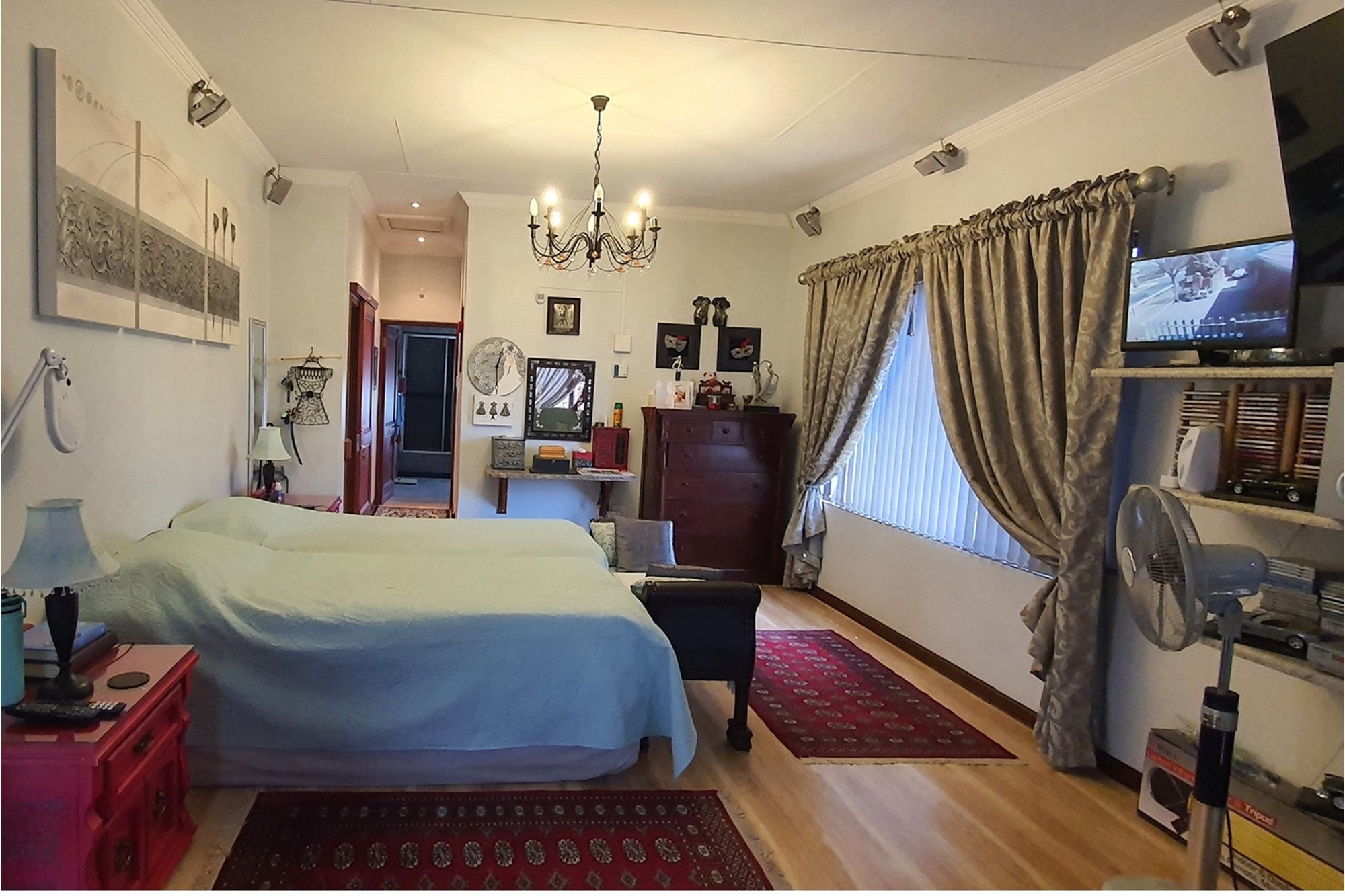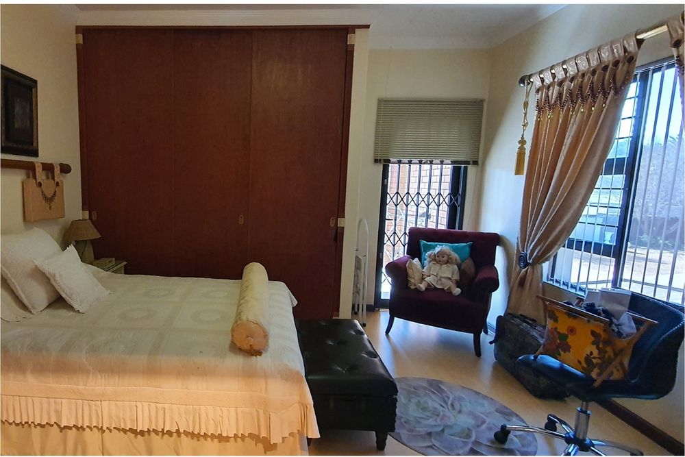 The main house features four spacious bedrooms, all with built-in cupboards, including a master suite complete with an en-suite bathroom. A second full bathroom is located off the hallway, which also offers ample built-in storage. The living spaces are thoughtfully arranged to balance comfort and sophistication, comprising a cosy lounge, a refined dining room, and a welcoming family room that opens to a covered patio—perfect for relaxed gatherings. The kitchen is a standout, beautifully appointed with solid Saligna wood cabinetry, granite countertops, an eye-level oven, and a sleek electric glass-top hob. A separate laundry room adds practicality to this well-designed space. Outside, the property offers a large, manicured lawn, a Wendy house, and a covered entertainment area, ideal for hosting family and friends. Four garages, each with independent access, provide secure and ample parking.