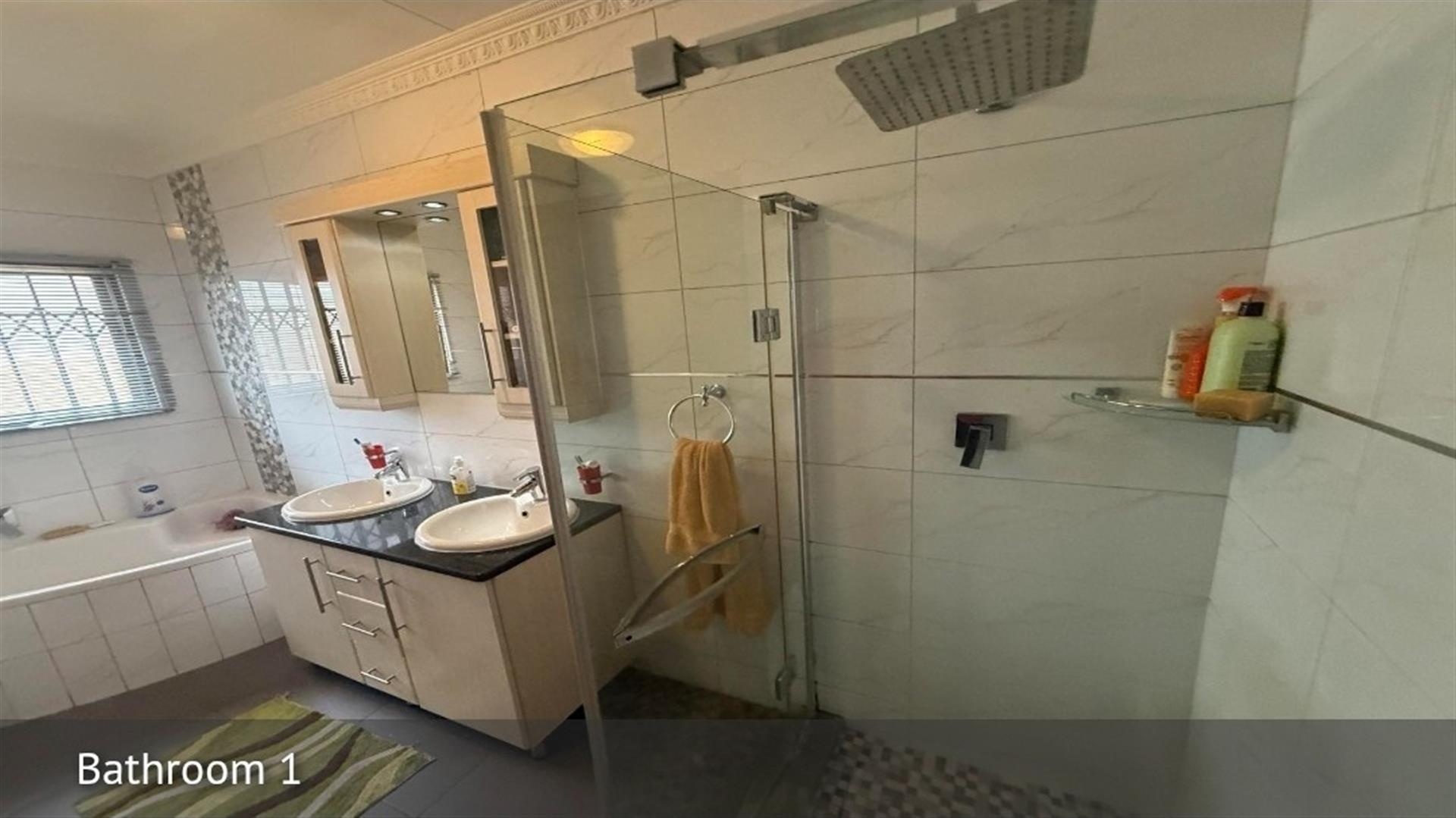 The house features three spacious bedrooms, all neatly tiled and designed for comfortable living. The modern bathroom is well-appointed with a shower, bathtub, and double basins, ideal for family convenience.
