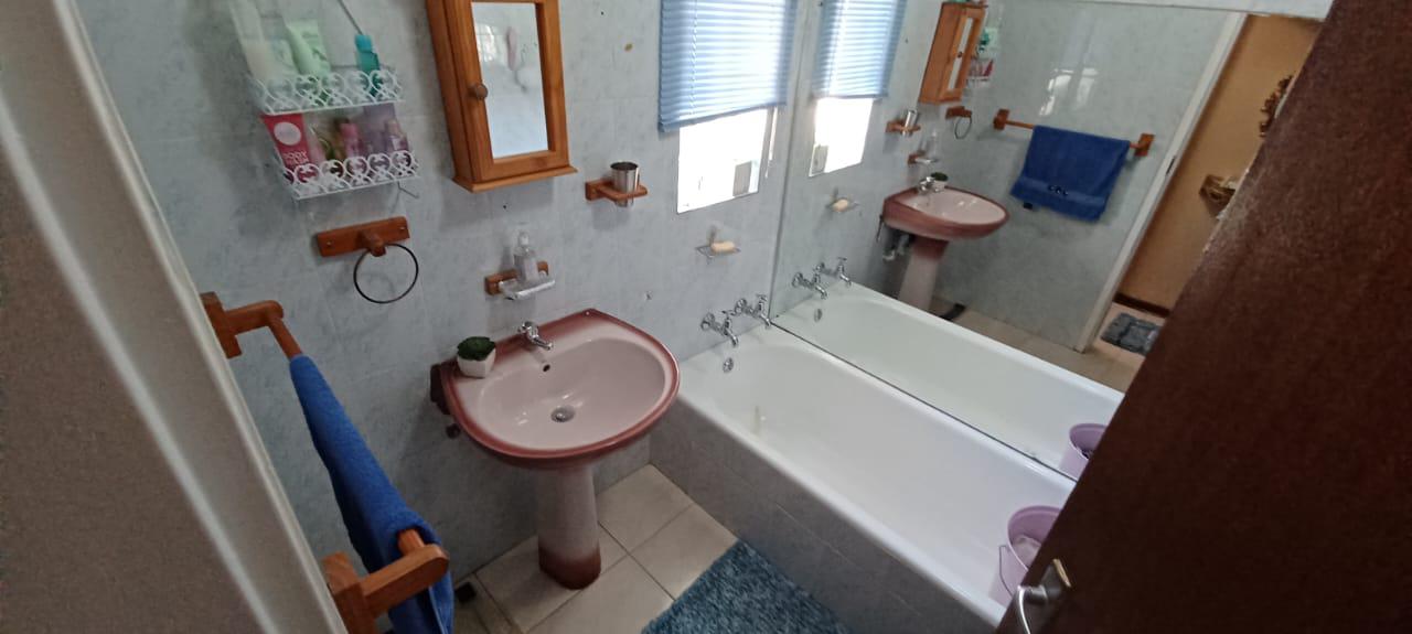 Both bathrooms are tiled. The en-suite bathroom has a shower, a modern glass basin and toilet. The guest bathroom has a bath and basin with separate toilet.