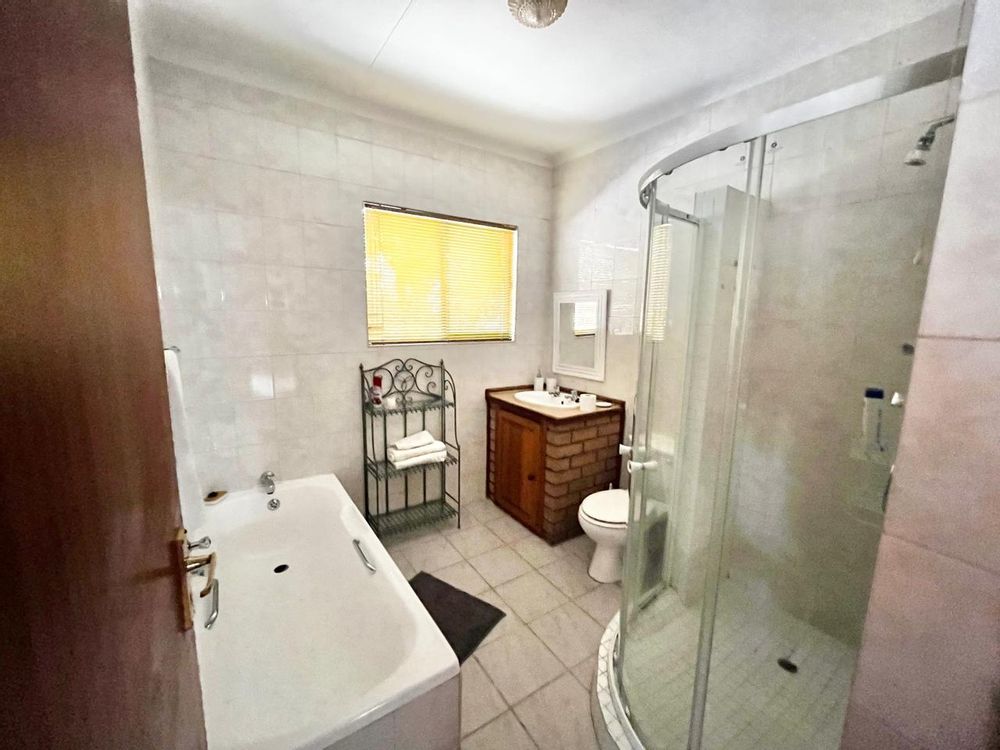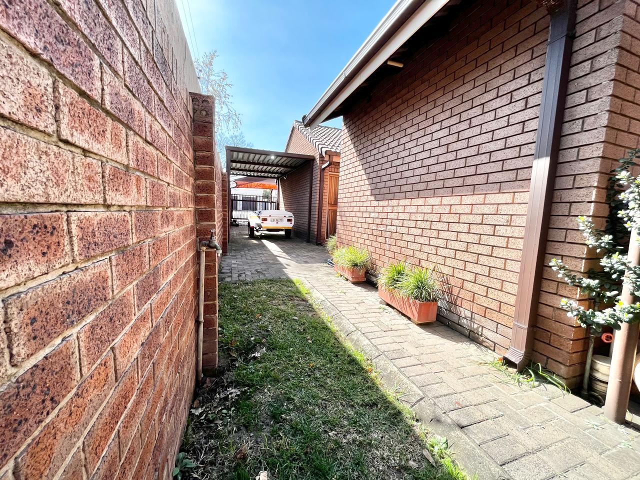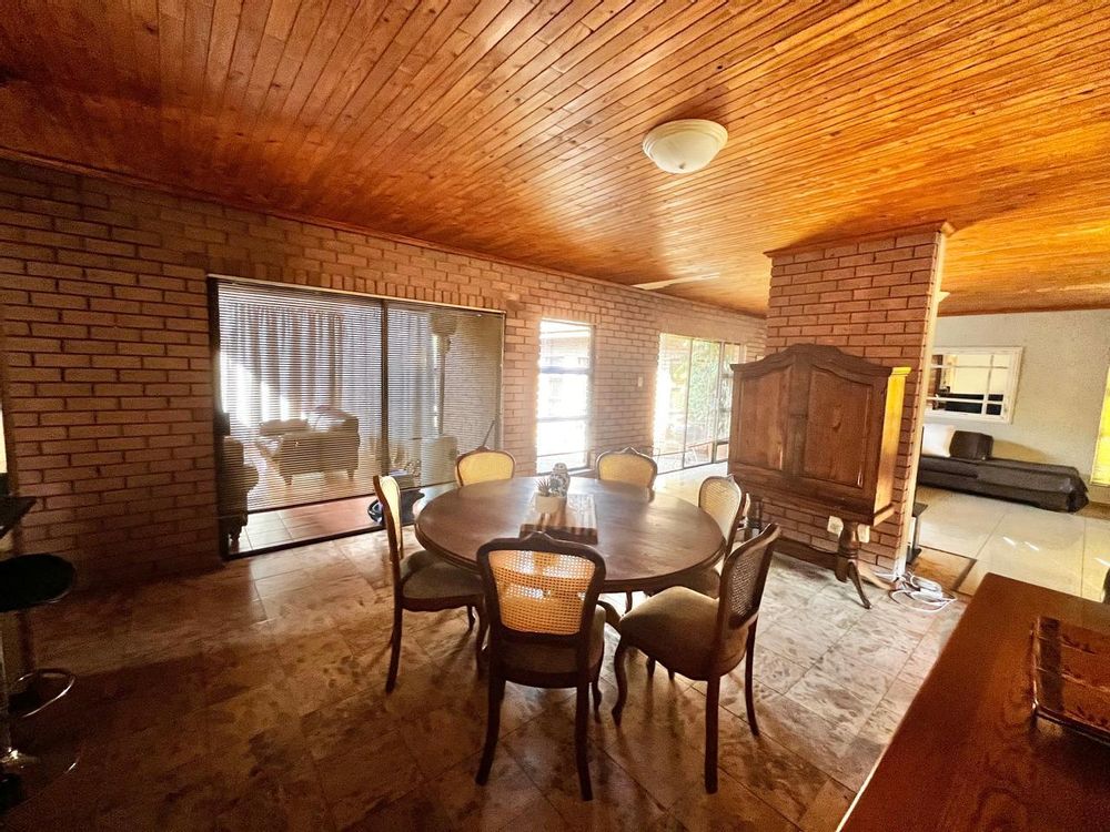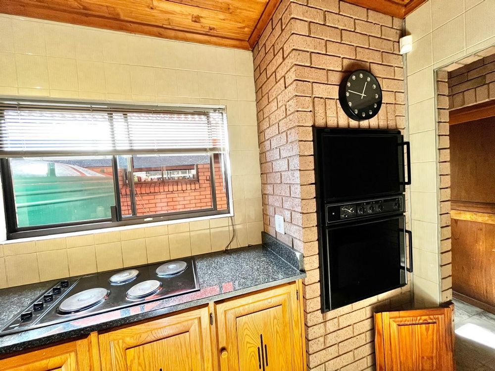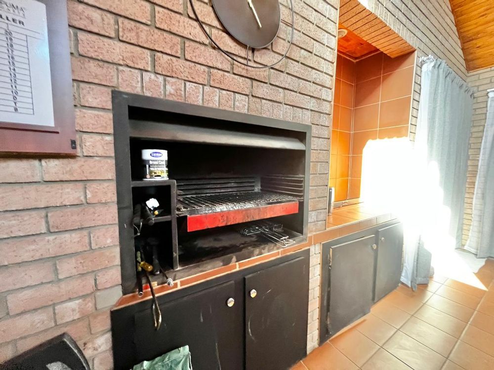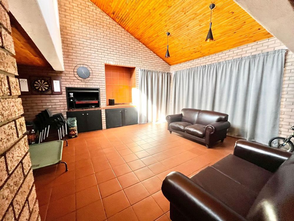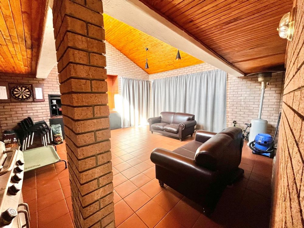 Upon entering this well-kept family home, you enter a large entrance hall that leads to three living areas, two full bathrooms, a kitchen with oak wood cabinets and marble tiles, an entertainment area with a built-in braai that is ideal for the winter, two garages with double carports, and a well-kept garden, this lovely, spacious, one-of-a-kind home is conveniently located near shopping centres and schools.