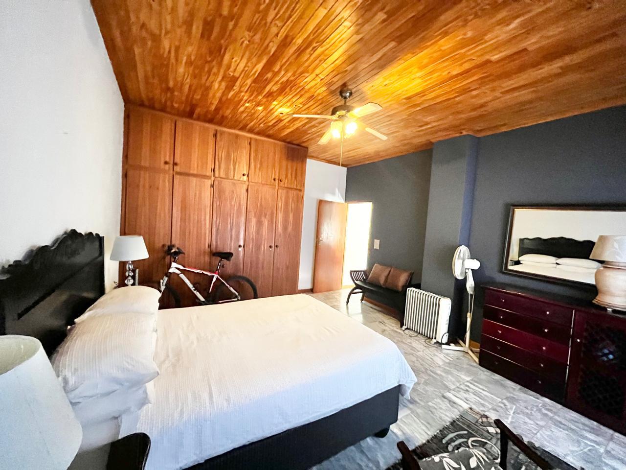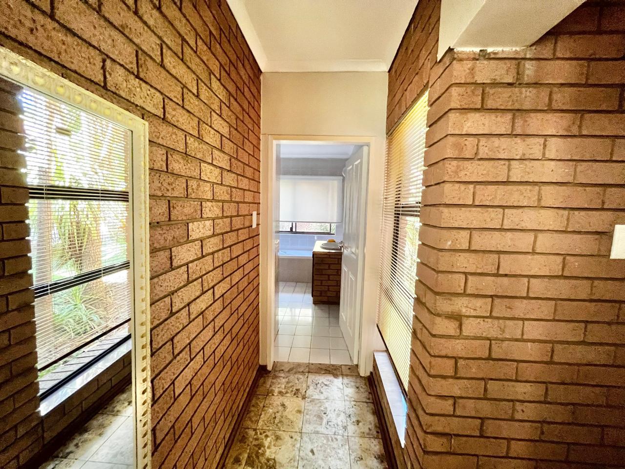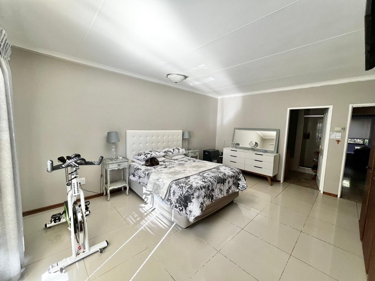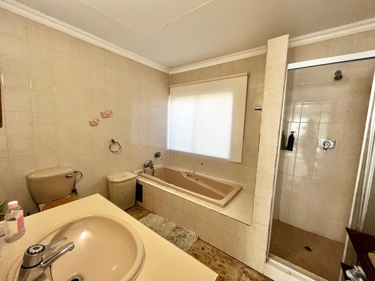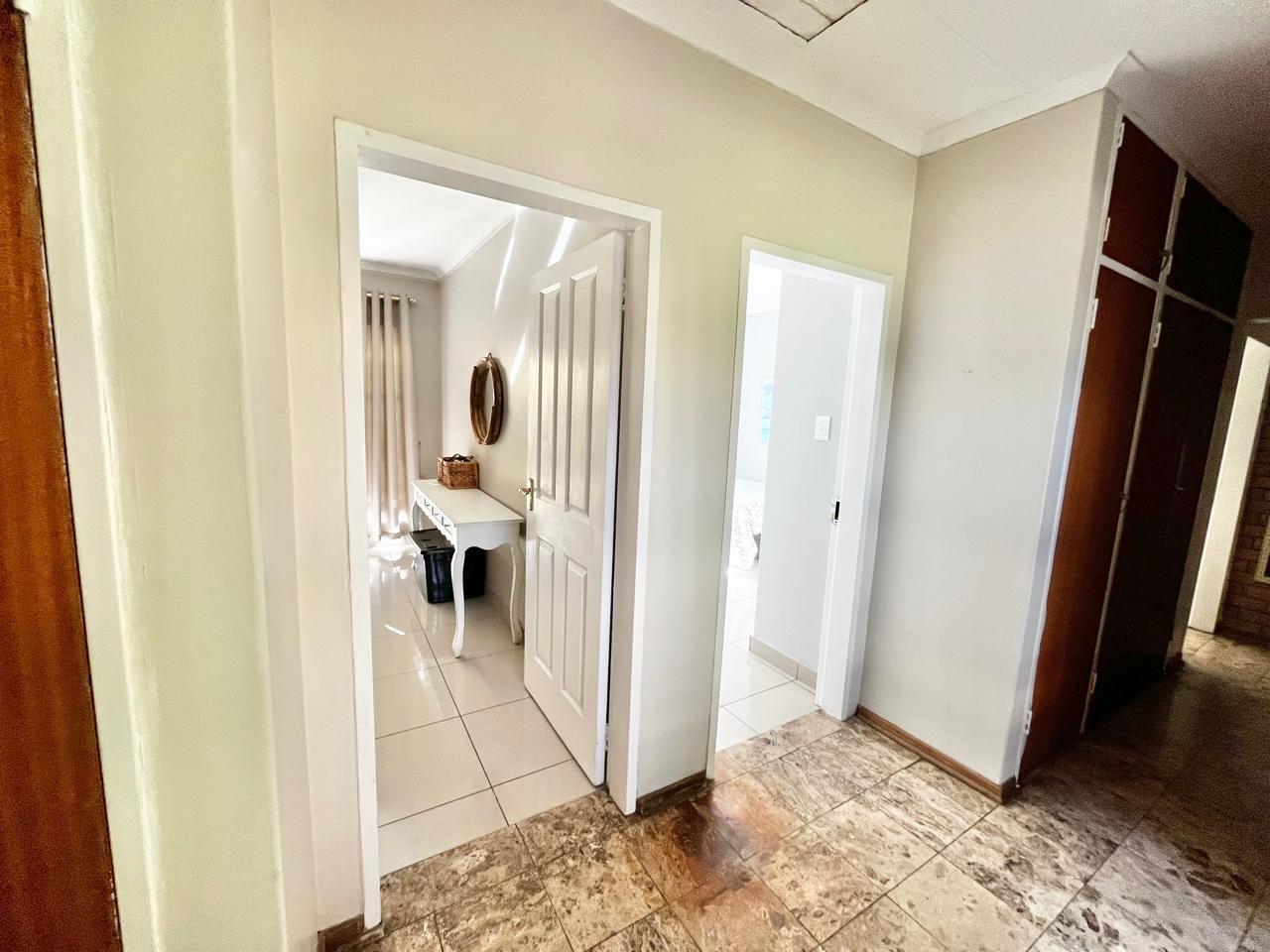 Upon entering this well-kept family home, you enter a large entrance hall that leads to three living areas, two full bathrooms, a kitchen with oak wood cabinets and marble tiles, an entertainment area with a built-in braai that is ideal for the winter, two garages with double carports, and a well-kept garden, this lovely, spacious, one-of-a-kind home is conveniently located near shopping centres and schools.