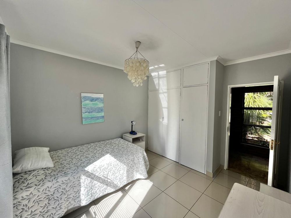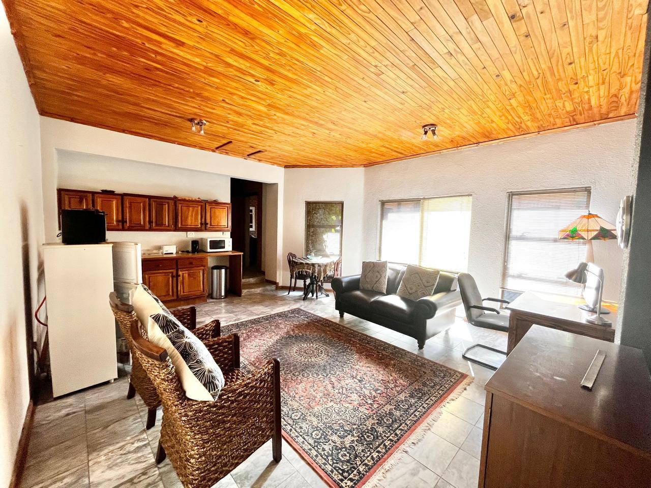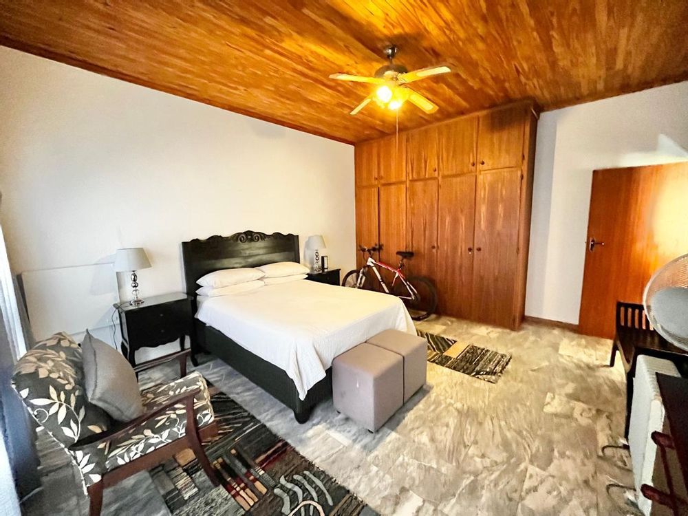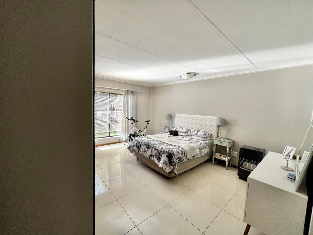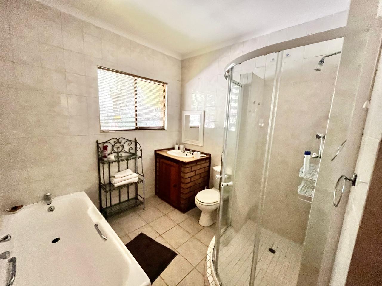 Upon entering this well-kept family home, you enter a large entrance hall that leads to three living areas, two full bathrooms, a kitchen with oak wood cabinets and marble tiles, an entertainment area with a built-in braai that is ideal for the winter, two garages with double carports, and a well-kept garden, this lovely, spacious, one-of-a-kind home is conveniently located near shopping centres and schools.