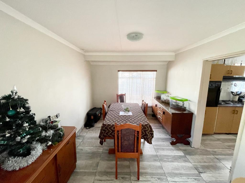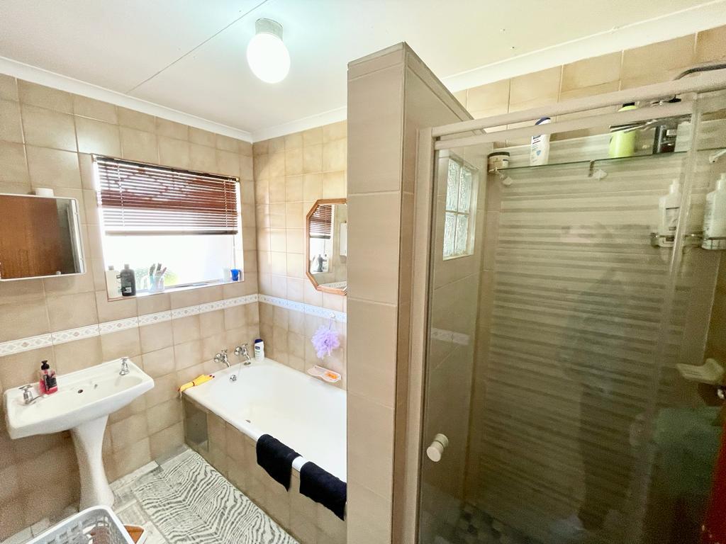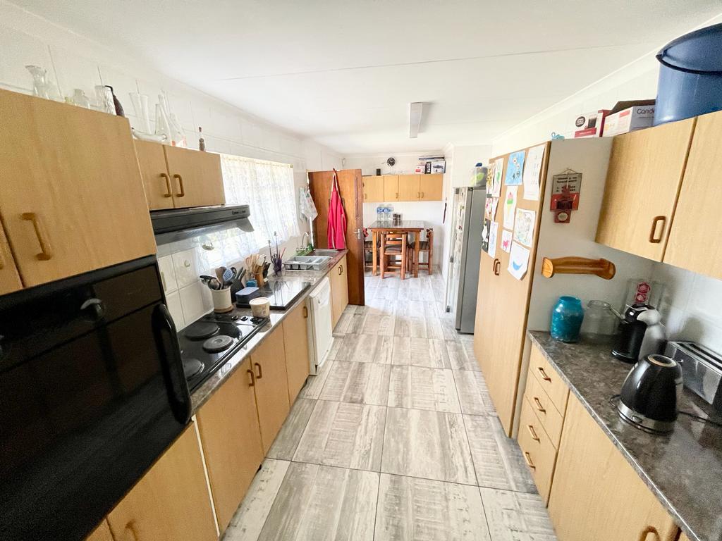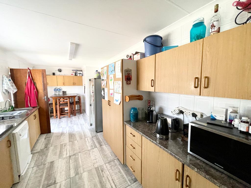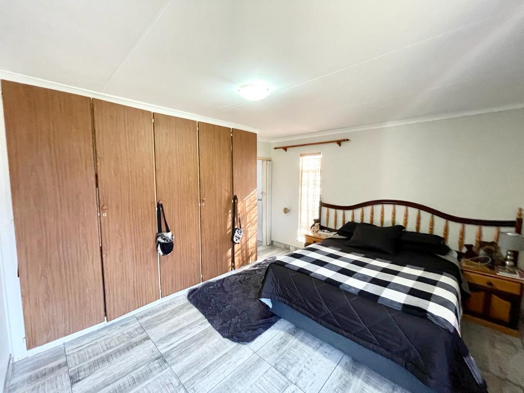 Inside, two separate living areas provide ample space for relaxation and dining, both elegantly tiled for easy maintenance. The kitchen boasts generous dimensions, complete with built-in cupboards, abundant countertop space, and modern amenities including an electric four-plate stove and eye-level oven.