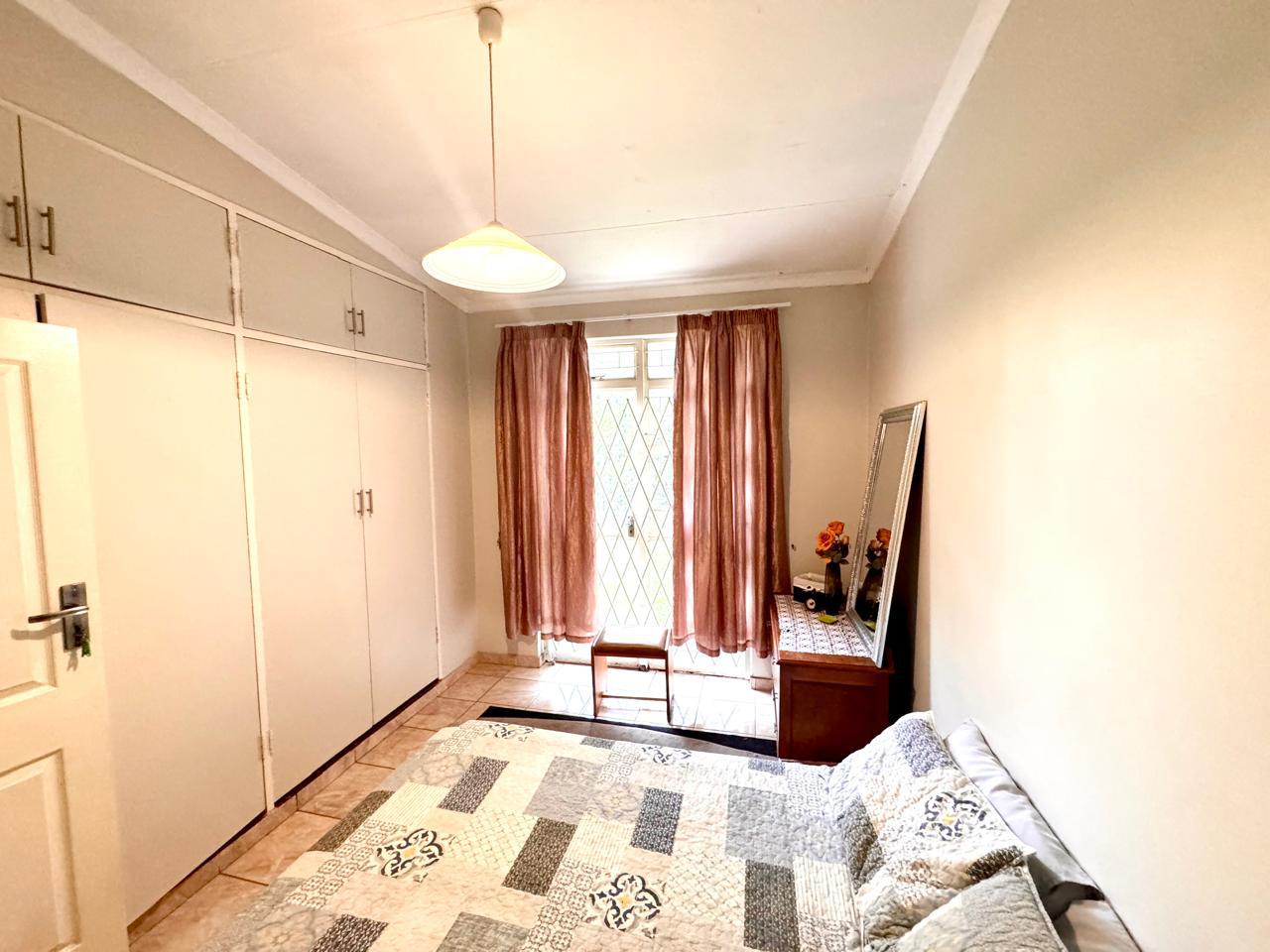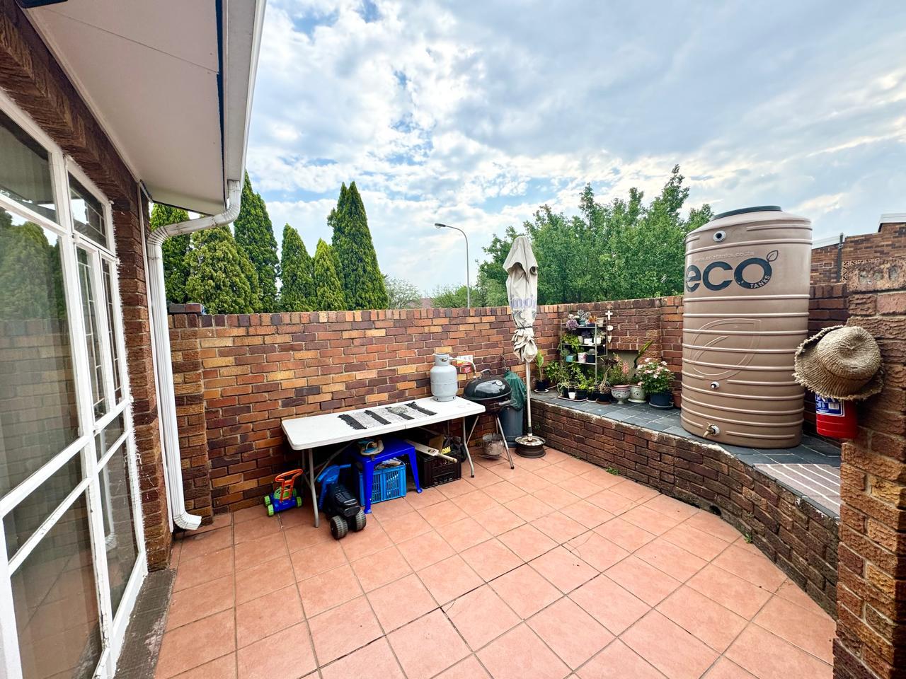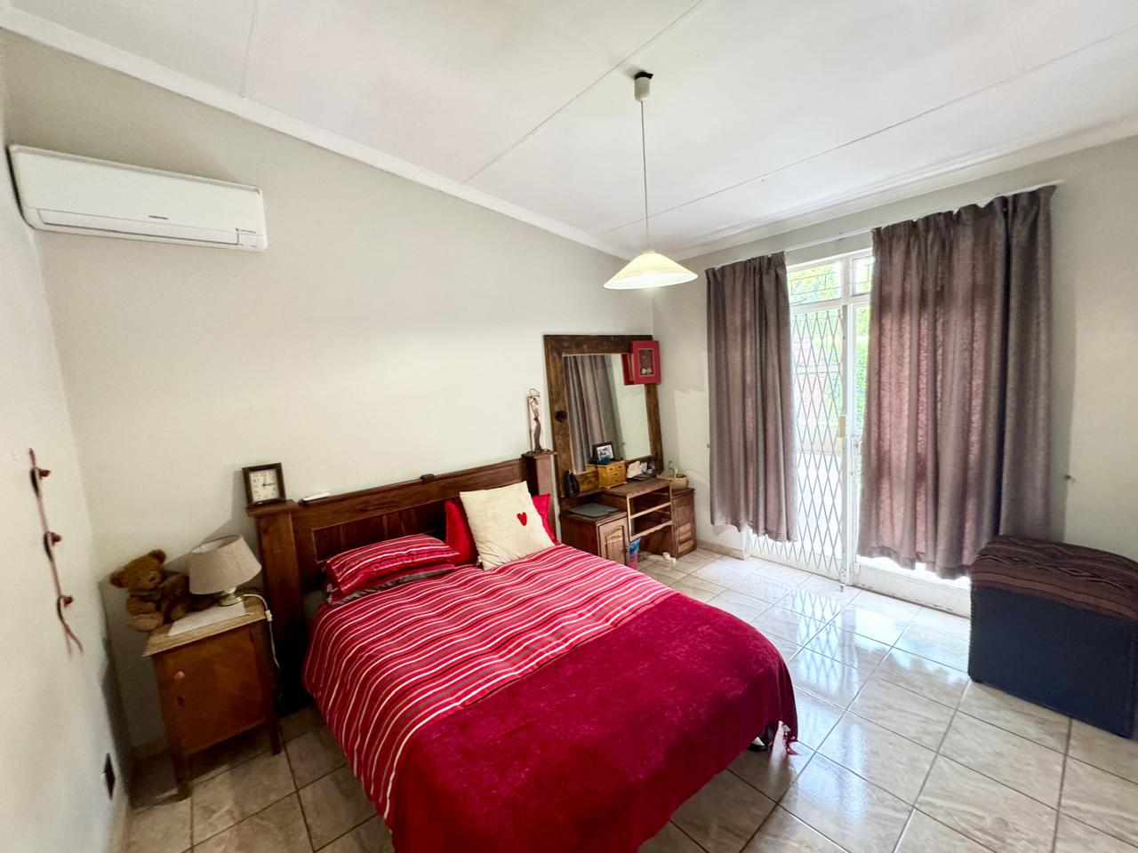There are two generously sized bedrooms, each with built-in cupboards for ample storage. The main bedroom is fitted with air conditioning, ensuring a cool retreat during warmer months. Both bedrooms open onto a private patio area that leads to a charming garden, offering a peaceful space for relaxation or outdoor activities.