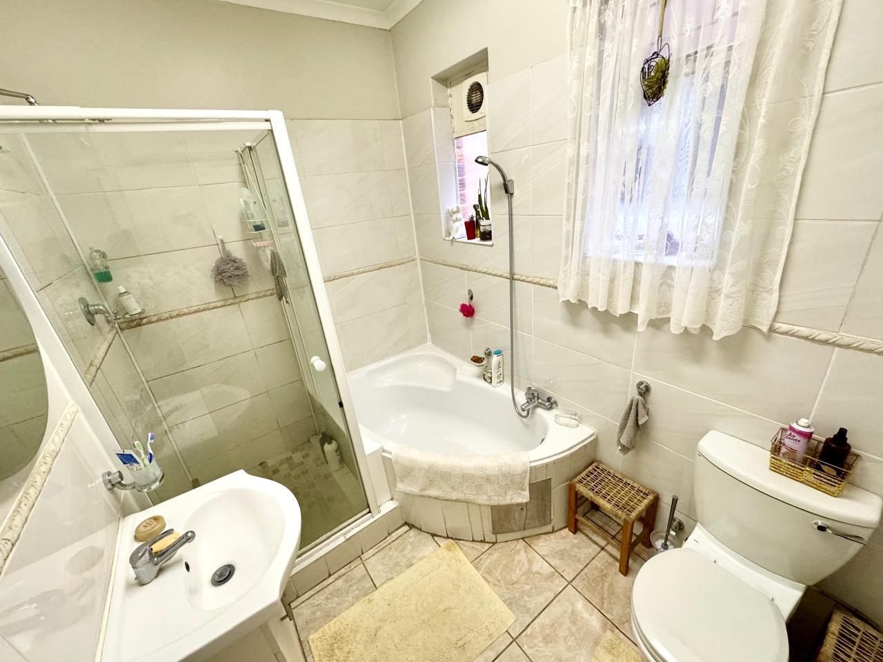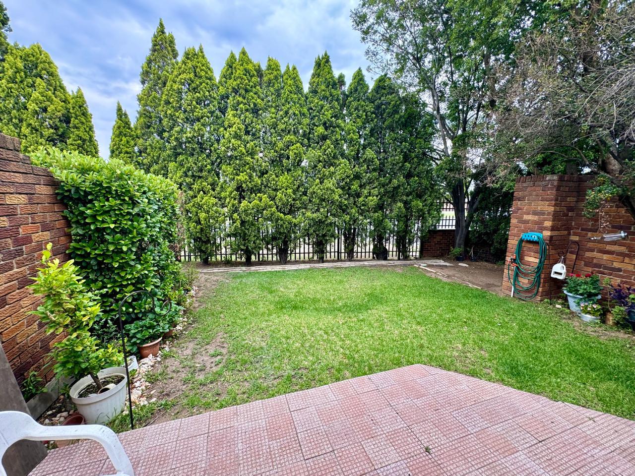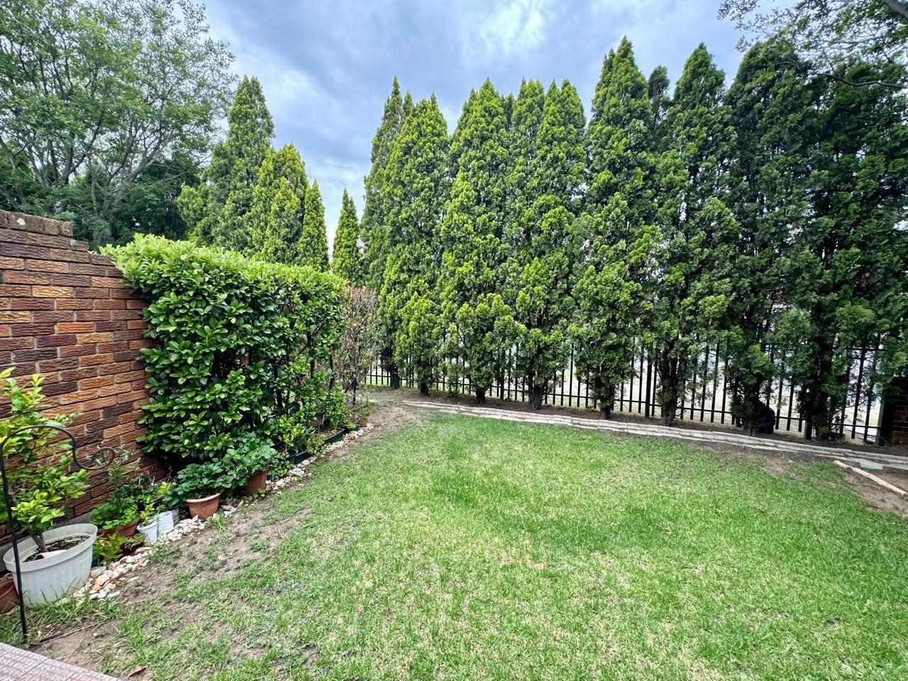 There are two generously sized bedrooms, each with built-in cupboards for ample storage. The main bedroom is fitted with air conditioning, ensuring a cool retreat during warmer months. Both bedrooms open onto a private patio area that leads to a charming garden, offering a peaceful space for relaxation or outdoor activities.