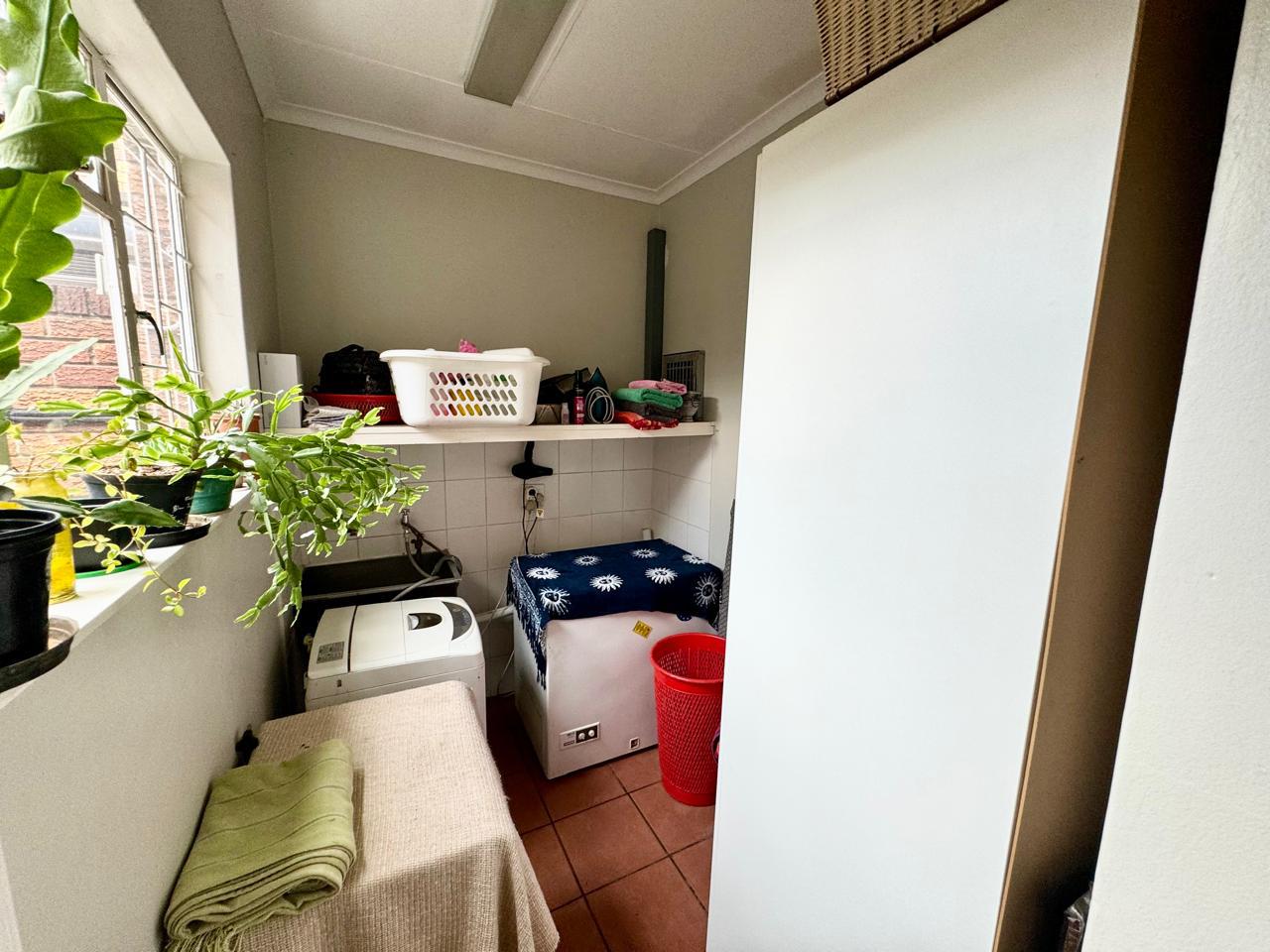 The kitchen is a highlight, boasting modern finishes and practical features. It includes gas hobs, an undercounter oven, an extractor fan, and ample cupboard space, all complemented by full tiling for a sleek and durable finish. Adjacent to the kitchen is a dedicated laundry room, equipped with the necessary connections for a washing machine and additional built-in cupboards for storage.