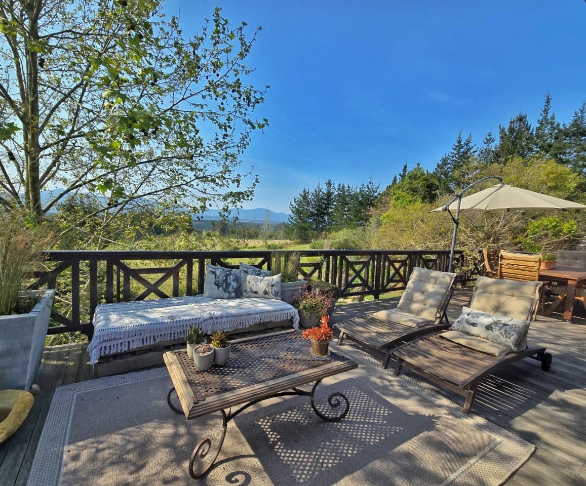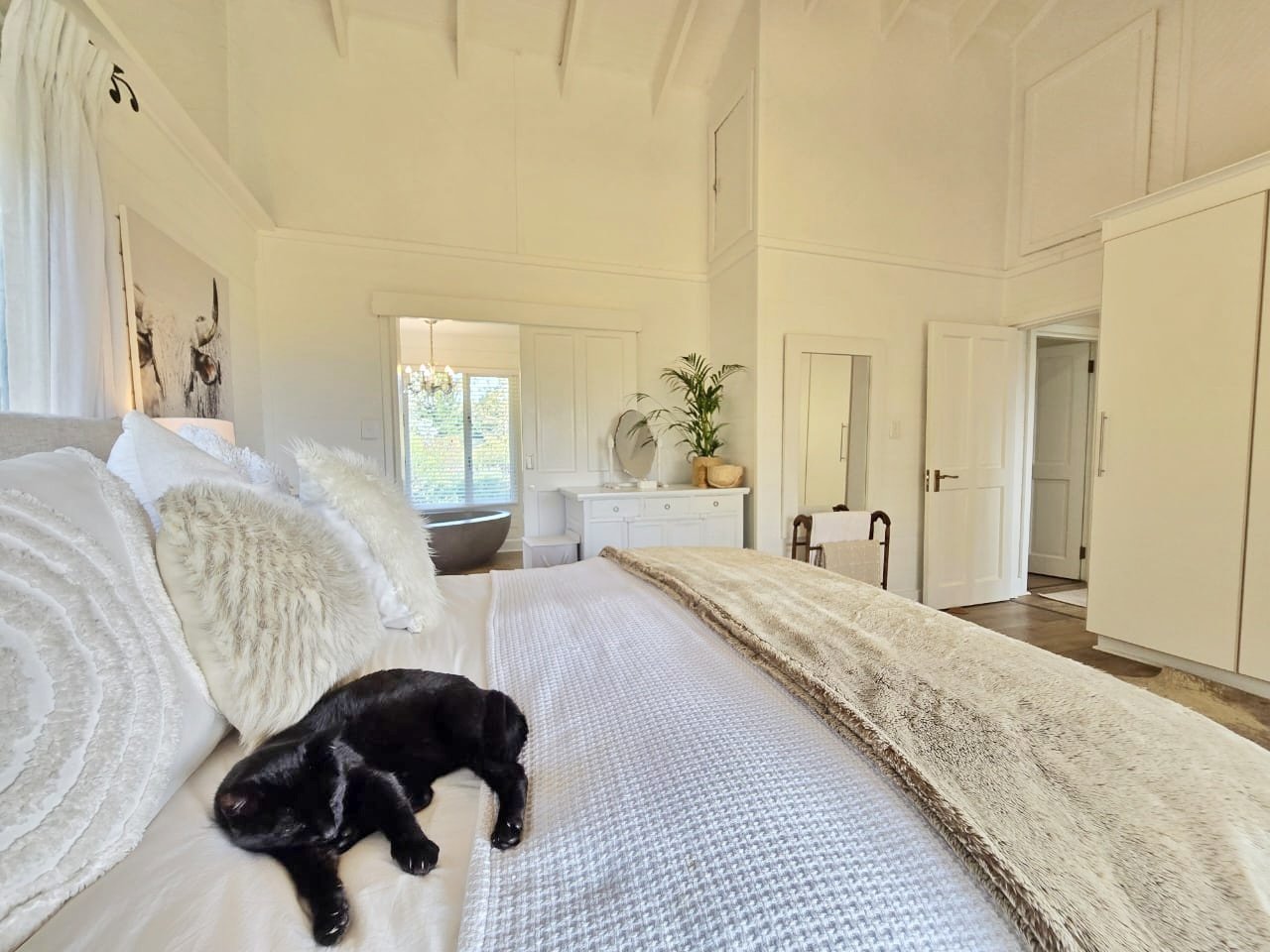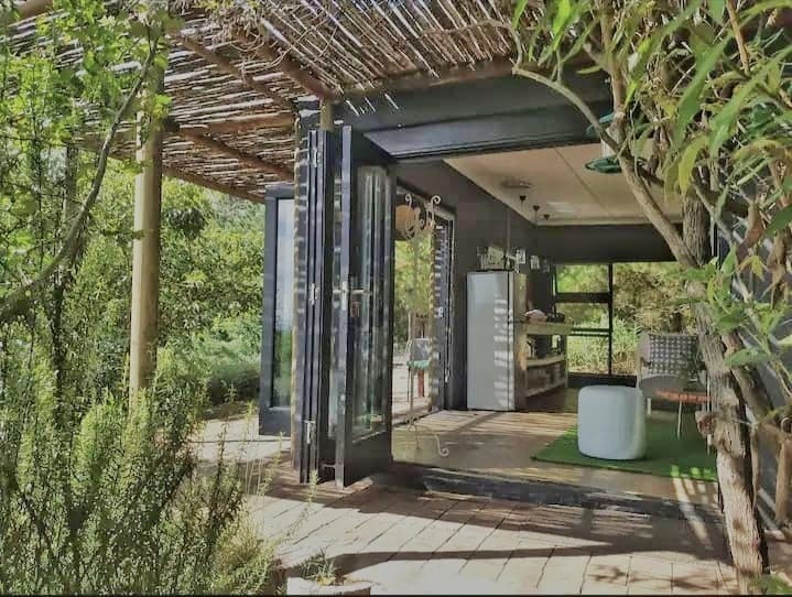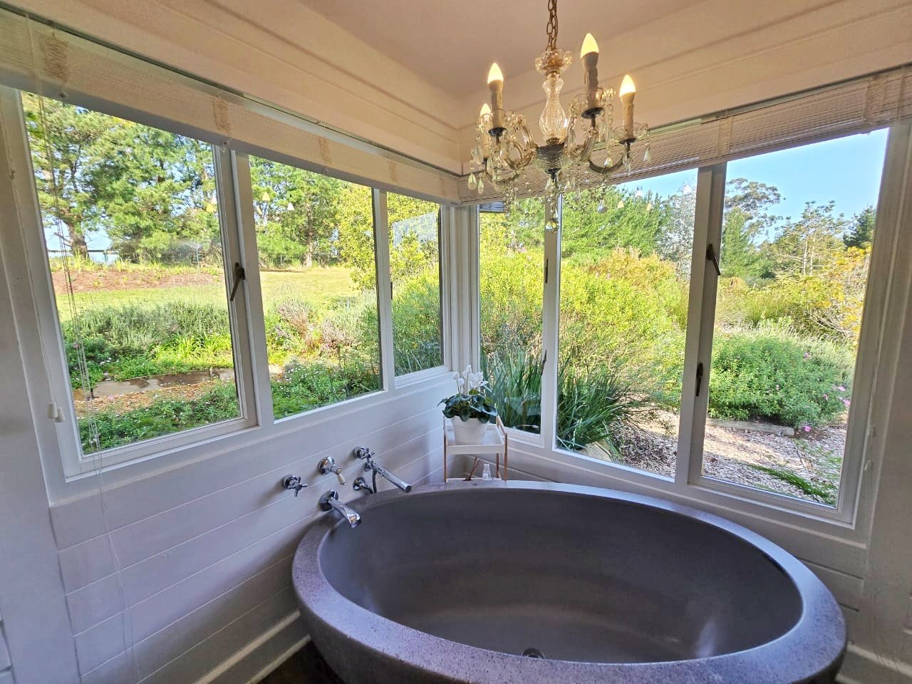 A Private Retreat; the cozy cottage includes an open-plan lounge/bedroom with a kitchenette, complete with wooden countertops, a prep bowl, and a 2-plate gas stove. A closed combustion fireplace ensures it stays warm during the cold winter days and nights. It has a separate bathroom with a shower, basin, and toilet. The outdoor area is fully fenced with private access and parking. Enjoy a peaceful seating area under the trees or on the paved undercover patio that flows out through stack doors from the living areas and has views of the magnificent Outeniqua mountains. The cottage is totally private from the main house and is currently let on Airbnb, which can be continued if one wants to. It has its own generator and separate wi-fi connection.