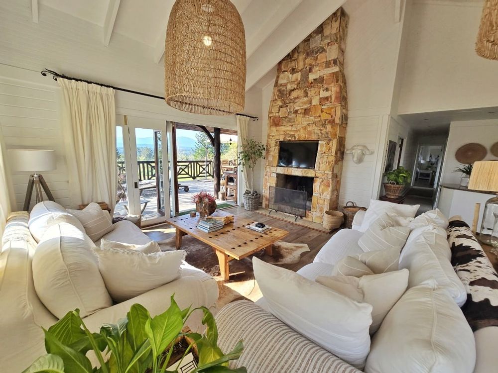 laminate), double volume ceilings, and a stunning stone-built open fireplace. The living area flows effortlessly to the outdoors via