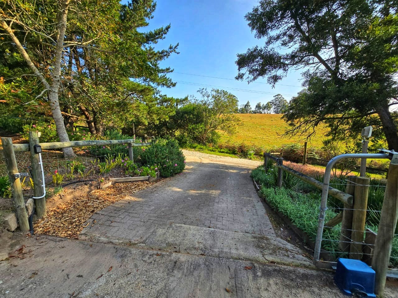 Entrance & Driveway: A paved driveway leads to an automated gate, welcoming you to a stone driveway and parking area by the house.