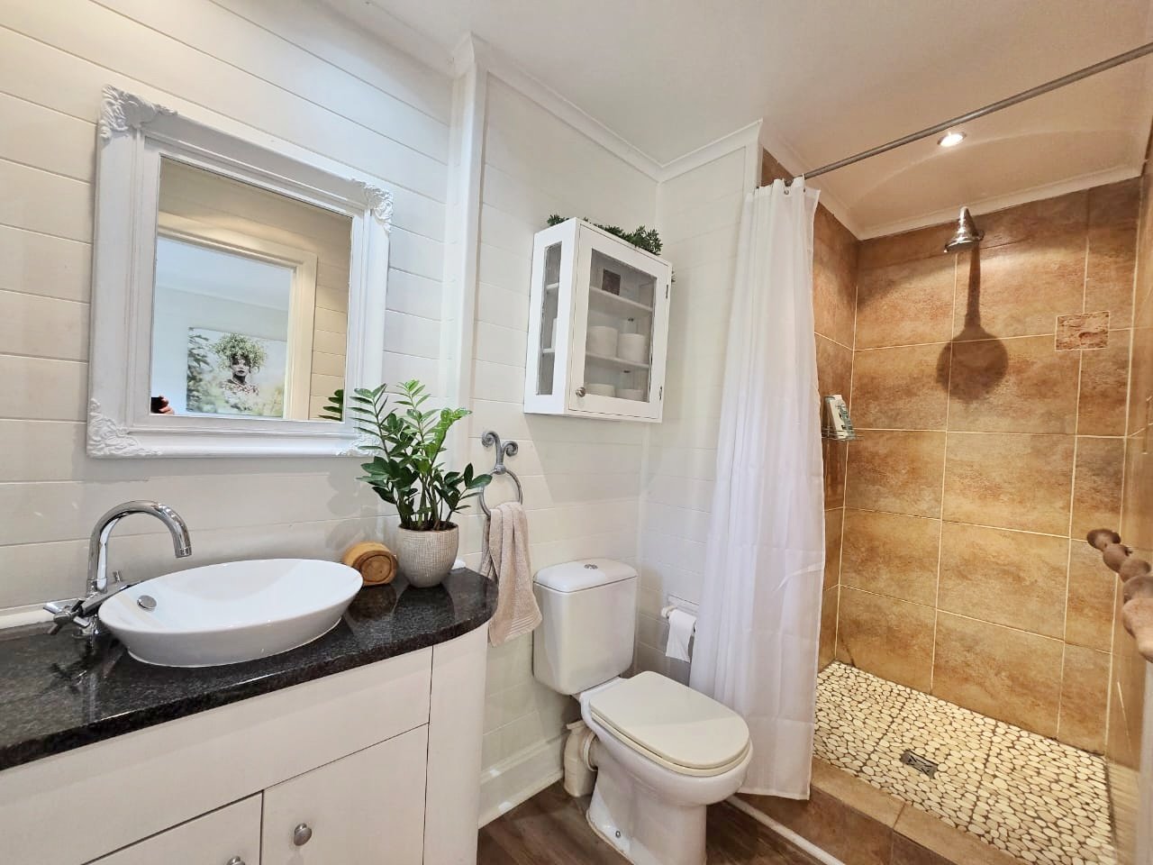 Bathrooms: The guest bathroom features a shower, toilet, basin, and granite countertops.
