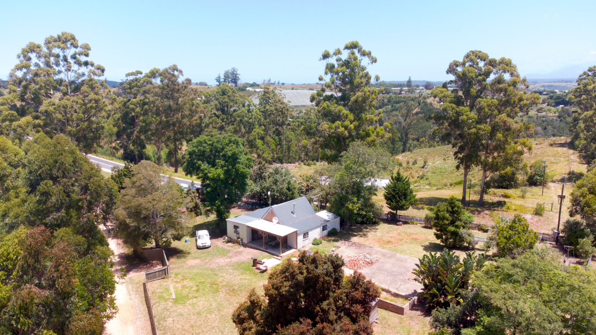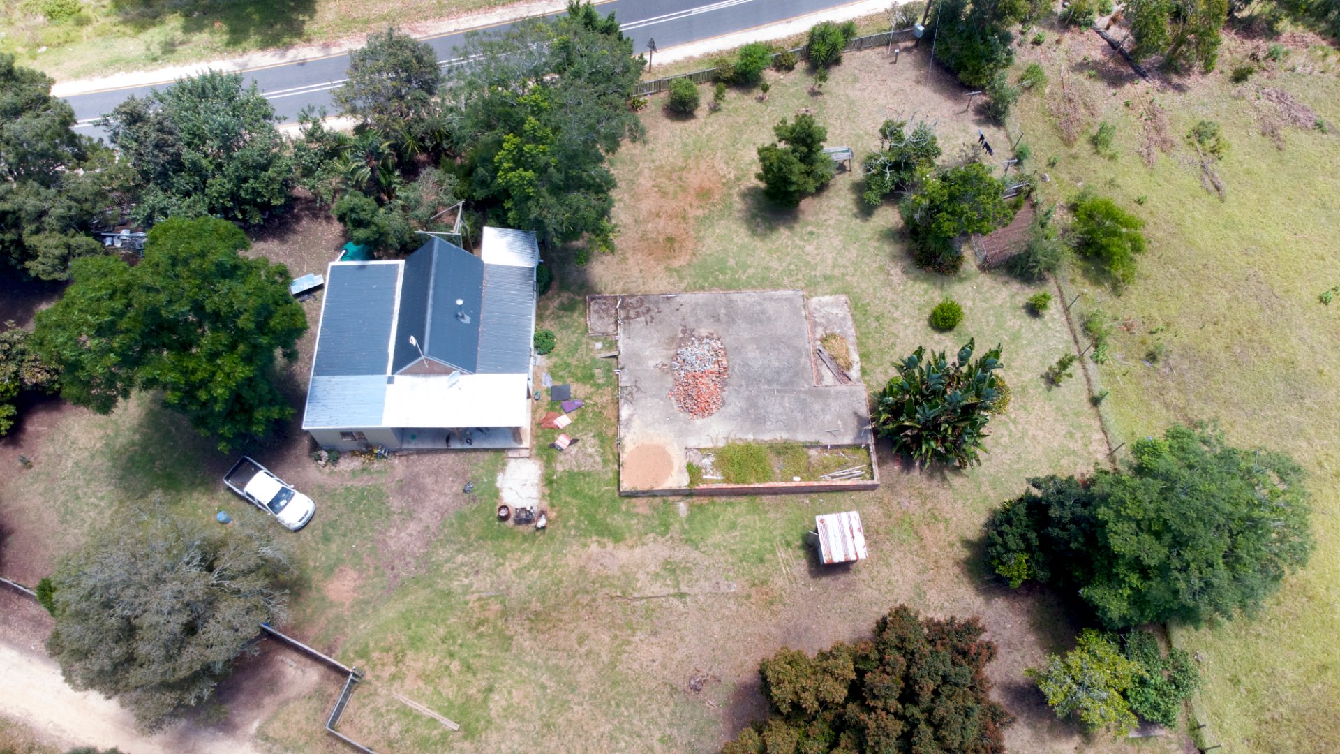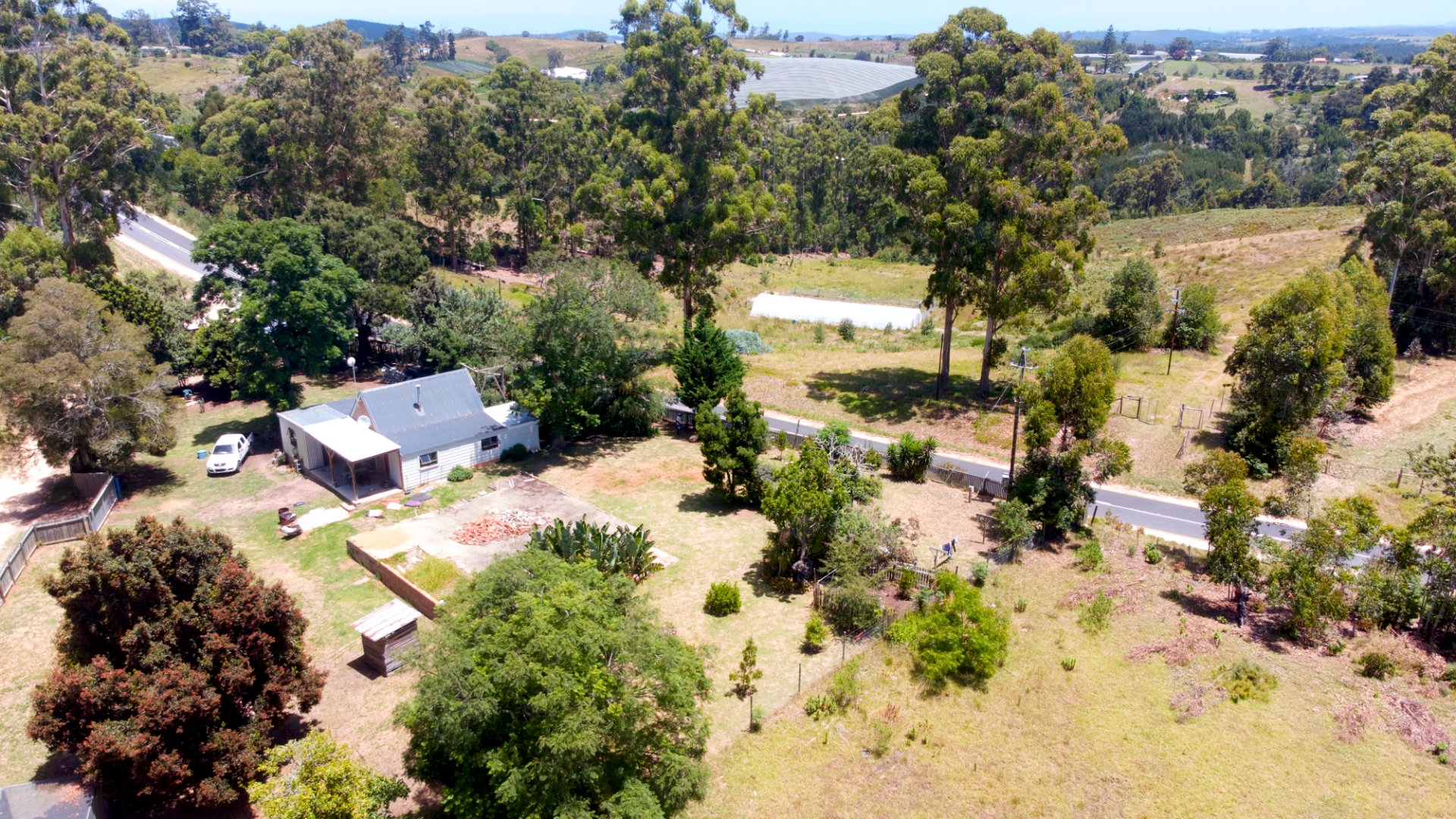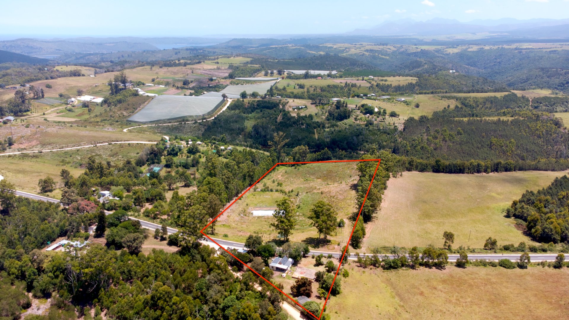 On one side of the road, the triangular section hosts the homestead and improvements. The main house has 2 bedrooms, a bathroom, and an additional room that can serve as a third bedroom, living area, or workspace. The foundation of a former home, lost to fire years ago, still remains—an opportunity to extend or even build a new dwelling, with the Outeniqua Mountains providing a spectacular backdrop.