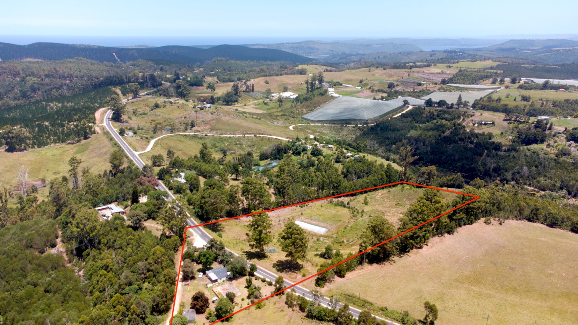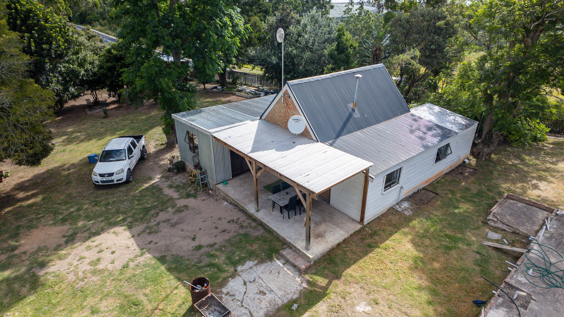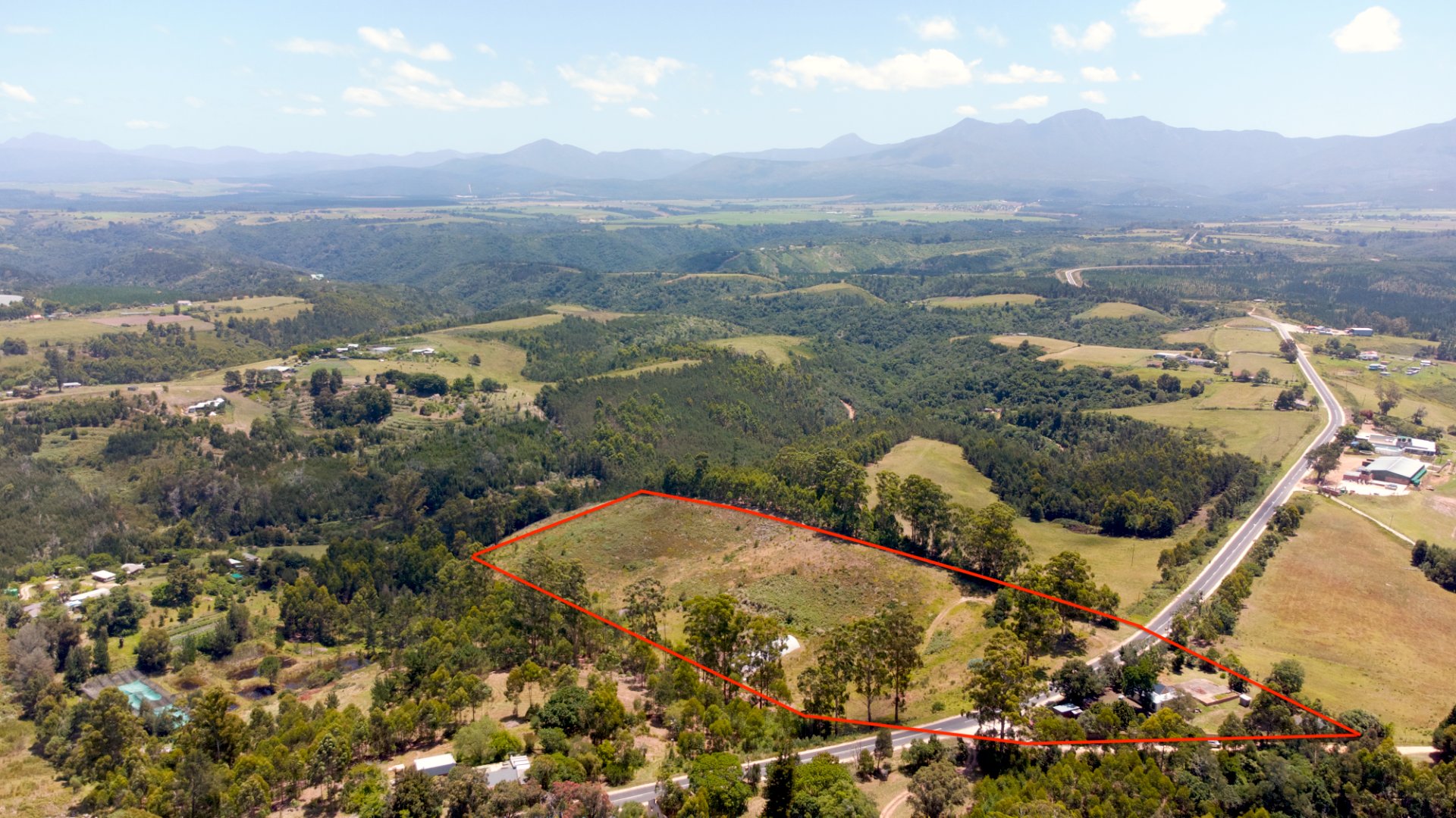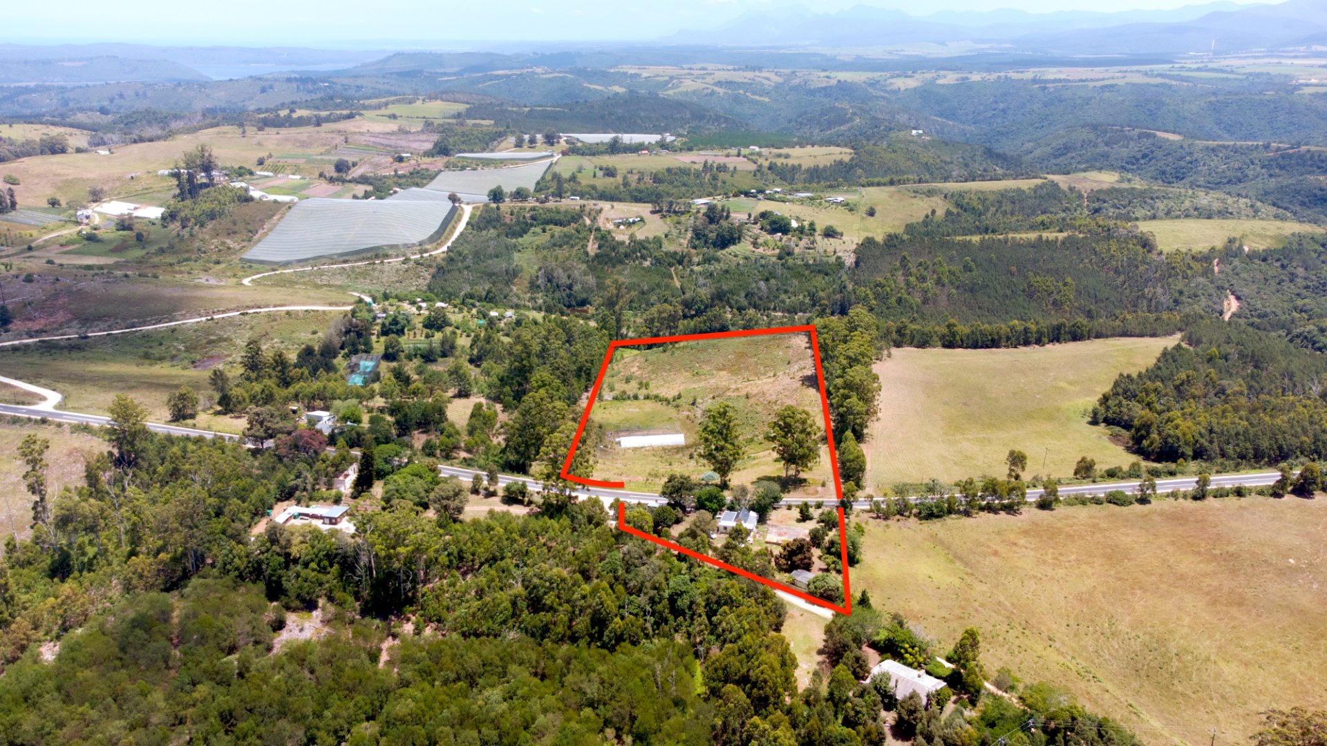 On one side of the road, the triangular section hosts the homestead and improvements. The main house has 2 bedrooms, a bathroom, and an additional room that can serve as a third bedroom, living area, or workspace. The foundation of a former home, lost to fire years ago, still remains—an opportunity to extend or even build a new dwelling, with the Outeniqua Mountains providing a spectacular backdrop.