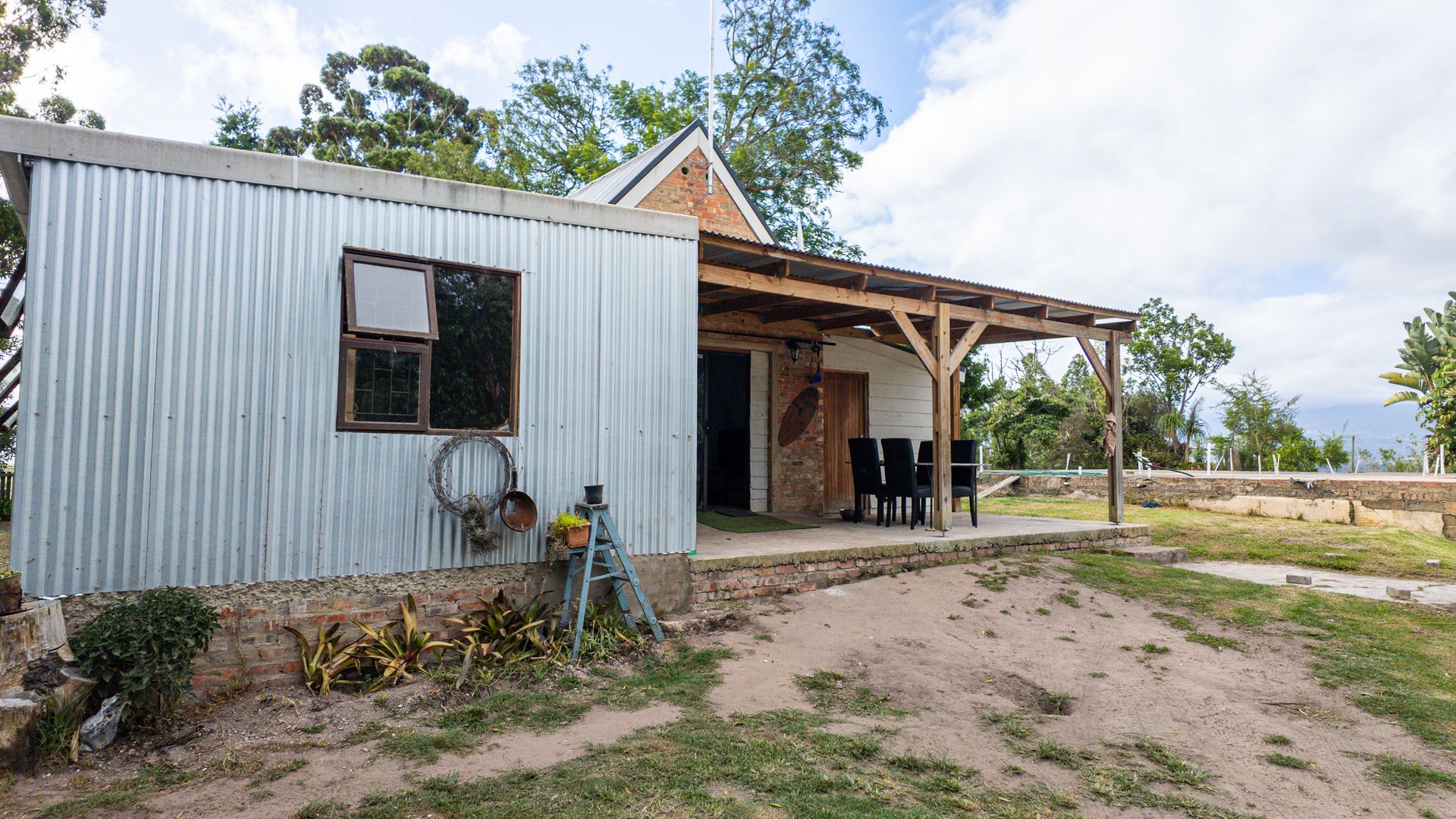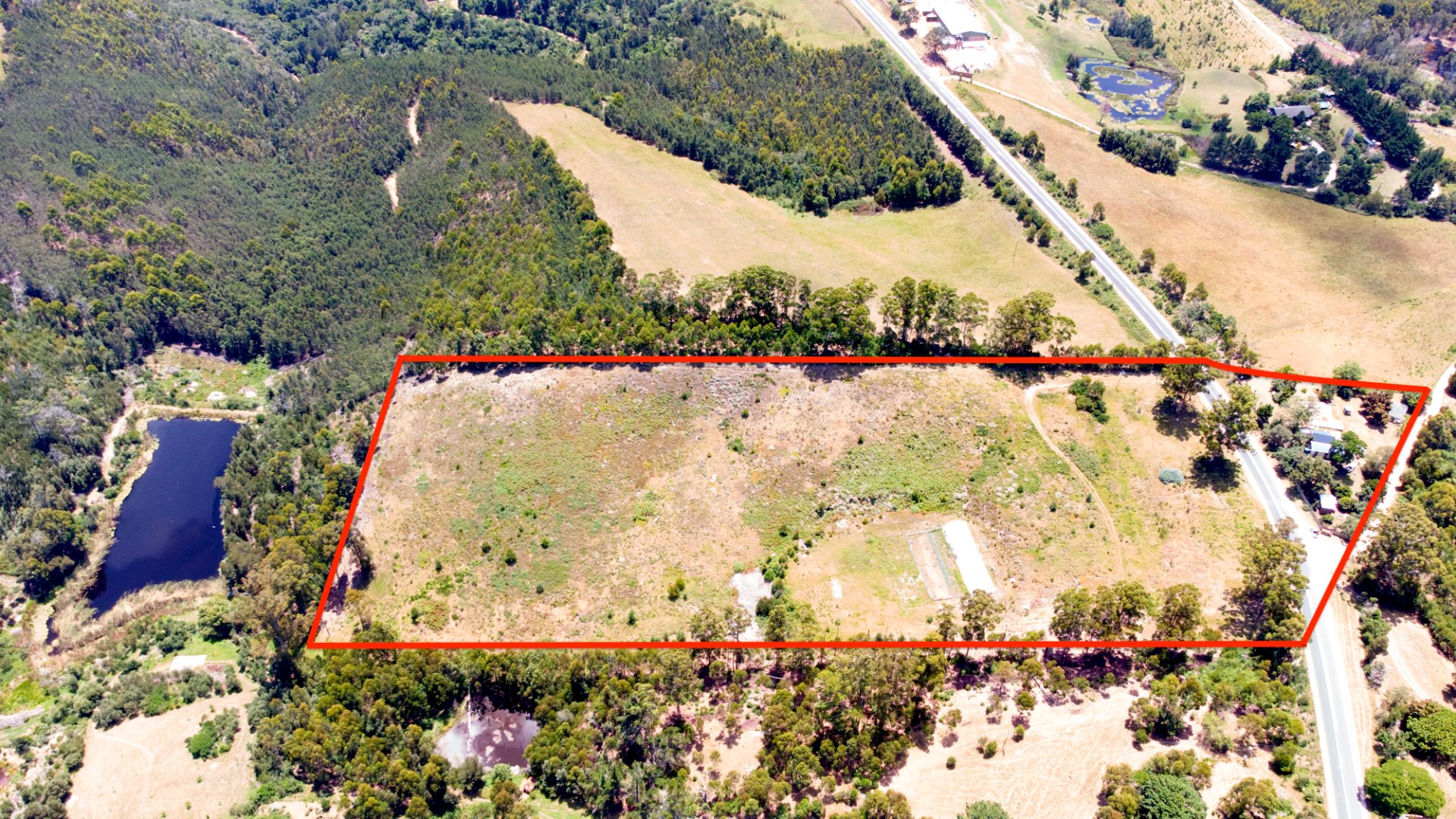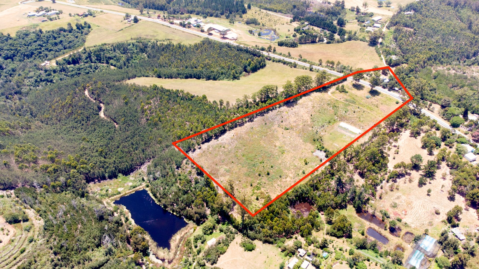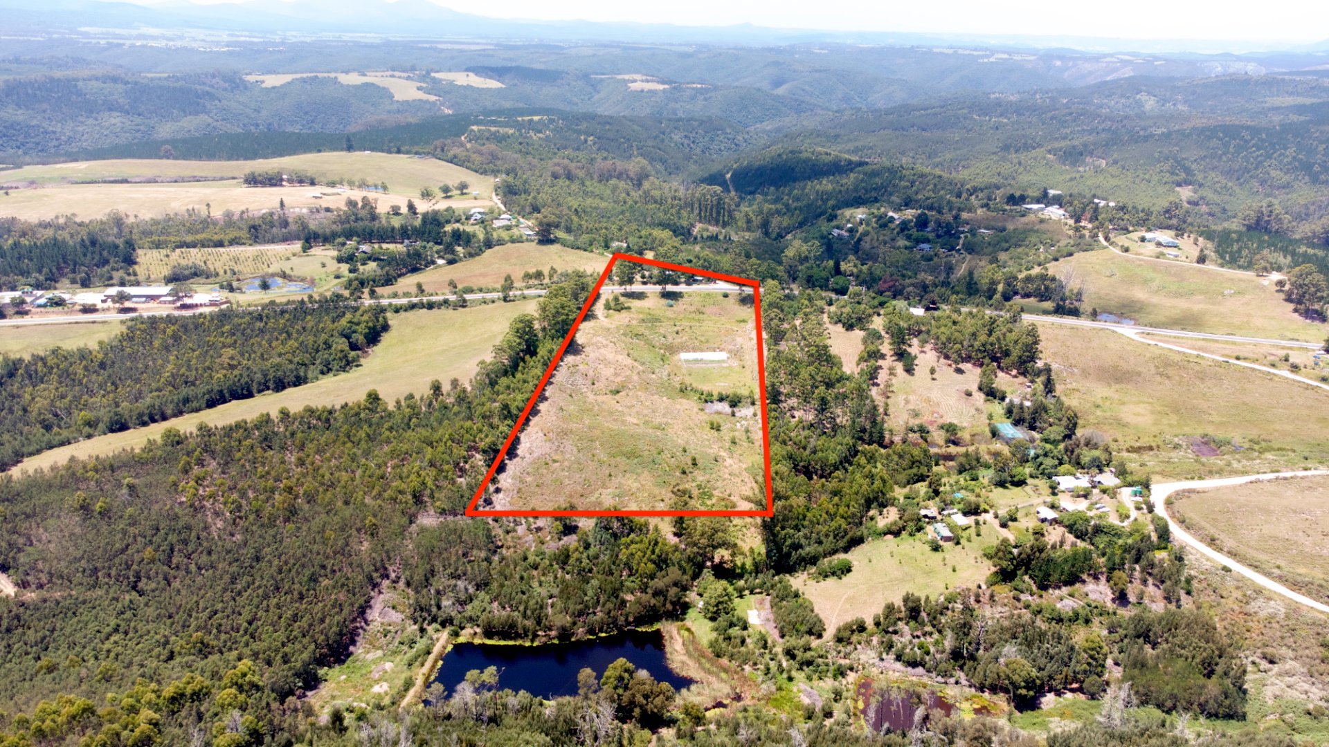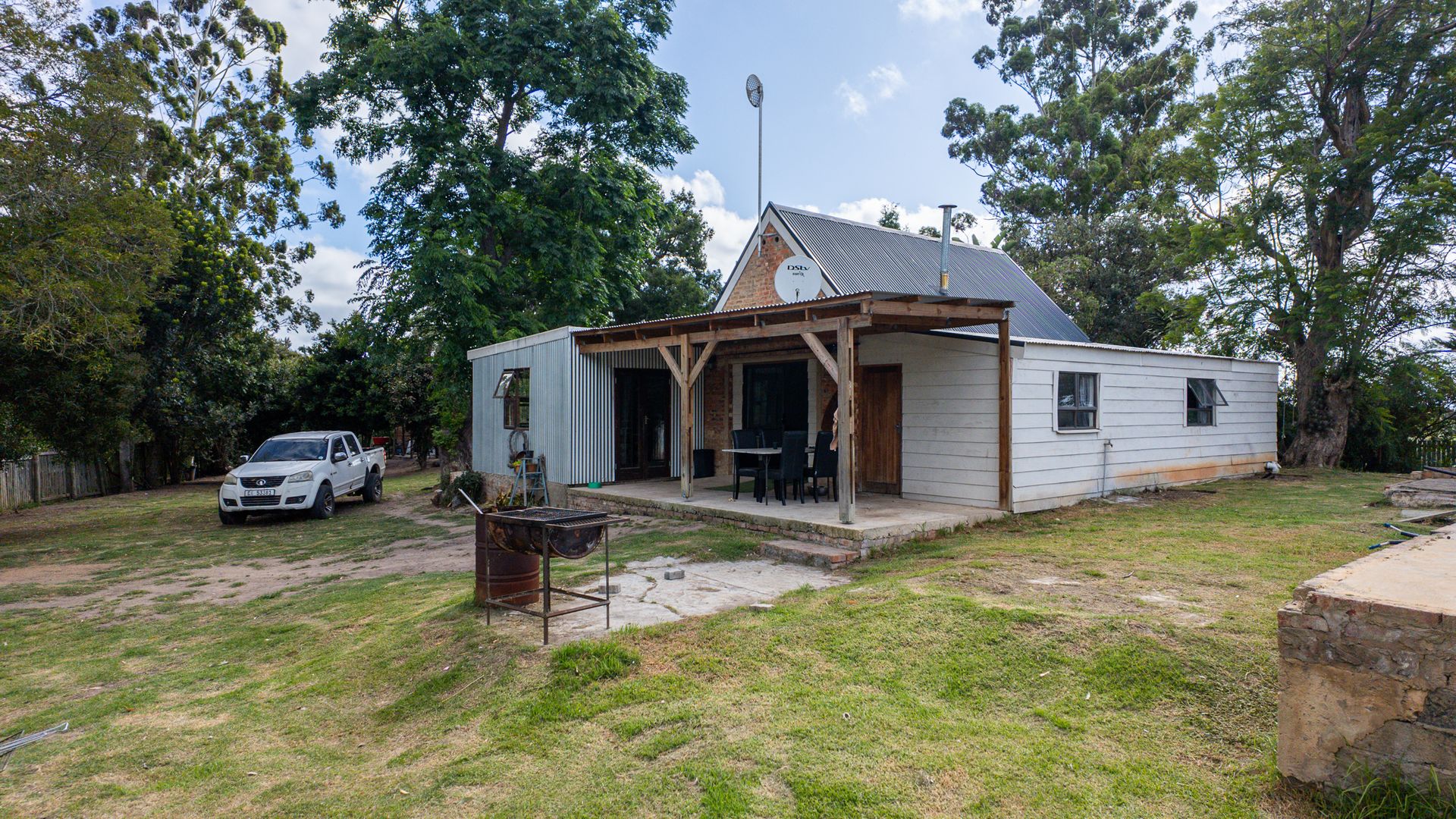 On one side of the road, the triangular section hosts the homestead and improvements. The main house has 2 bedrooms, a bathroom, and an additional room that can serve as a third bedroom, living area, or workspace. The foundation of a former home, lost to fire years ago, still remains—an opportunity to extend or even build a new dwelling, with the Outeniqua Mountains providing a spectacular backdrop.
