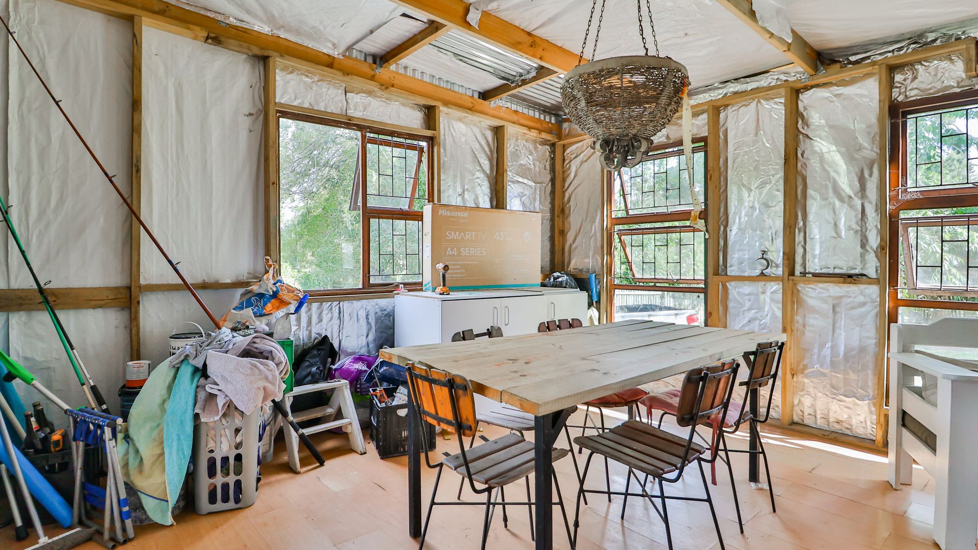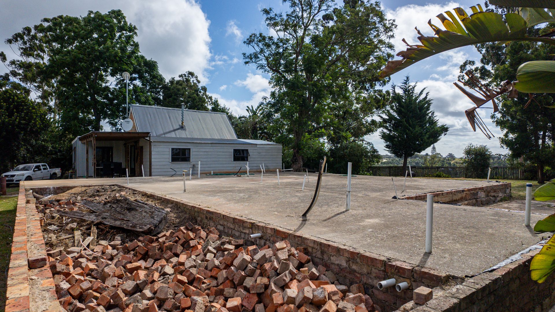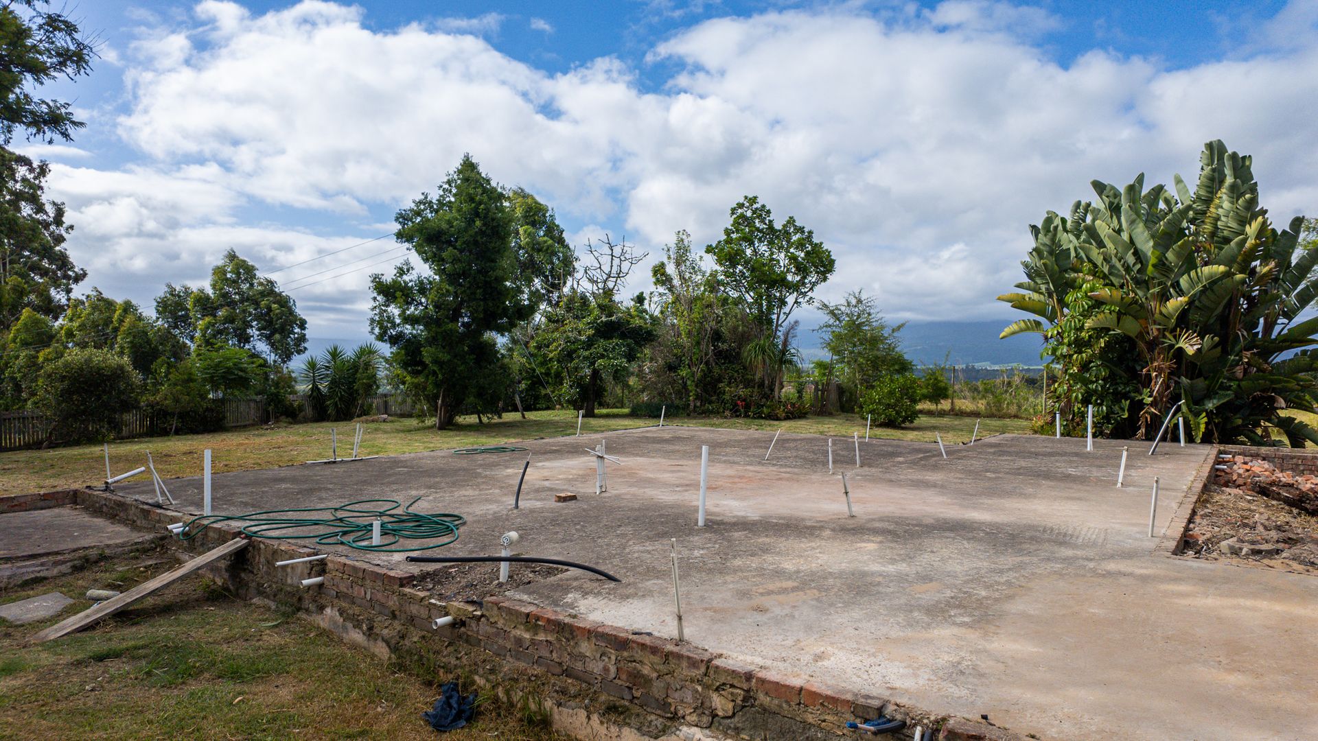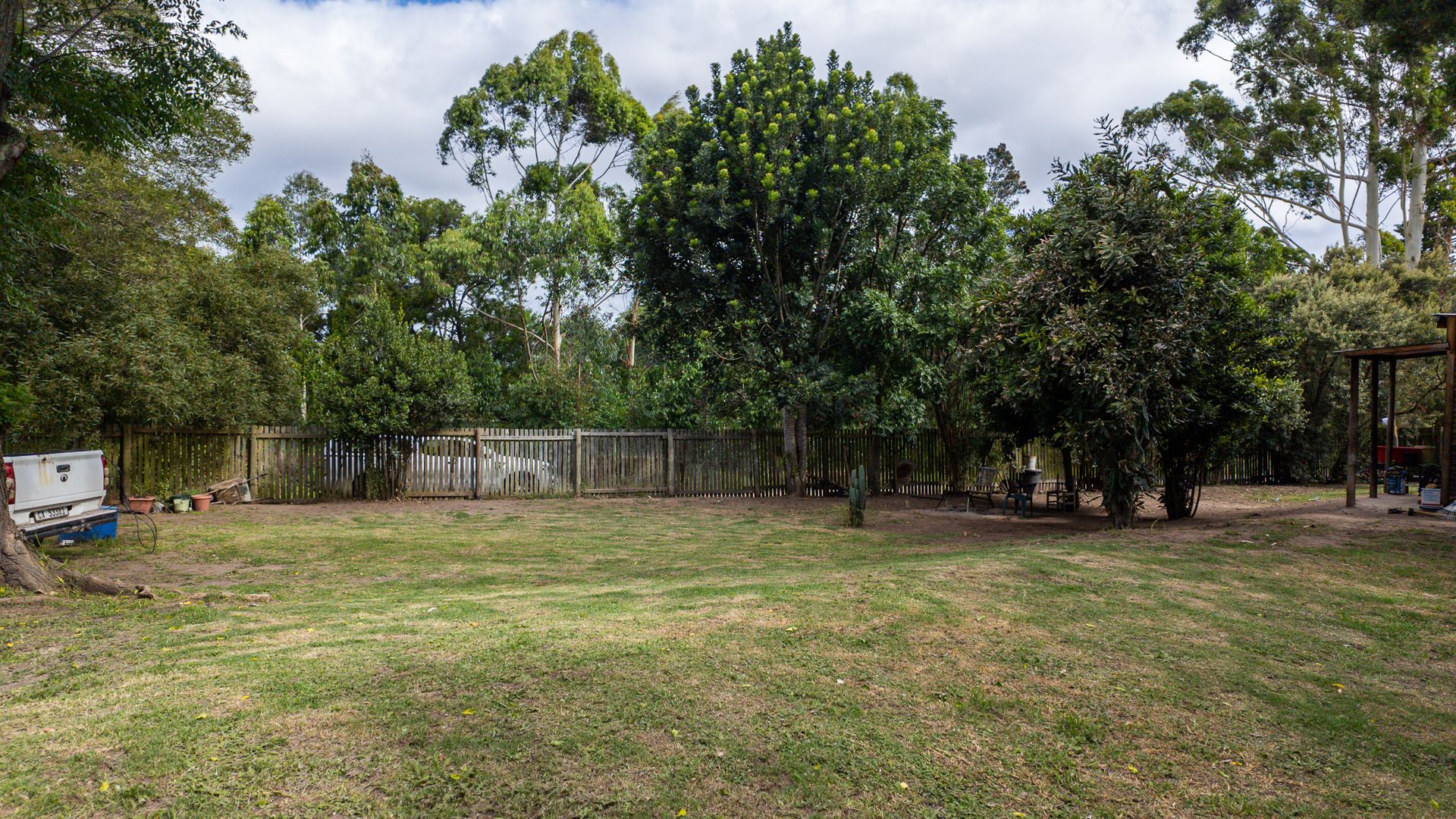 On one side of the road, the triangular section hosts the homestead and improvements. The main house has 2 bedrooms, a bathroom, and an additional room that can serve as a third bedroom, living area, or workspace. The foundation of a former home, lost to fire years ago, still remains—an opportunity to extend or even build a new dwelling, with the Outeniqua Mountains providing a spectacular backdrop.