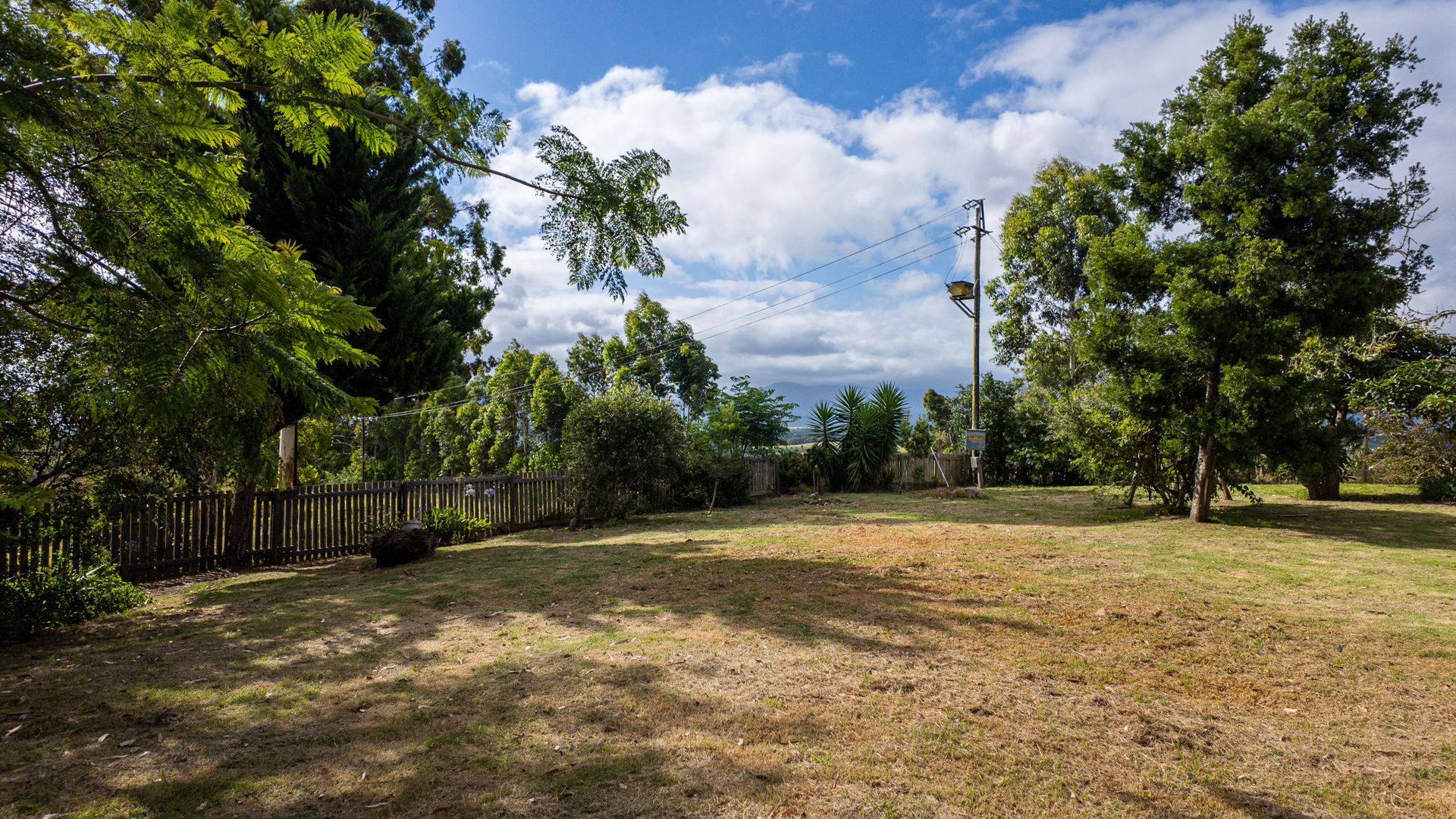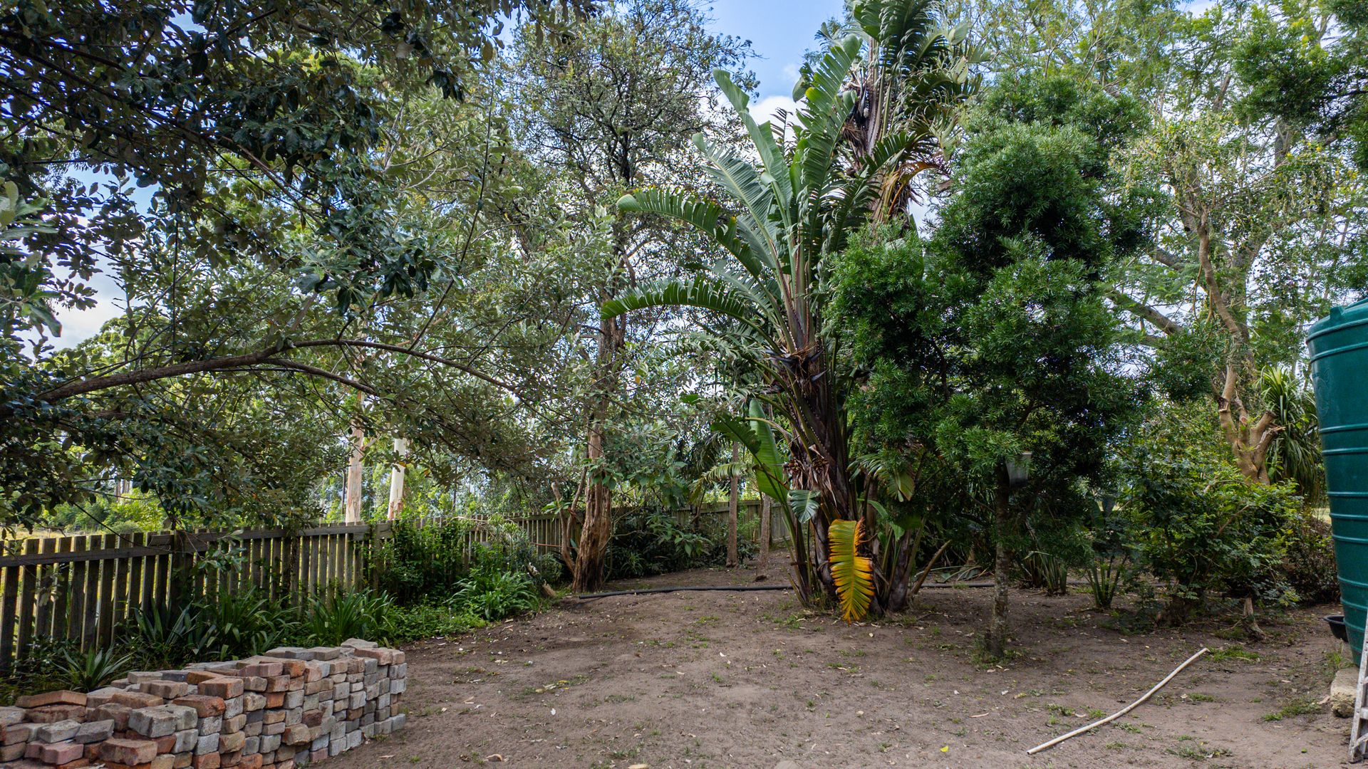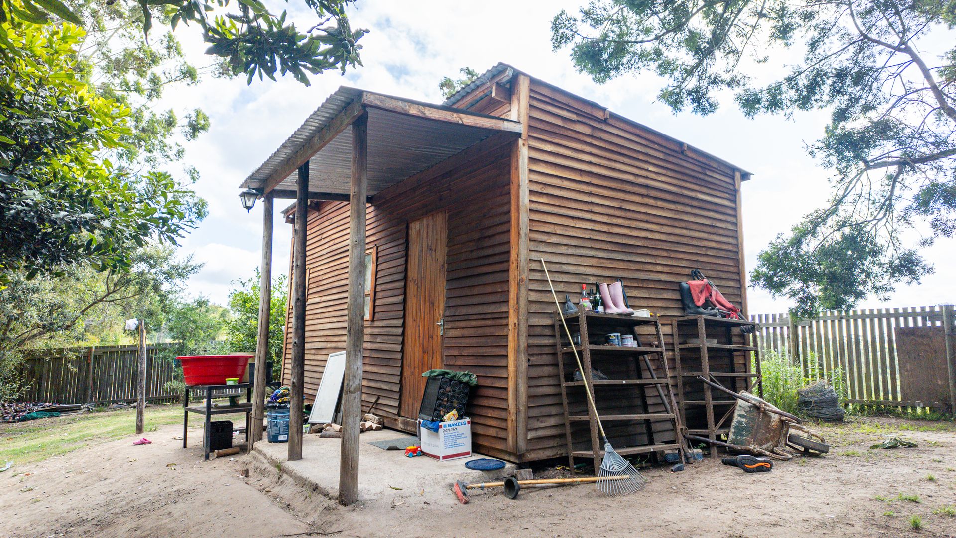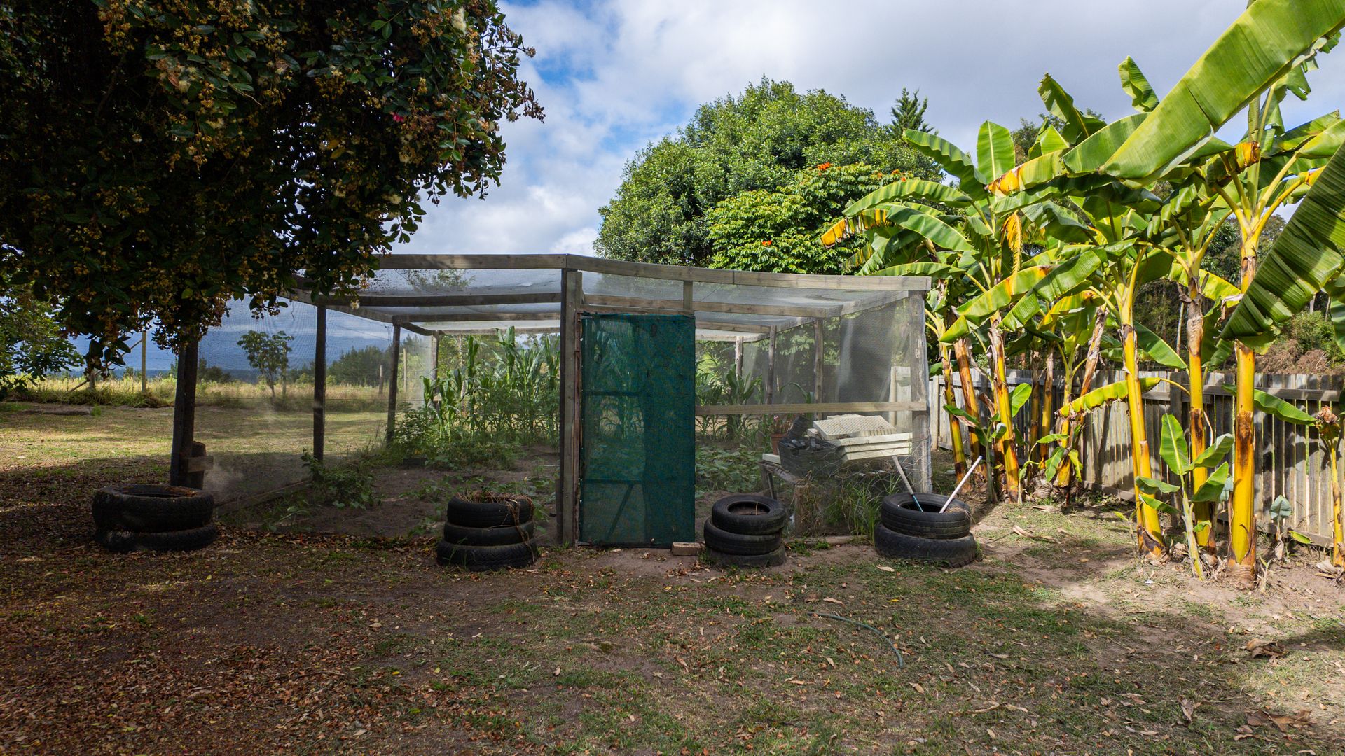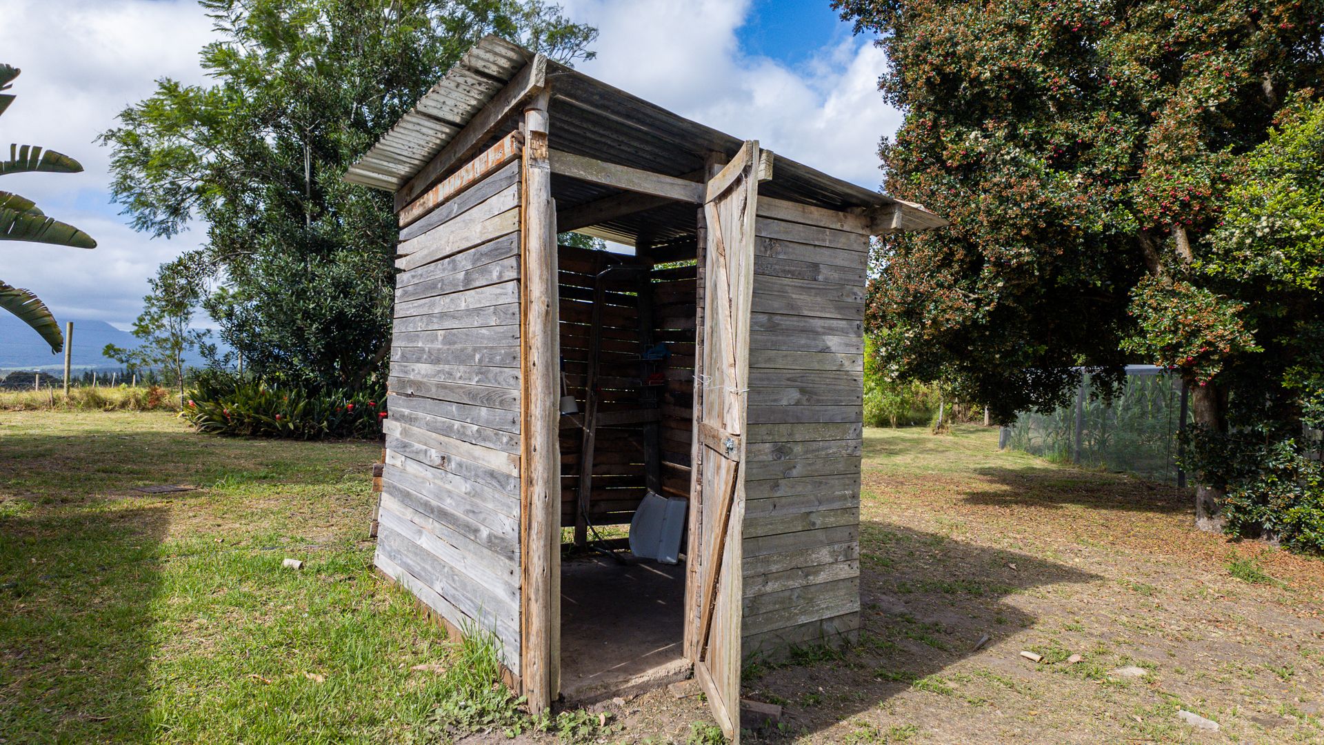 Close to the house, you’ll find a quaint rustic outdoor bathroom and a netted veggie patch tucked into the corner of the property. Large established trees, shrubs, and a collection of fruit trees frame the garden beautifully, creating a natural, inviting setting.