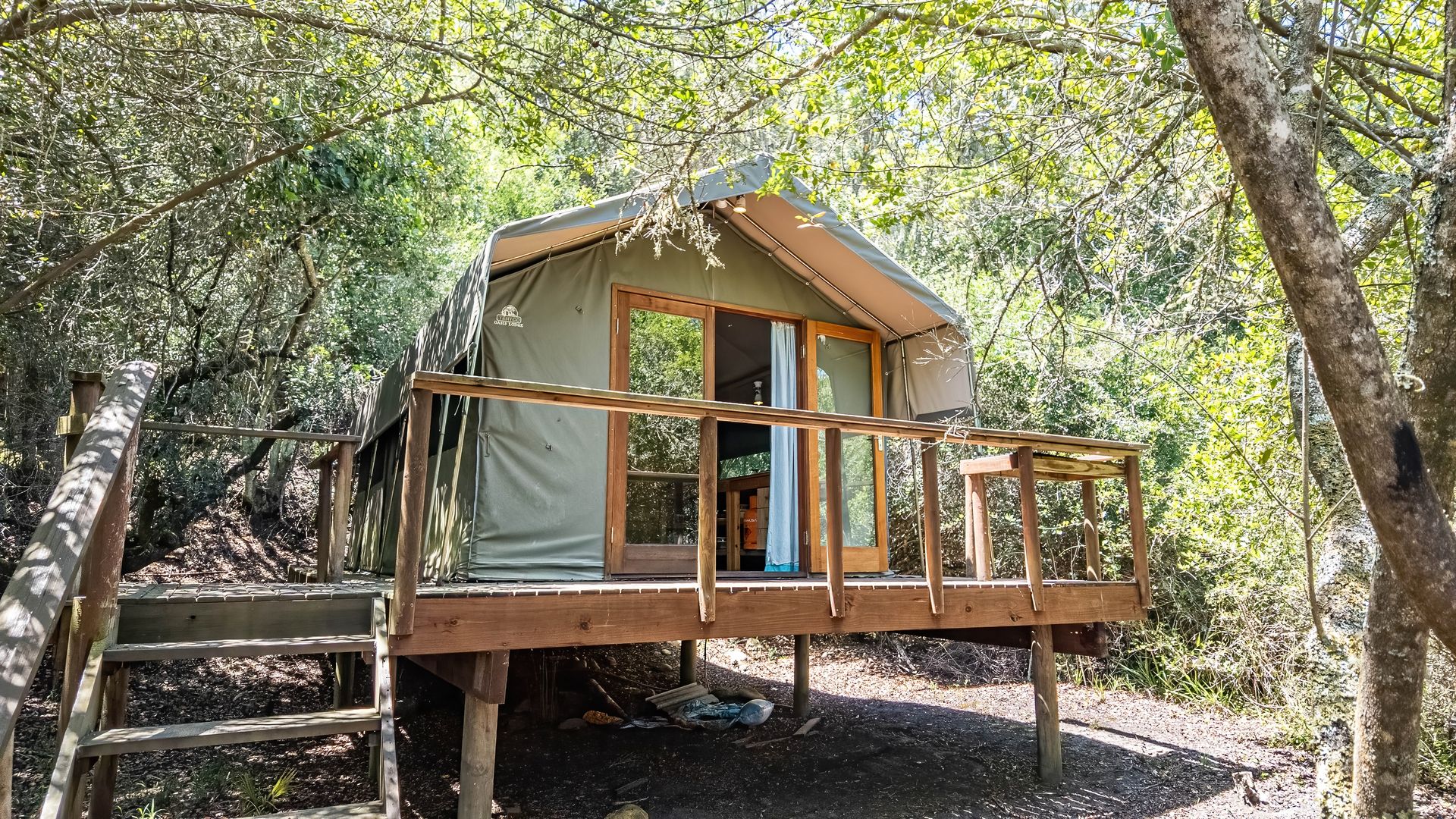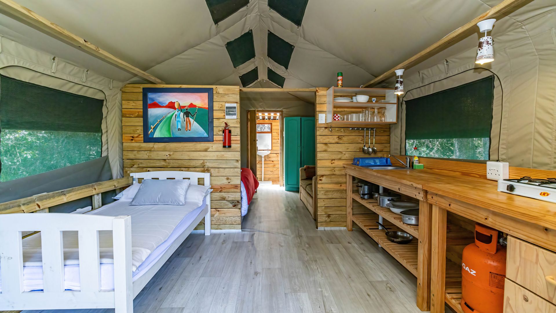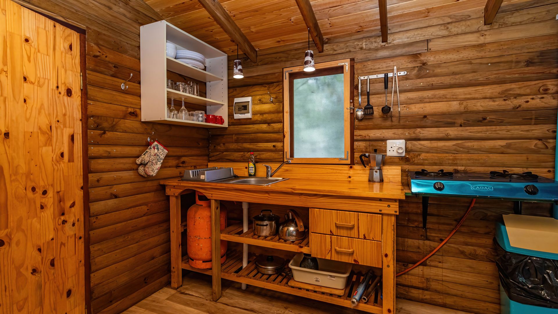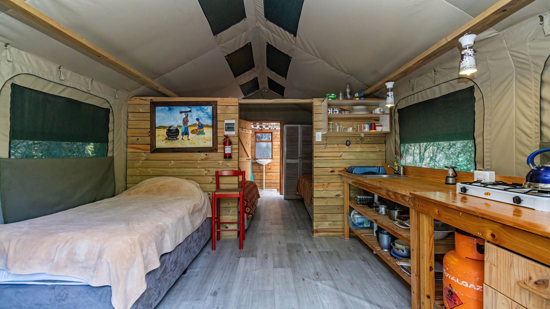 On the northern side of the river frontage, another cleared area hosts two luxury furnished tents, each with a bedroom area, kitchenette, bathroom and a small deck facing the river. Tucked into the trees, this space offers guests a peaceful, “immersed in nature” experience. Nearby stands a charming open-plan log cottage—one bedroom, kitchenette, bathroom, and an intimate deck almost on the river’s edge.