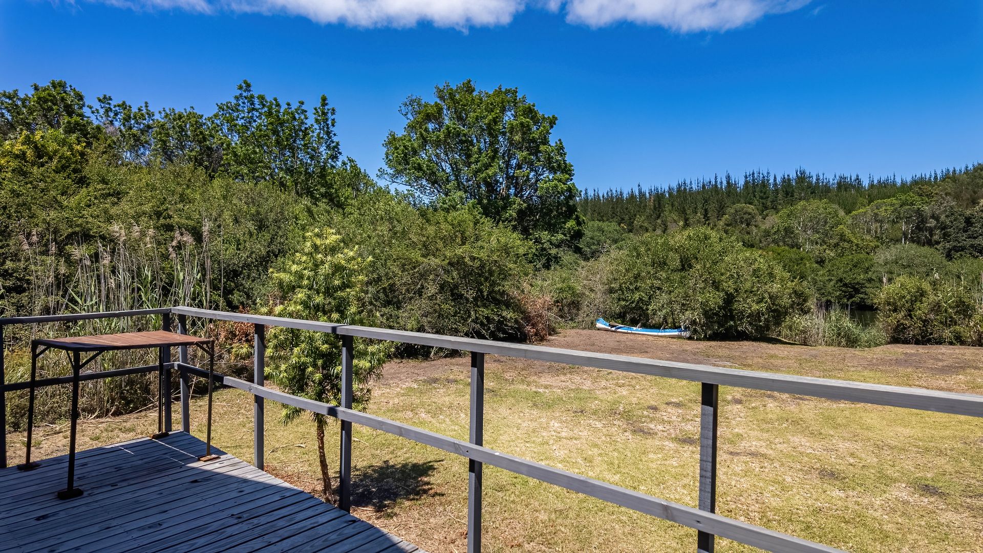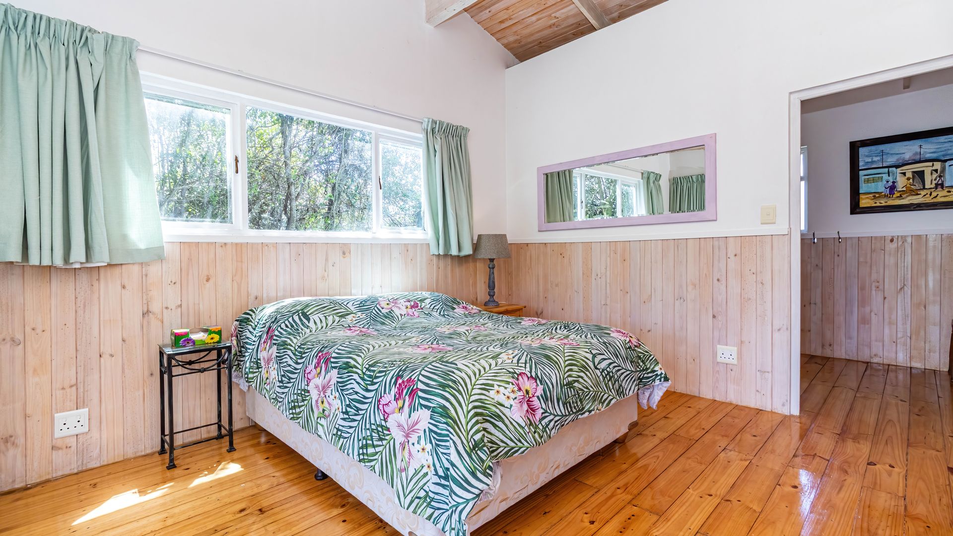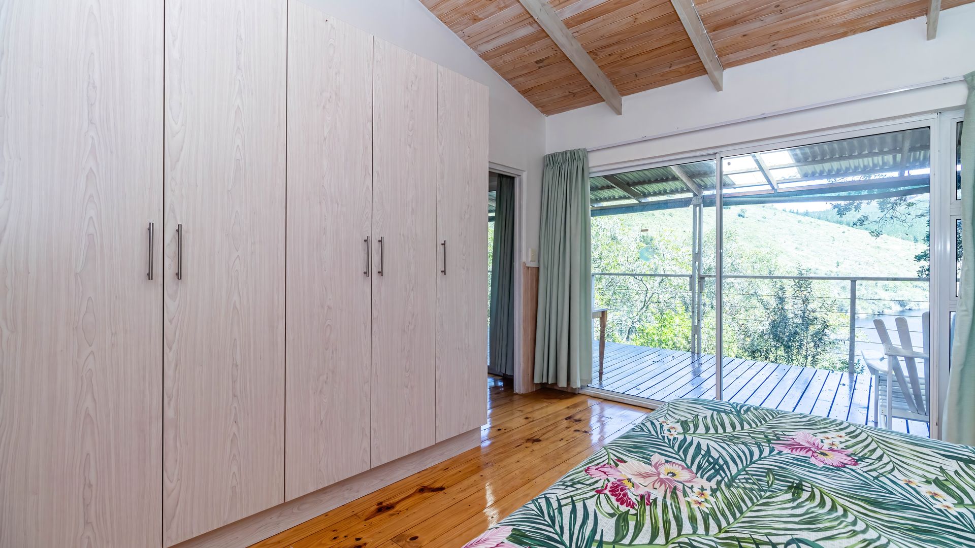 Across the road, on the eastern portion of the property, is a two-bedroom, two-bathroom cottage with a deck and lovely views toward the Swartvlei Lagoon. A cozy fireplace completes the homely, elevated setting.