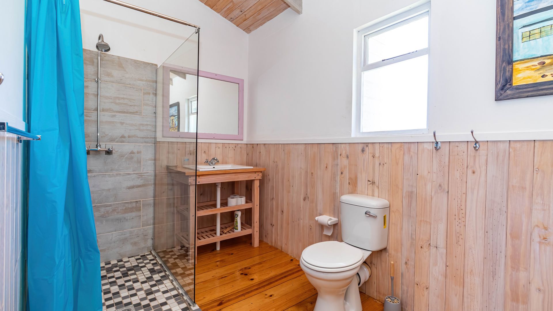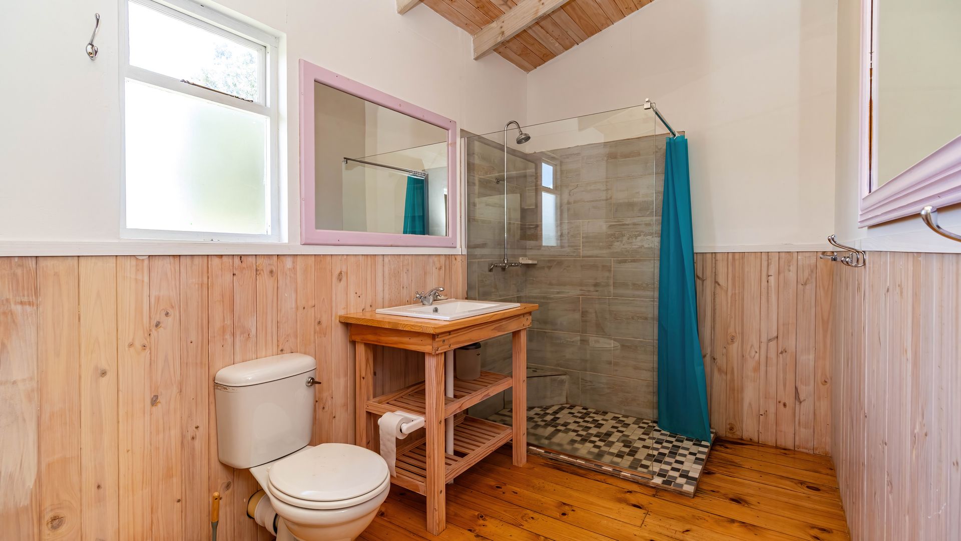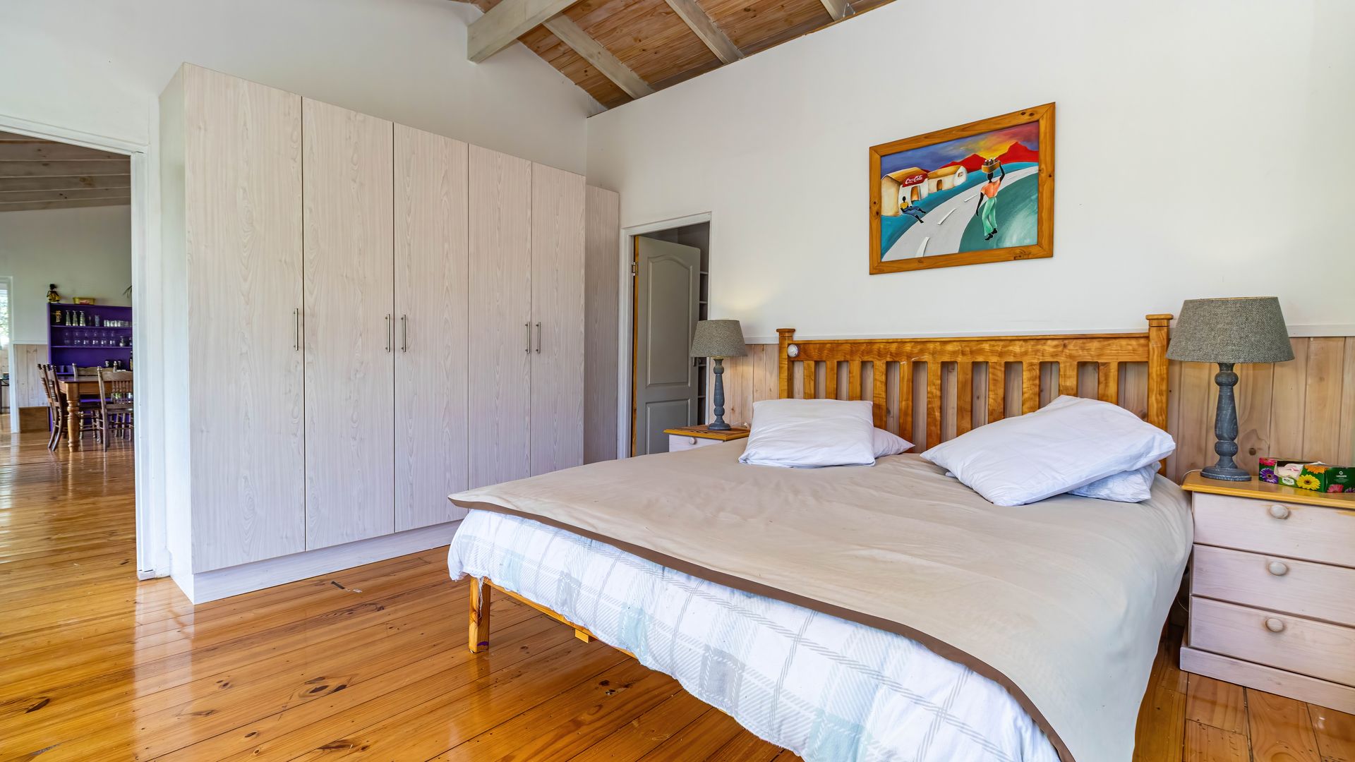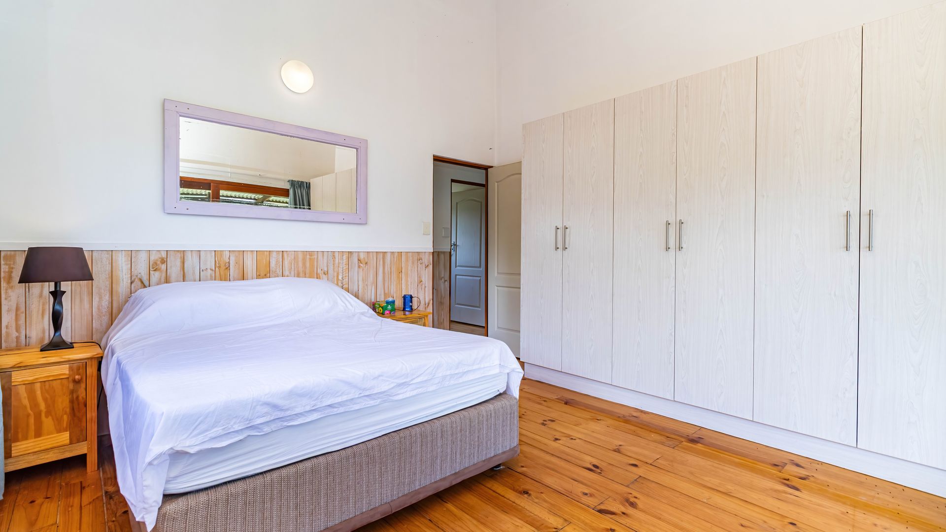 Across the road, on the eastern portion of the property, is a two-bedroom, two-bathroom cottage with a deck and lovely views toward the Swartvlei Lagoon. A cozy fireplace completes the homely, elevated setting.