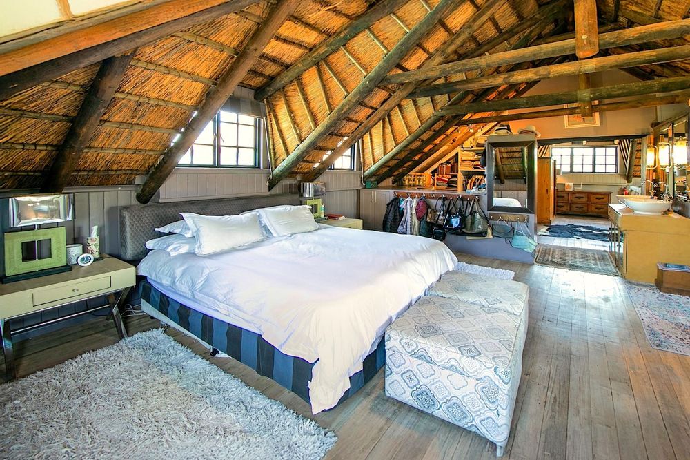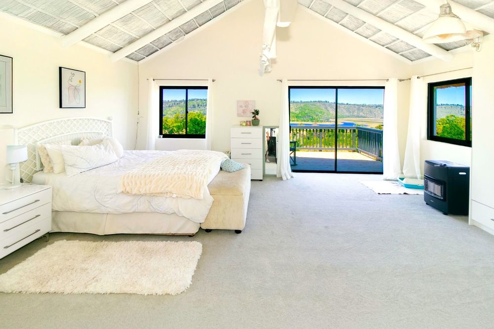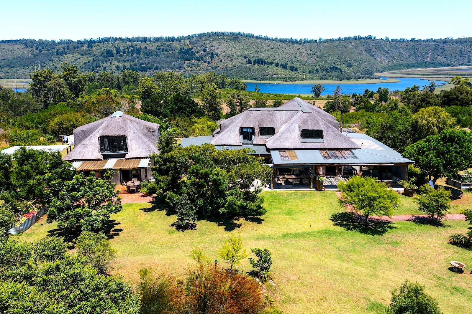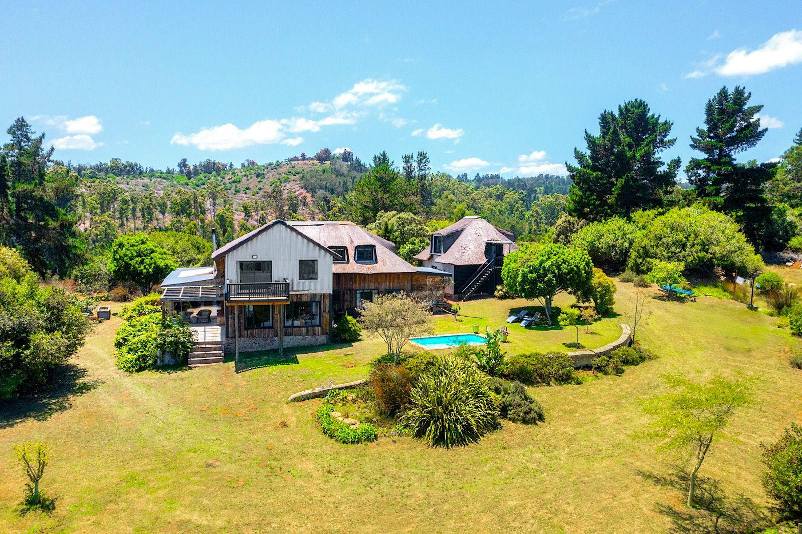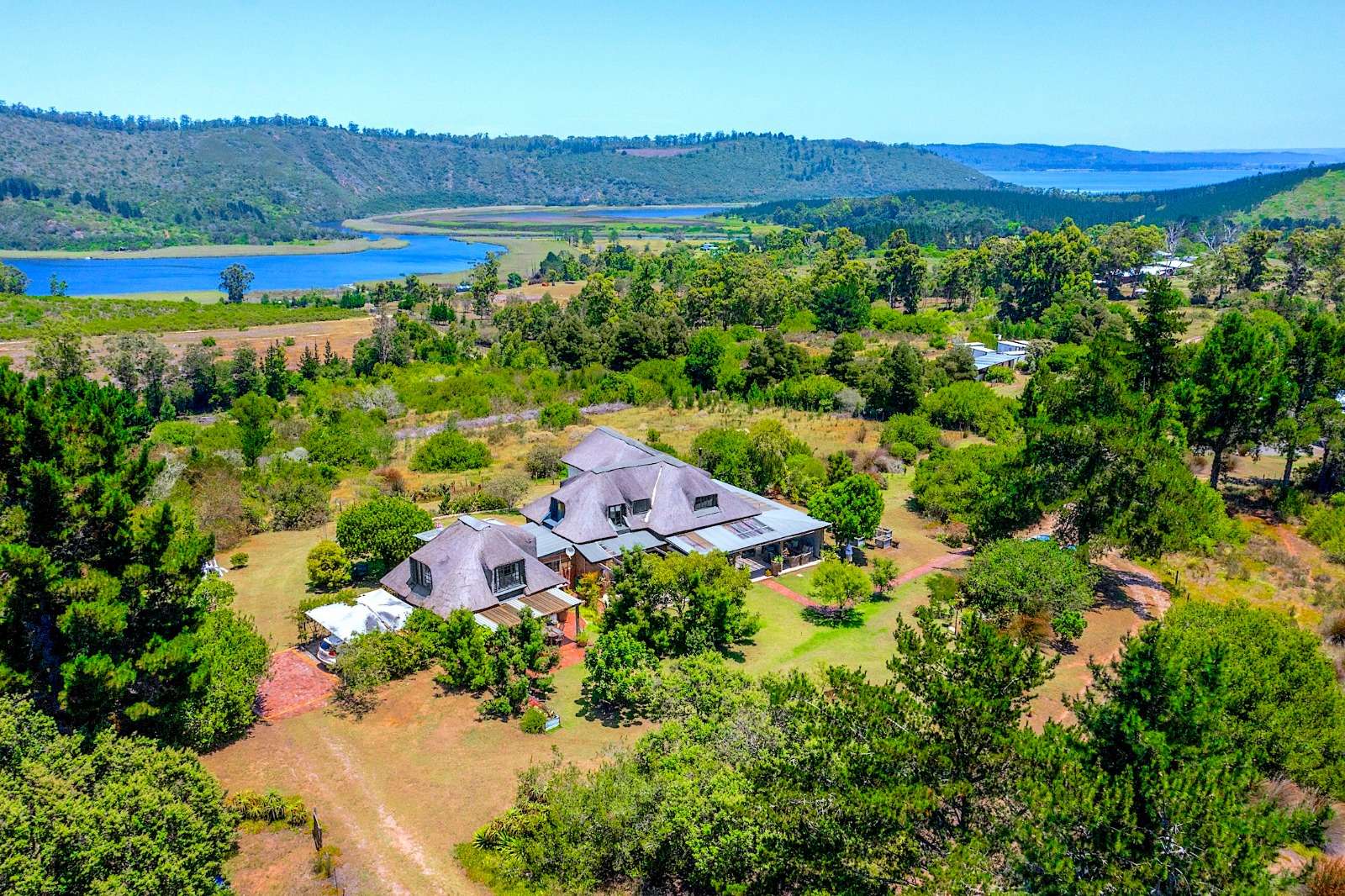 This extraordinary 25-hectare agricultural smallholding, offers a completely private world of unique character just 12km from Sedgefield. Set high on the hillside, the farm commands sweeping, uninterrupted views over the Swartvlei Estuary and the sprawling mountain landscape.The main residence is set apart by its stunning aesthetic, thanks to the main roof having been recently re-thatched, a feature that immediately sets the tone for rustic elegance. A newly redone thatch roof not only adds charm but provides excellent natural insulation, helping keep the home cooler in summer and warmer in winter. The grand entrance hall, graced by a stylish staircase, leads to spacious, light-filled living areas. These include a generous lounge which captures the magnificent views and flows seamlessly to a sparkling swimming pool. For cooler evenings, the family room centers around a wood-burning fireplace, providing a cozy heart for the home.Accommodation includes three spacious bedrooms and three bathrooms, with a private ensuite on the ground floor for ease of access and two bedrooms resting upstairs. The charming farm-style kitchen, featuring an open-plan dining area and a separate working scullery/laundry, opens onto a generous, north-facing verandah—an ideal spot for entertaining or soaking in the views.