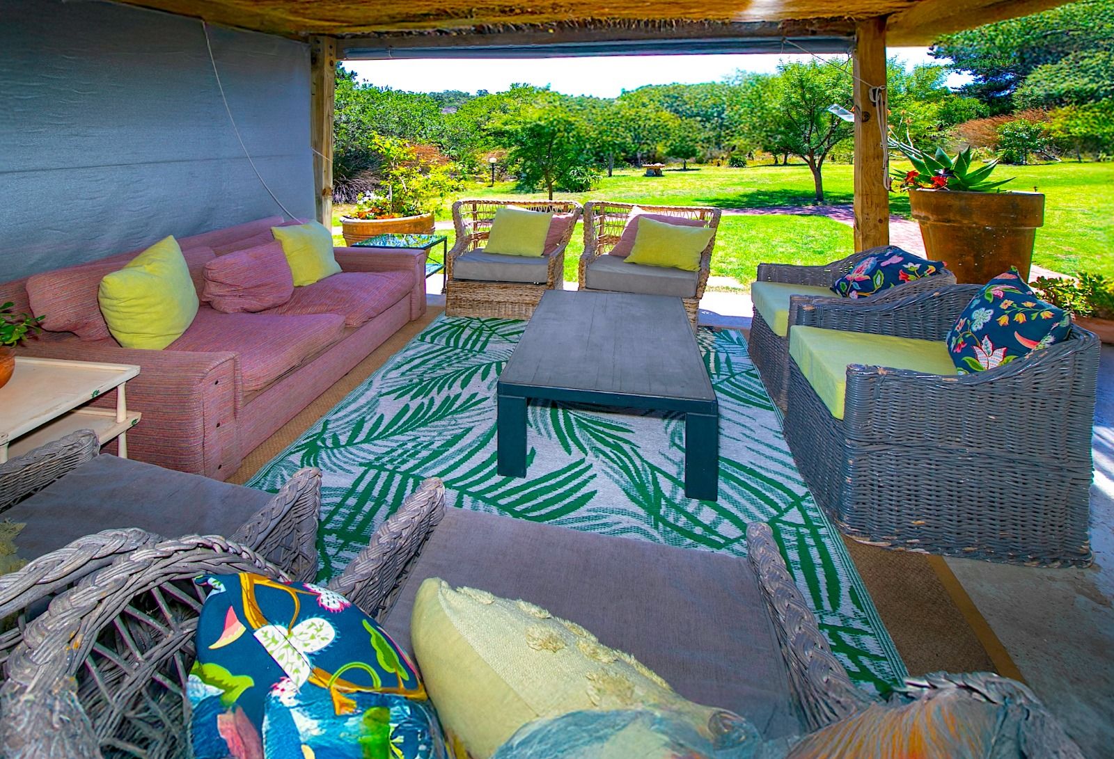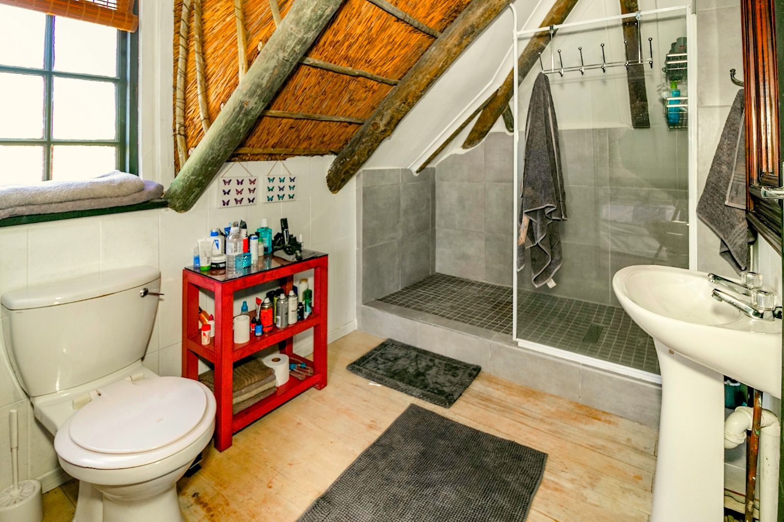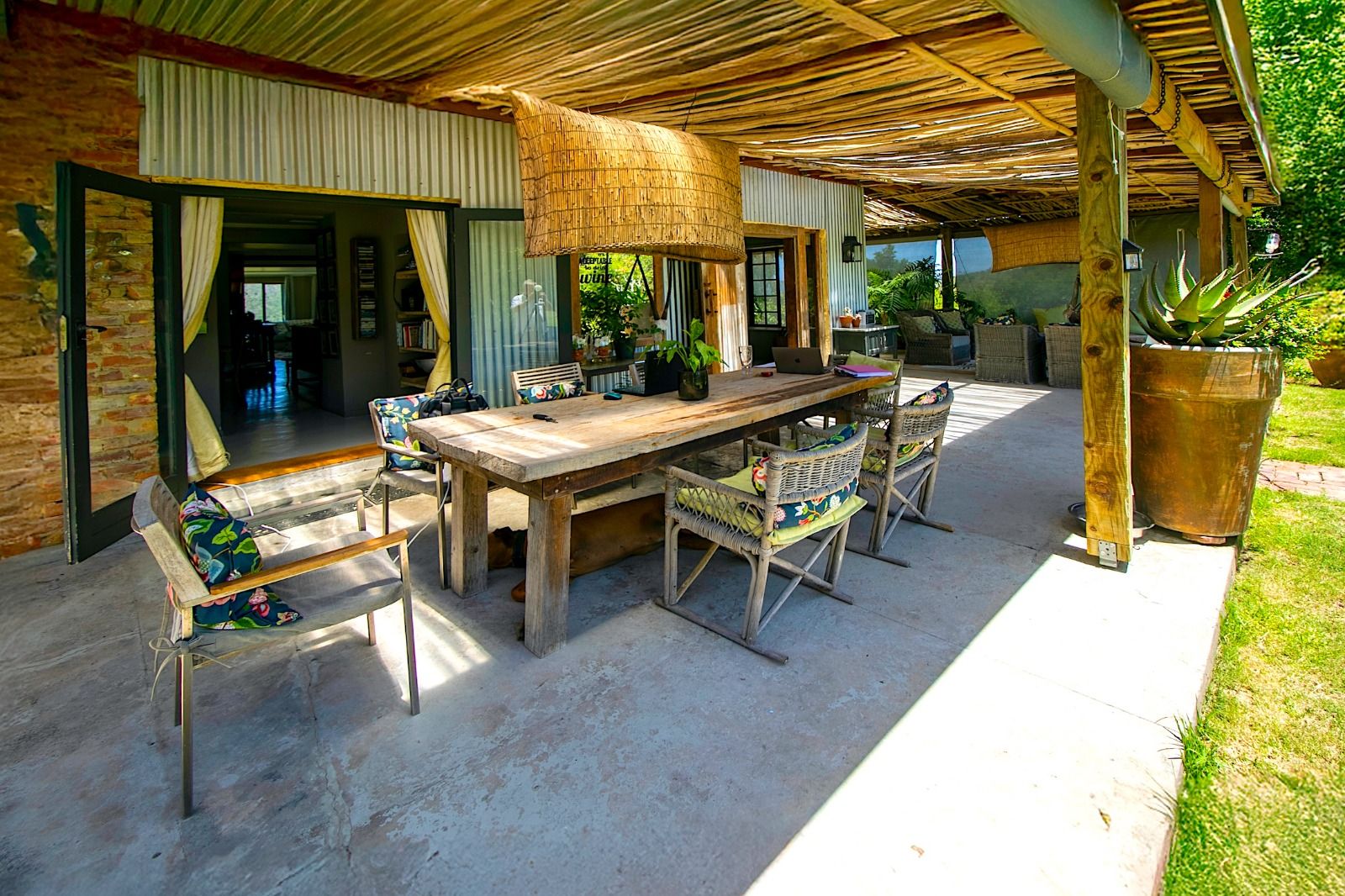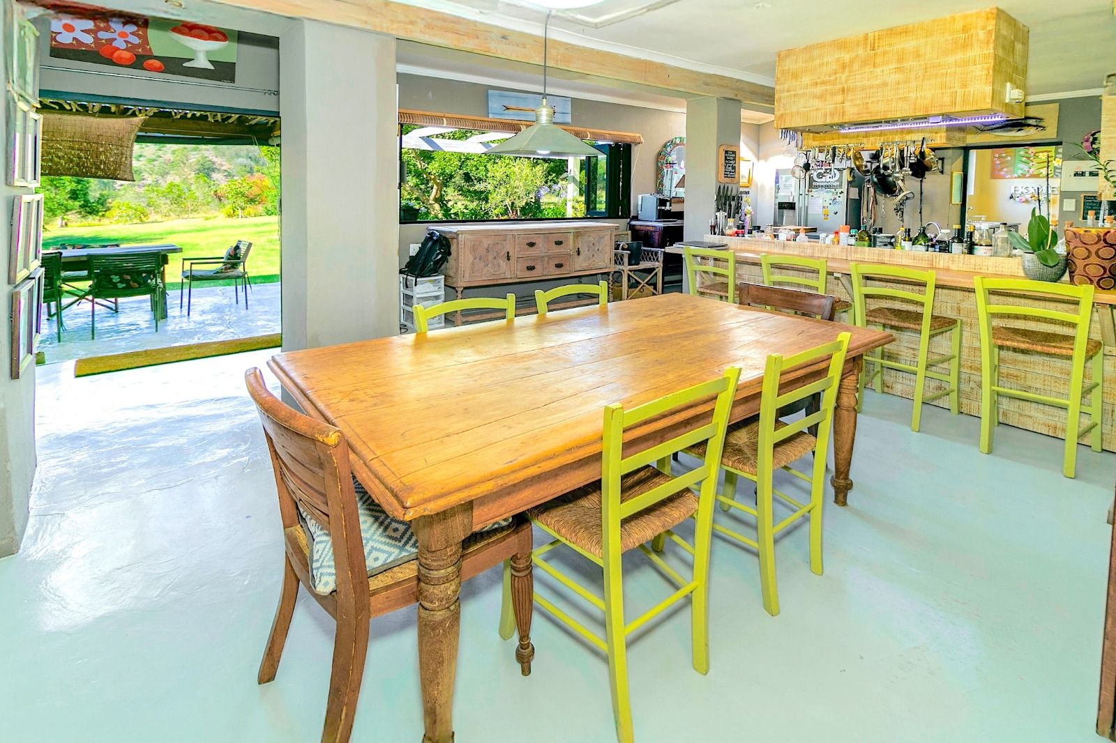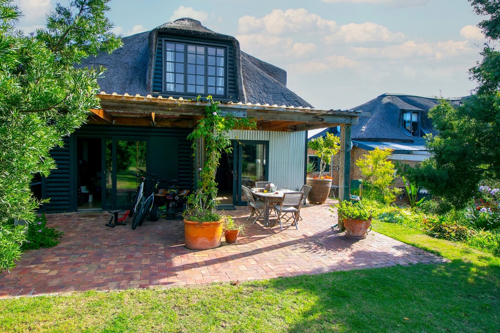 This extraordinary 25-hectare agricultural smallholding, offers a completely private world of unique character just 12km from Sedgefield. Set high on the hillside, the farm commands sweeping, uninterrupted views over the Swartvlei Estuary and the sprawling mountain landscape.The main residence is set apart by its stunning aesthetic, thanks to the main roof having been recently re-thatched, a feature that immediately sets the tone for rustic elegance. A newly redone thatch roof not only adds charm but provides excellent natural insulation, helping keep the home cooler in summer and warmer in winter. The grand entrance hall, graced by a stylish staircase, leads to spacious, light-filled living areas. These include a generous lounge which captures the magnificent views and flows seamlessly to a sparkling swimming pool. For cooler evenings, the family room centers around a wood-burning fireplace, providing a cozy heart for the home.Accommodation includes three spacious bedrooms and three bathrooms, with a private ensuite on the ground floor for ease of access and two bedrooms resting upstairs. The charming farm-style kitchen, featuring an open-plan dining area and a separate working scullery/laundry, opens onto a generous, north-facing verandah—an ideal spot for entertaining or soaking in the views.