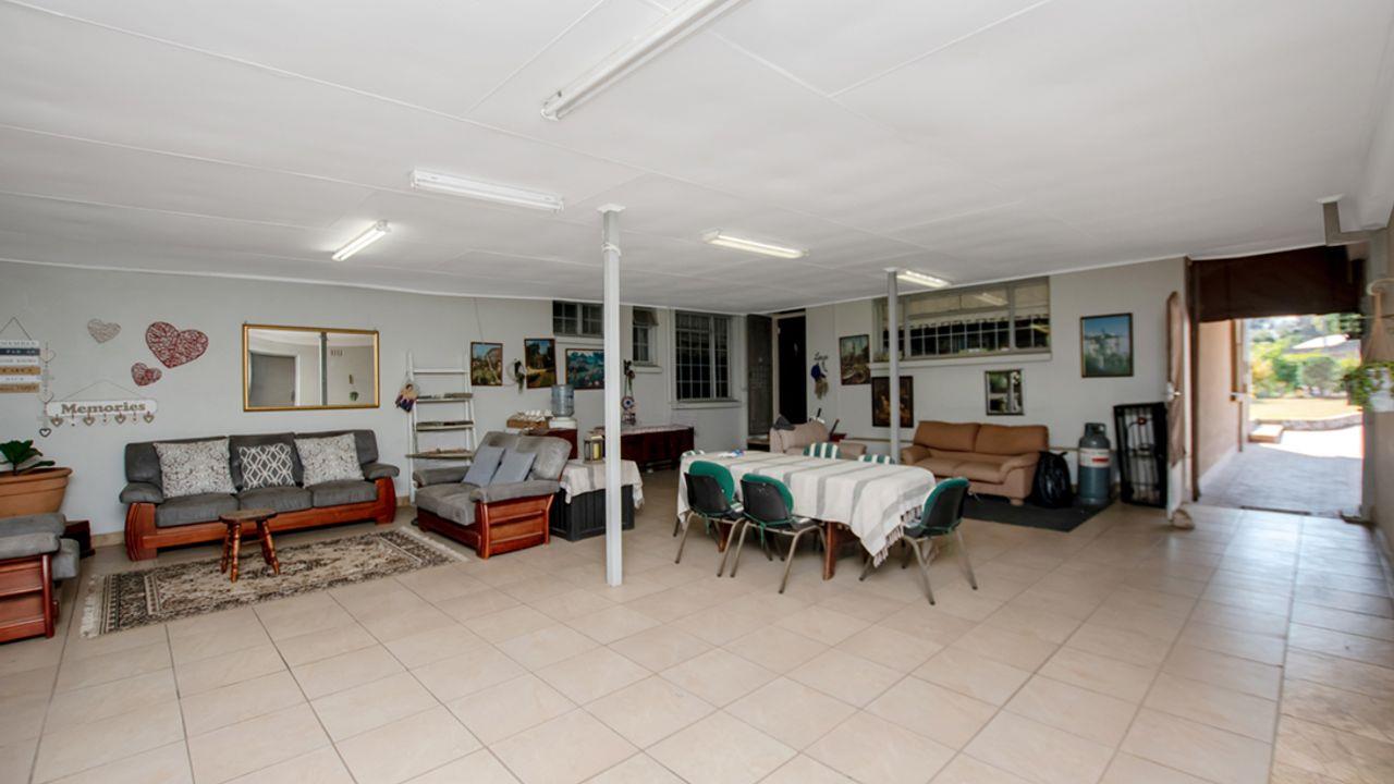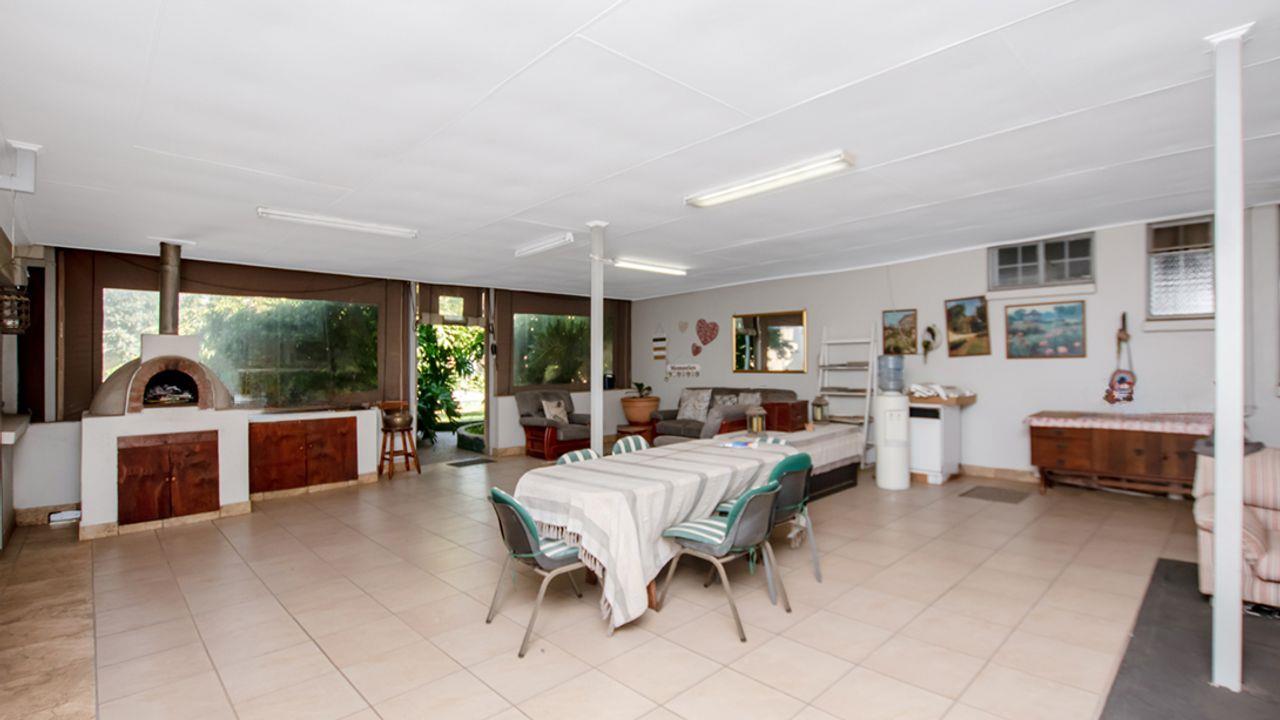 A generous dining room leading to a sun-filled living area also with custom cabinetry