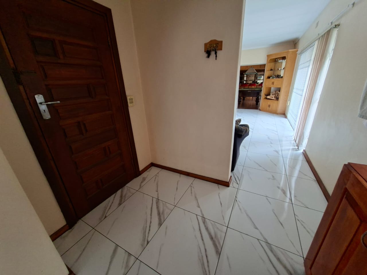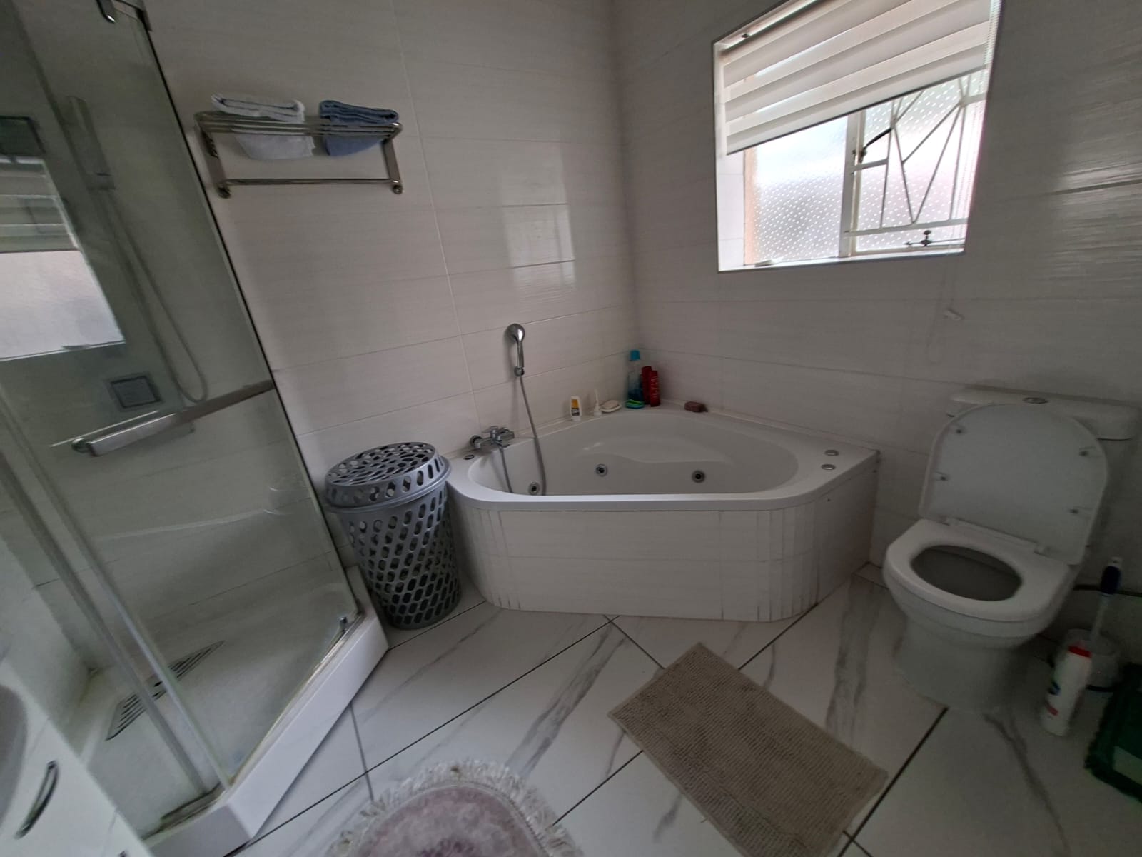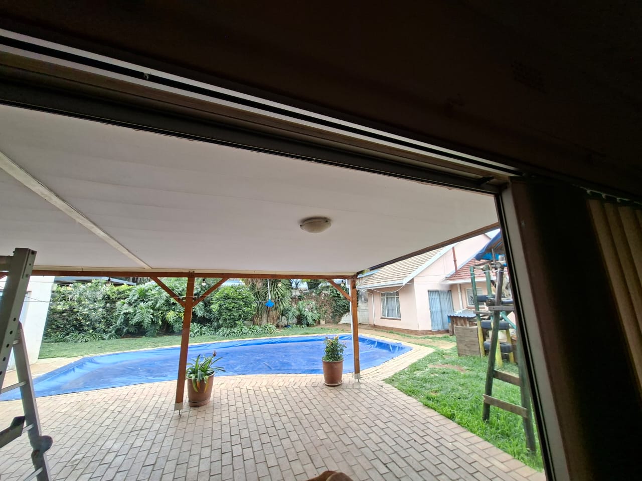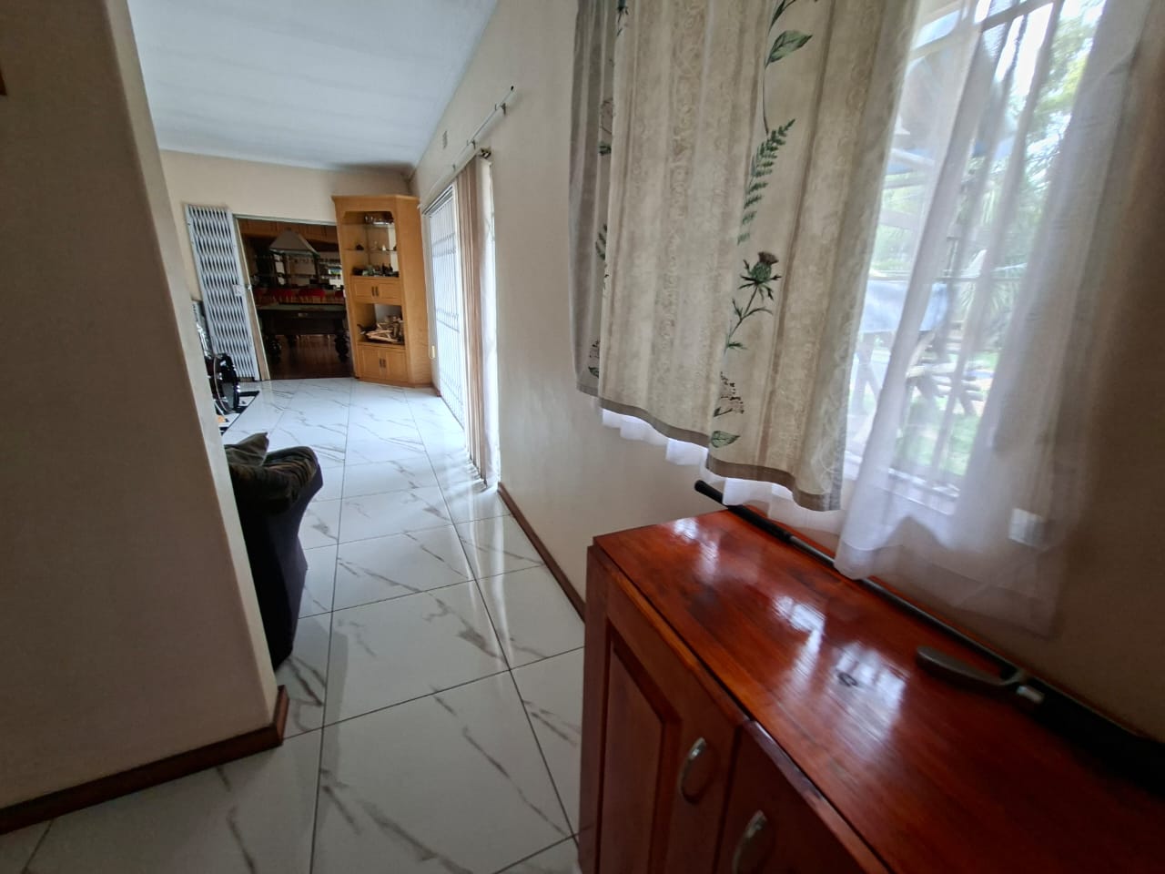 From the dining room, an open-plan entertainment area unfolds, featuring a lounge and pool table. A sliding door leads outside to the backyard. Descending, you'll find a bar with another sliding door opening up to the swimming pool area. Further down, discover a braai stove, kitchen storeroom, and toilet, all set against a beautiful view facing the pool area.