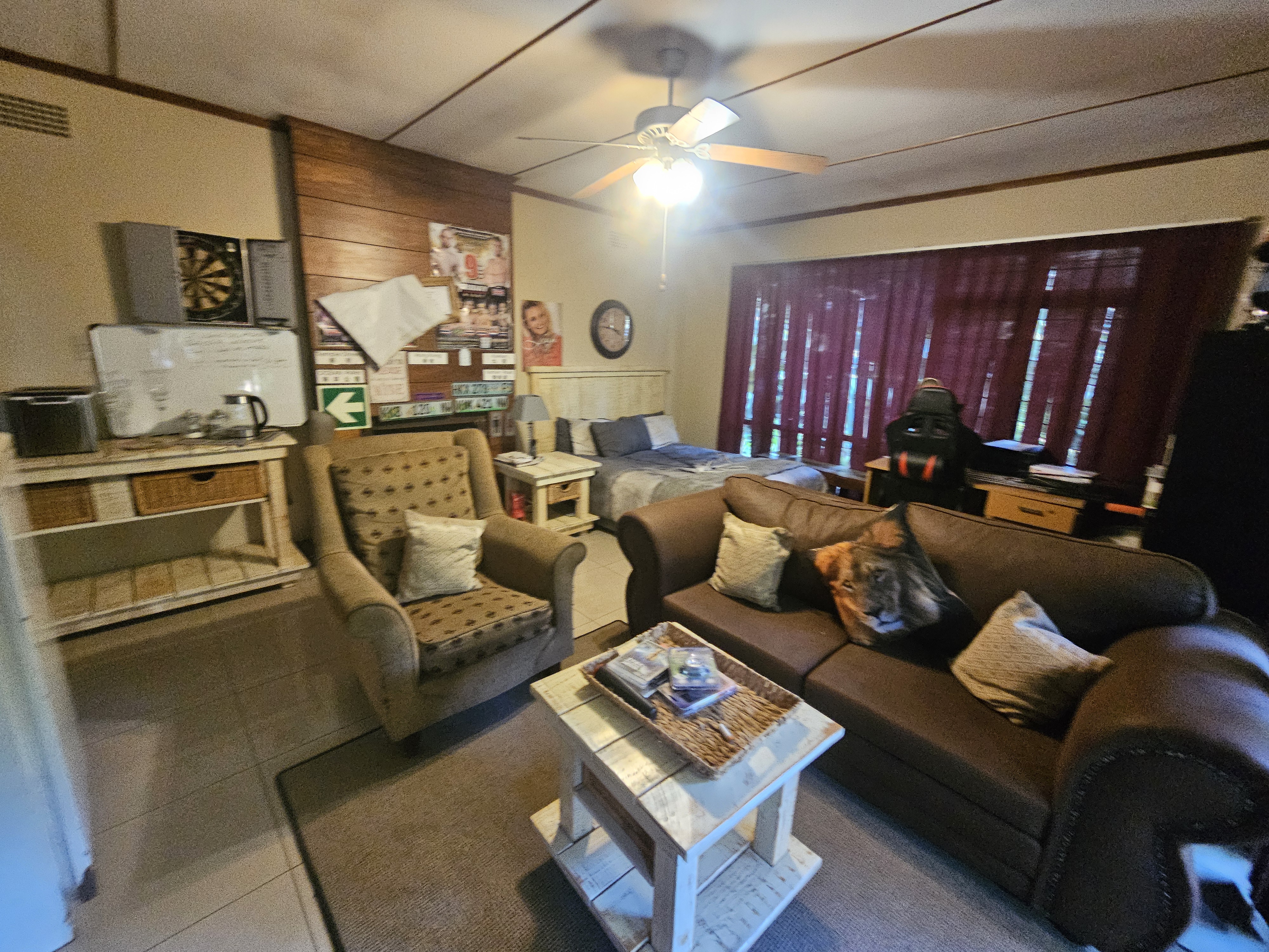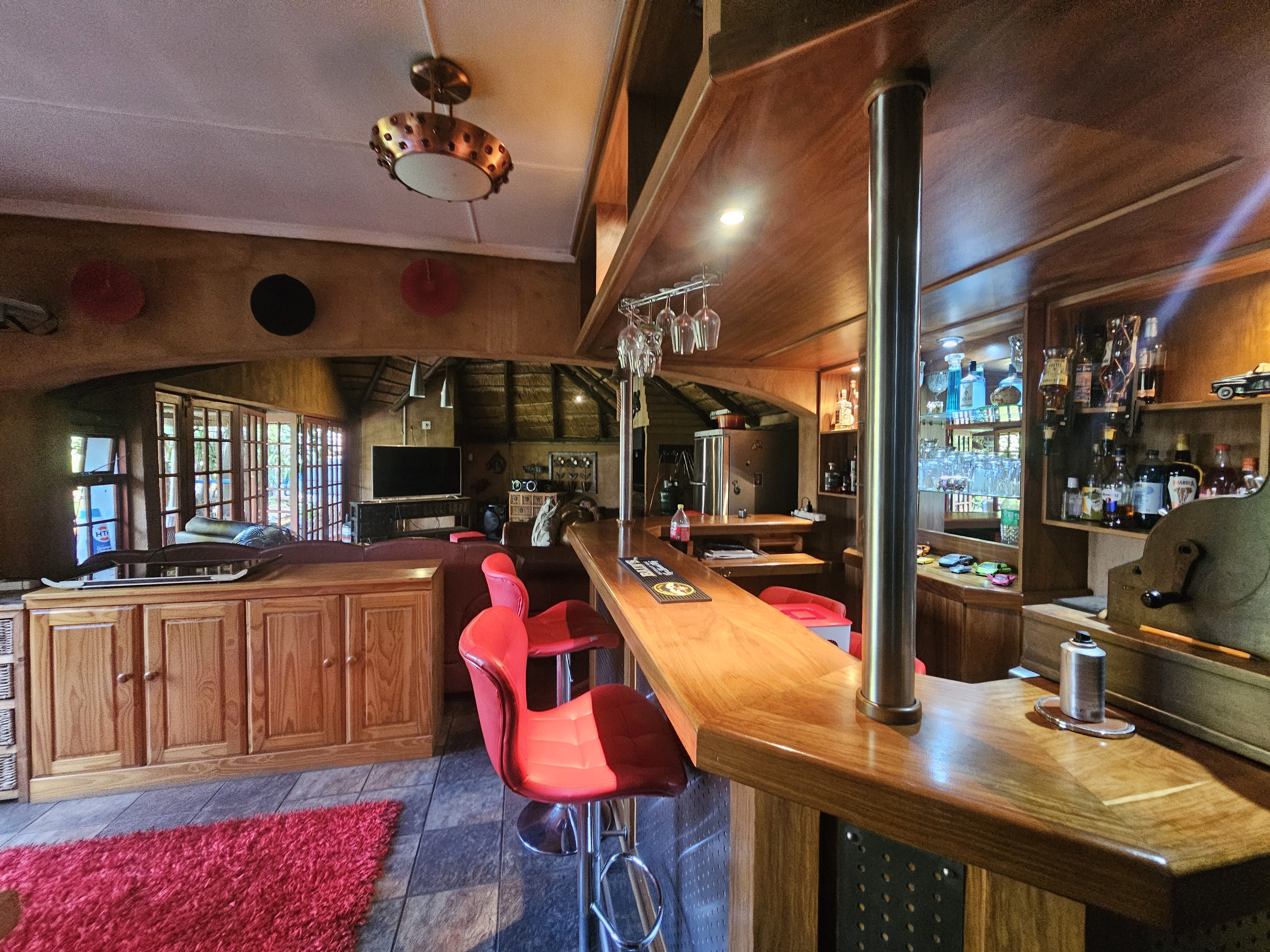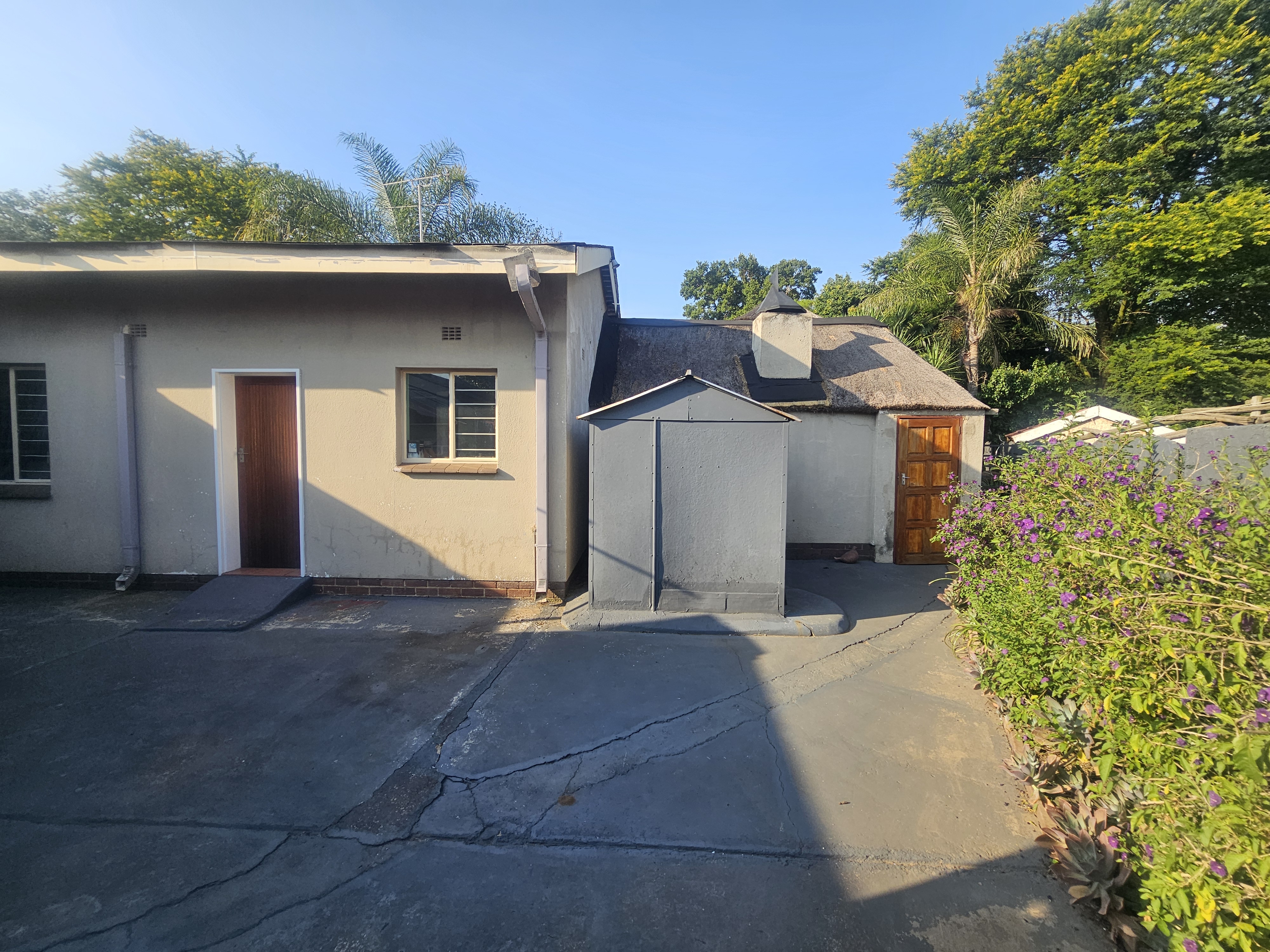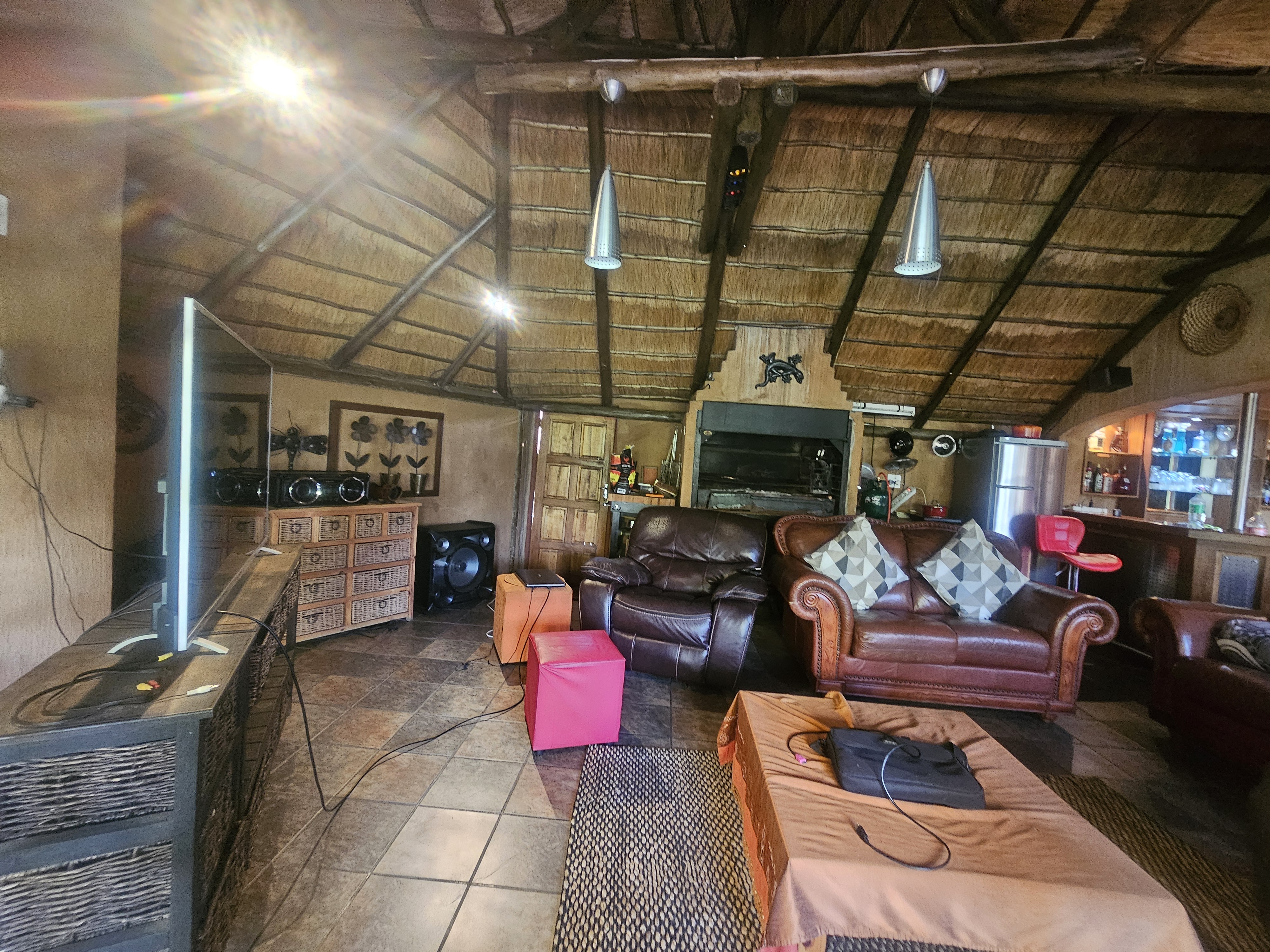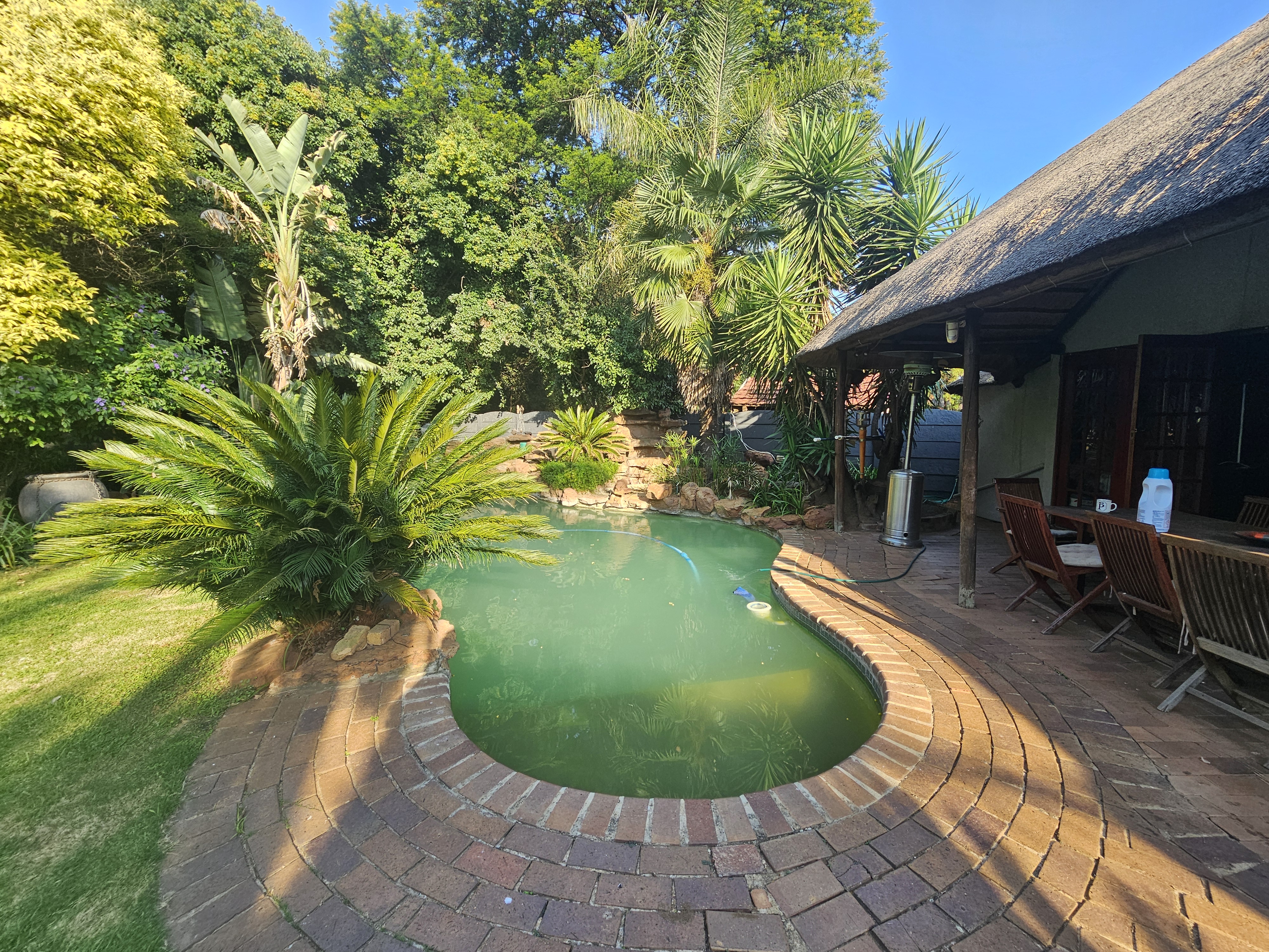 The home boasts a formal dining room, TV room, and a cozy lounge with a fireplace that opens onto a beautifully maintained garden. Outdoor living is enhanced by a spacious patio, a lapa with a yellowwood bar, a built-in braai, and a sparkling swimming pool—perfect for entertaining family and guests. A Flatlet with a bedroom and bathroom.