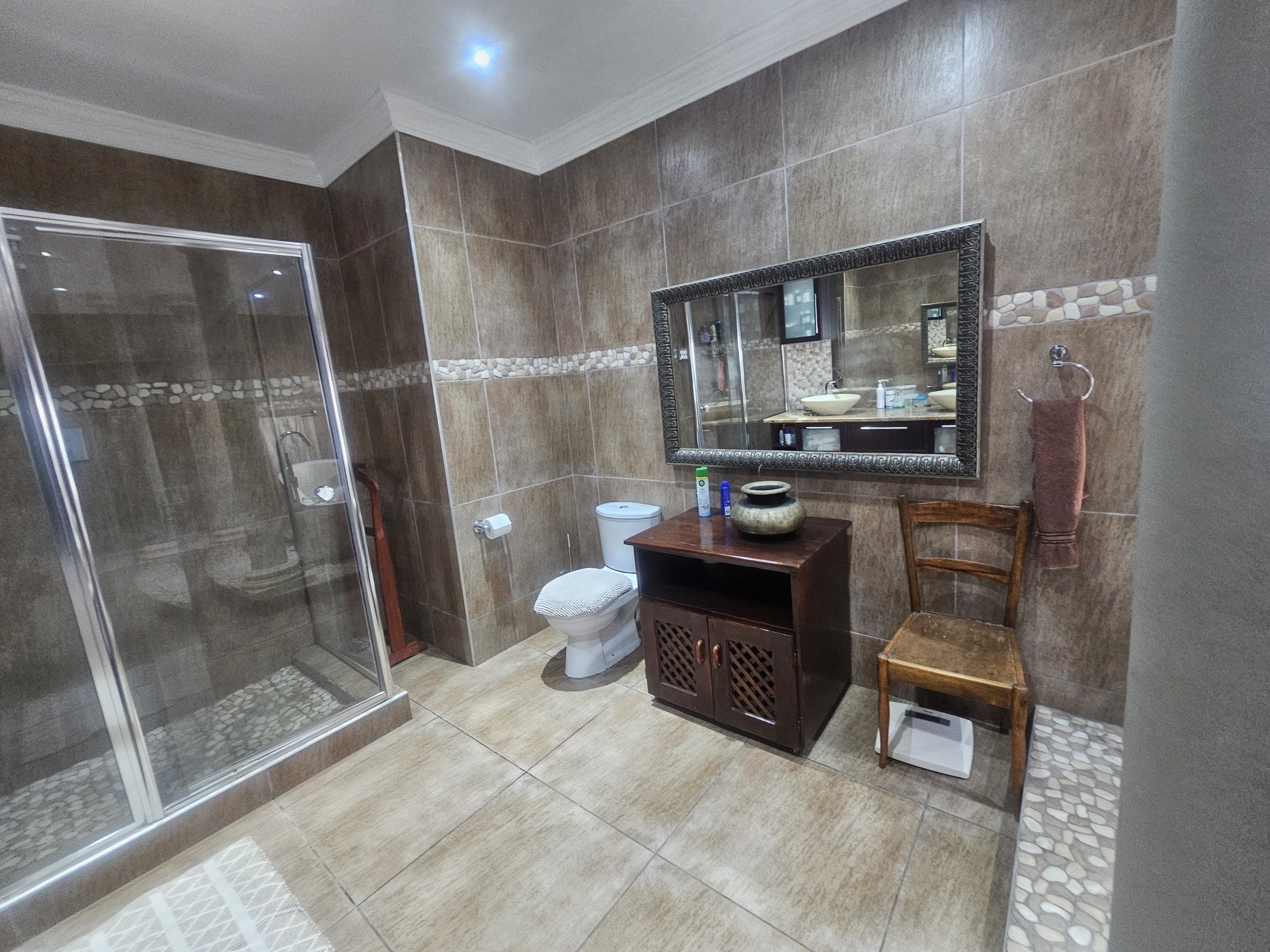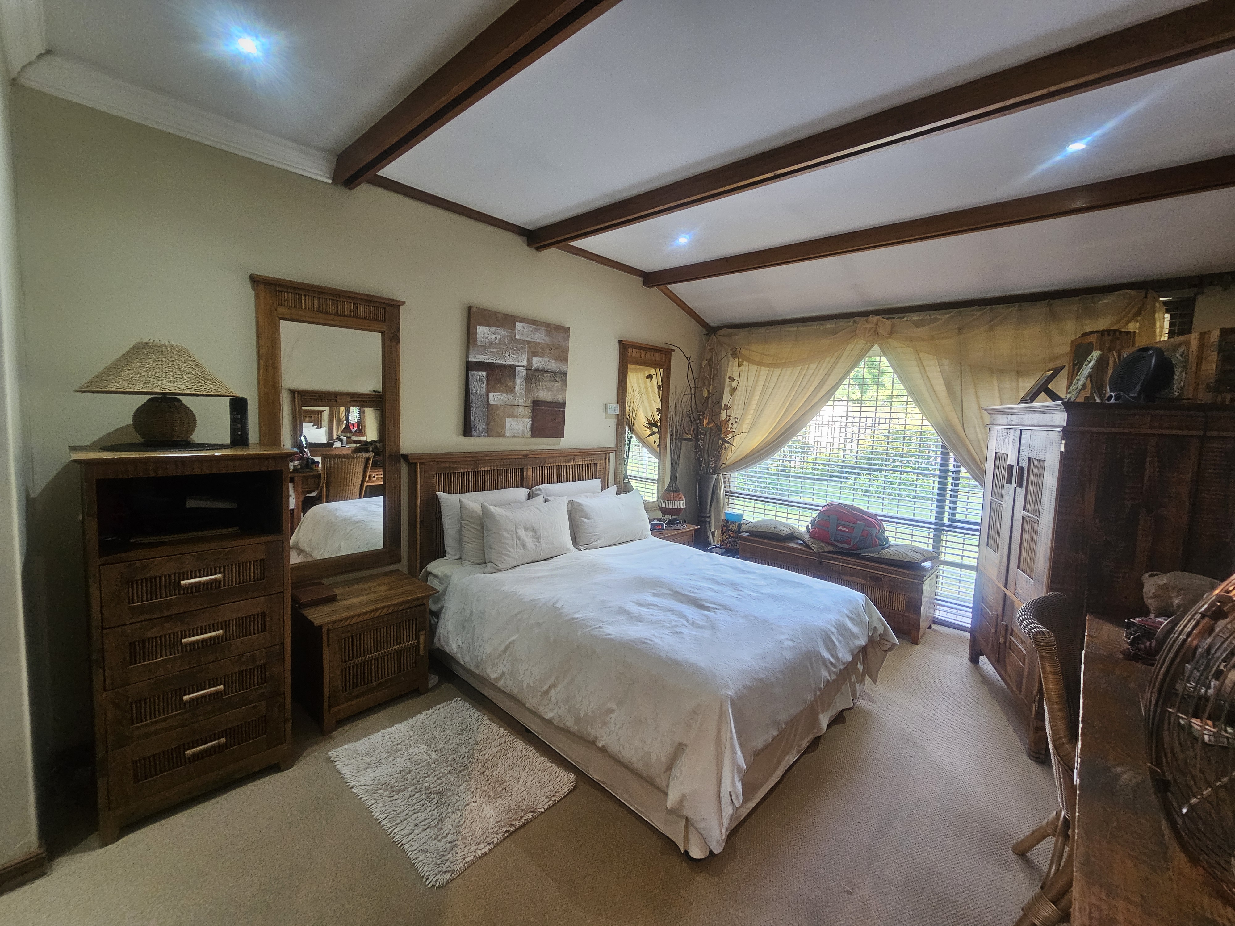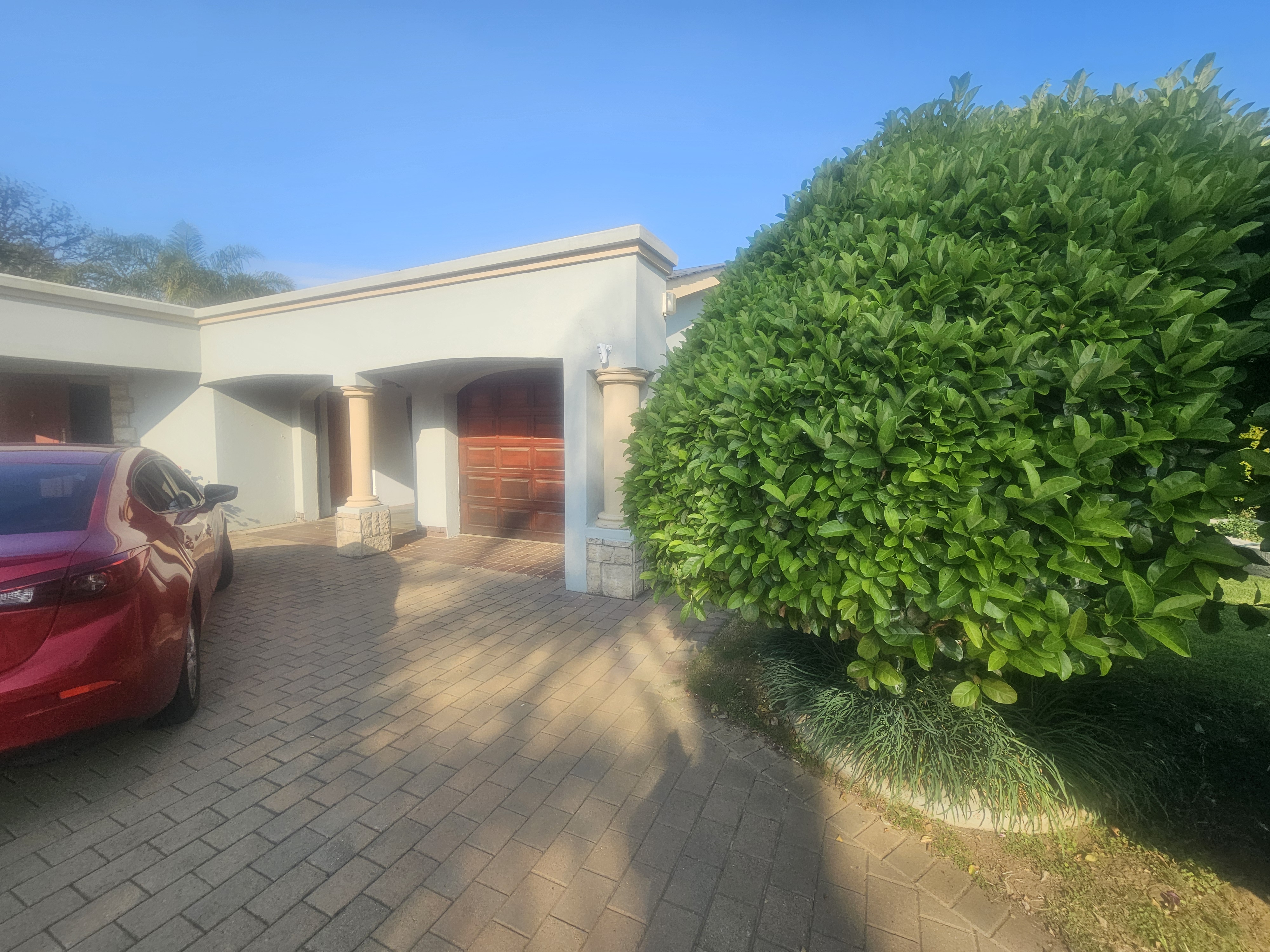 Additional features include a double garage, a separate carport with ample parking space, and a beautifully landscaped garden equipped with a borehole connected to a sprinkler system. The property is also fitted with a generator connected to the home, ensuring an uninterrupted power supply.