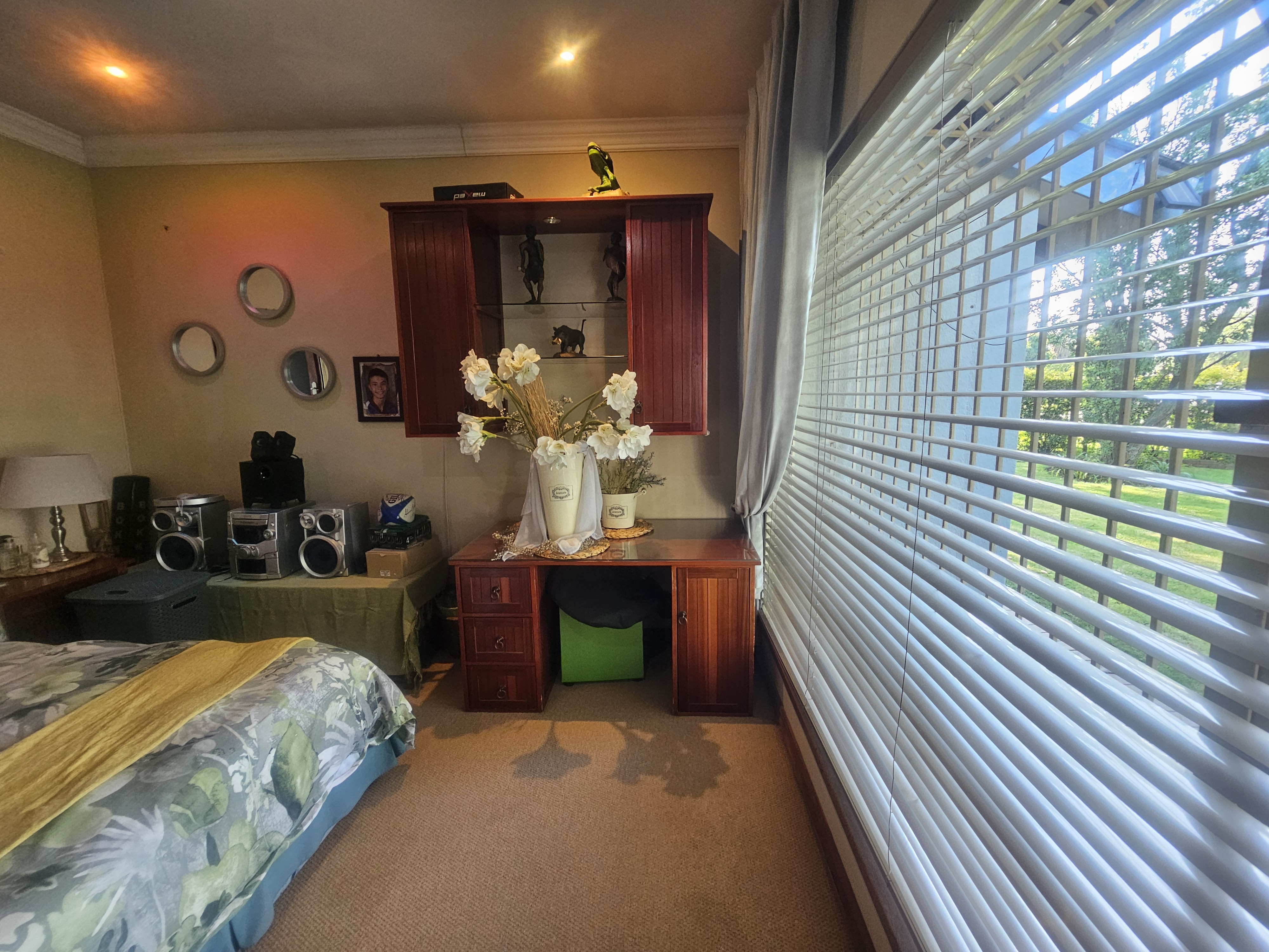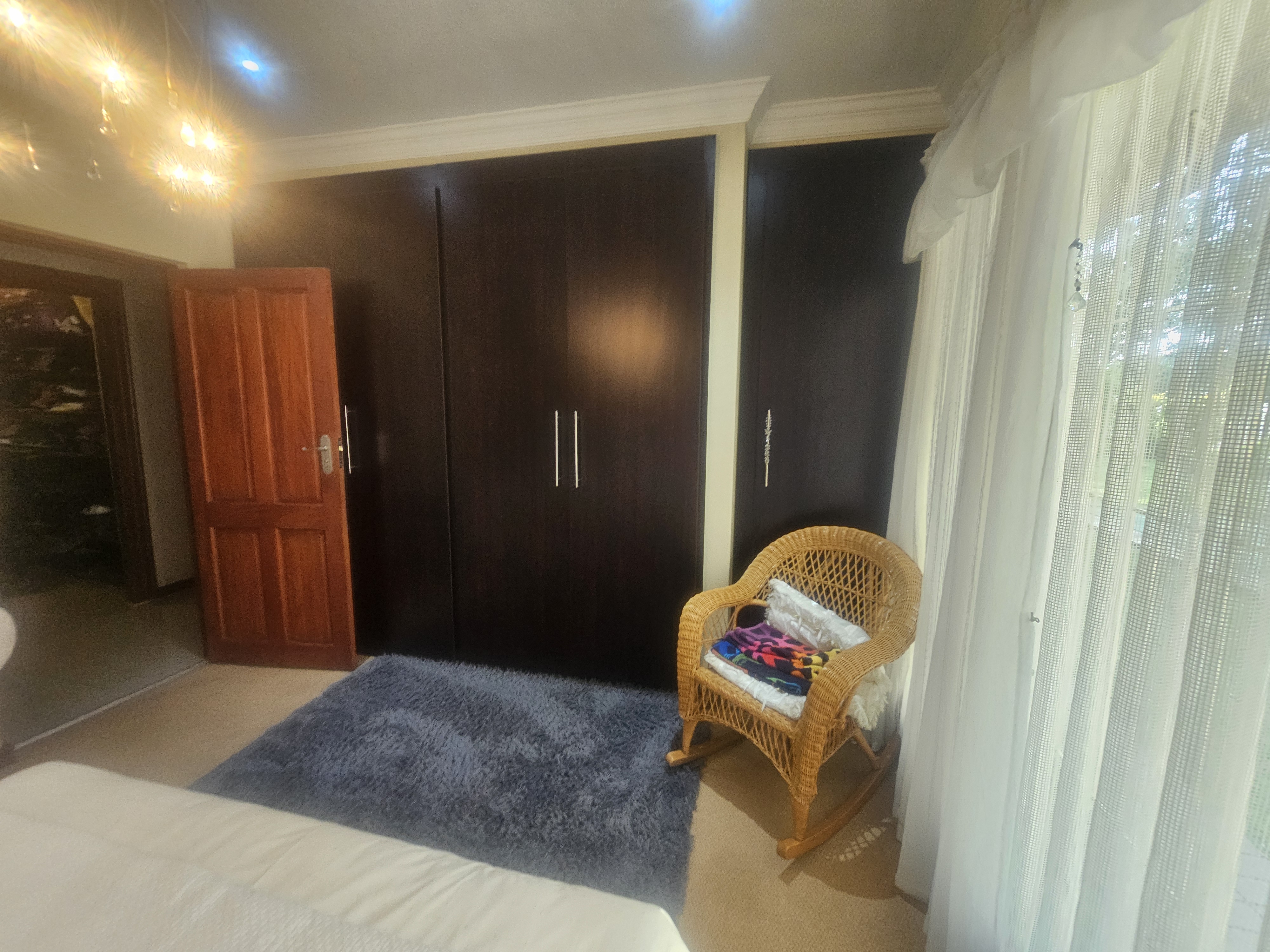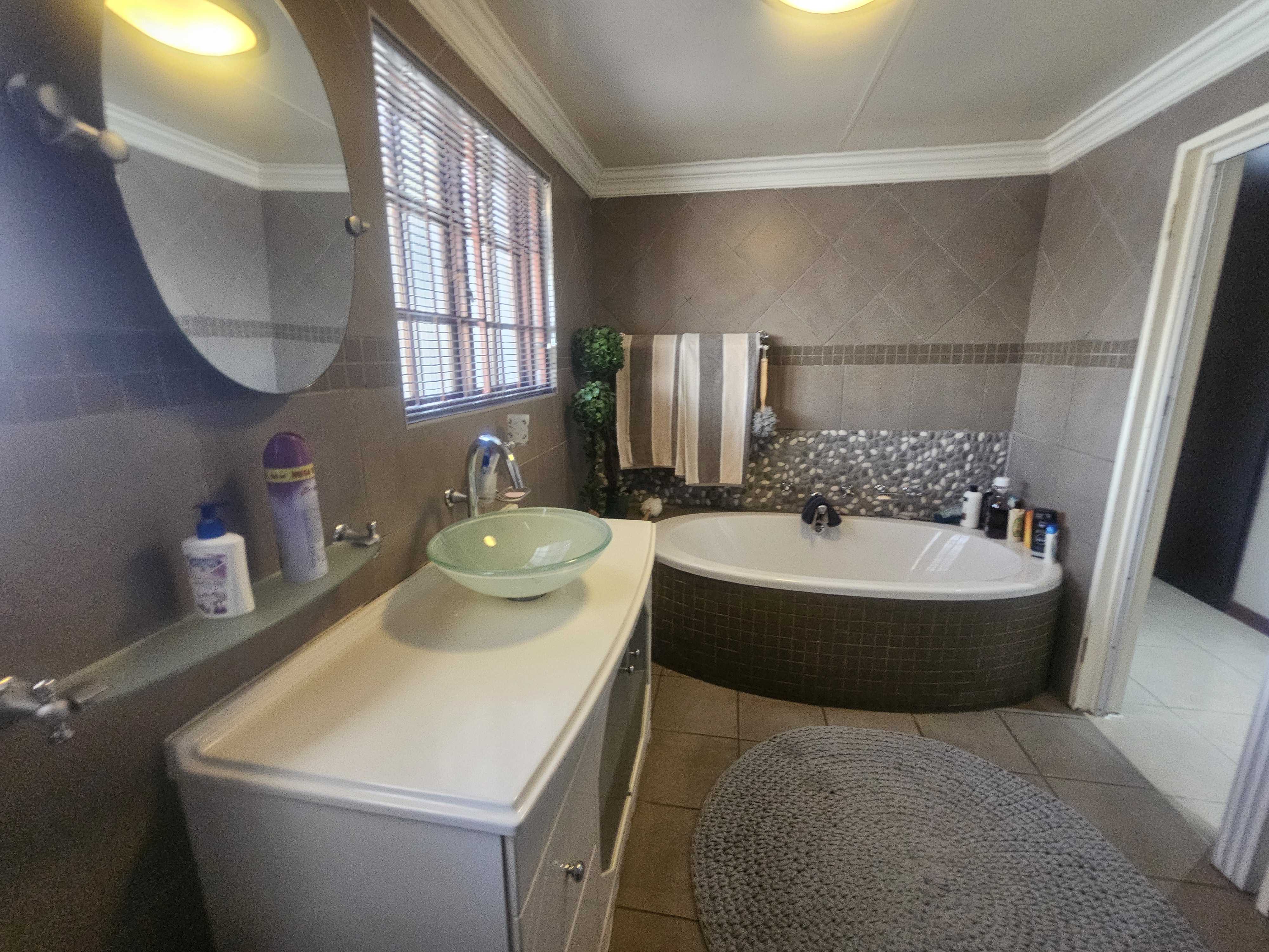 Additional features include a double garage, a separate carport with ample parking space, and a beautifully landscaped garden equipped with a borehole connected to a sprinkler system. The property is also fitted with a generator connected to the home, ensuring an uninterrupted power supply.