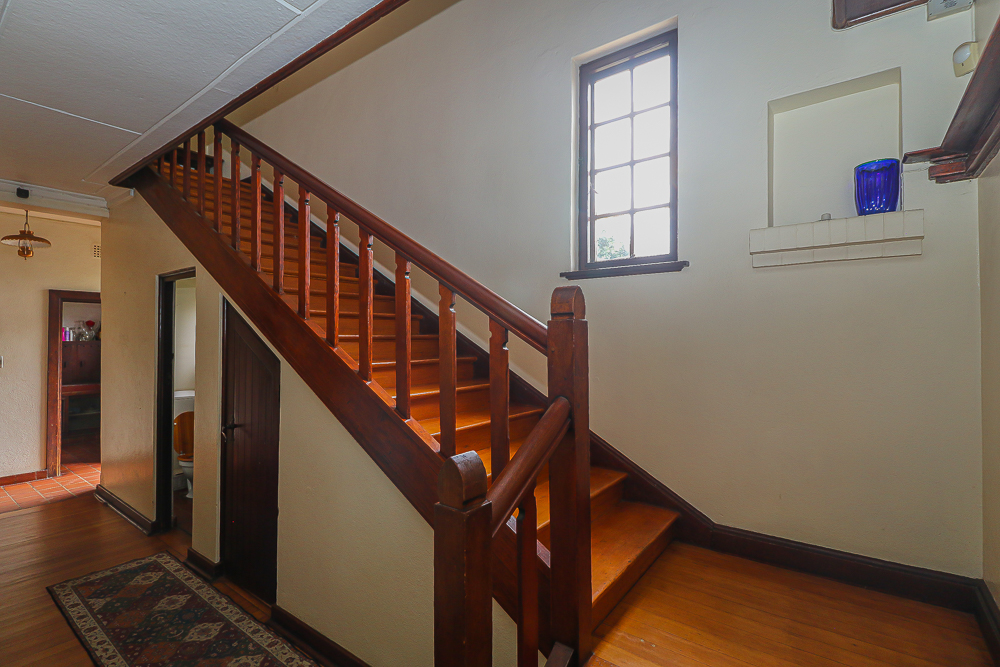 The moment you enter, you’re welcomed by polished wooden floors and a grand staircase that immediately capture your attention. The craftsmanship is undeniable — from the rich teak bannisters to what appears to be Oregon pine or yellowwood flooring — each detail lovingly maintained to preserve its natural beauty.