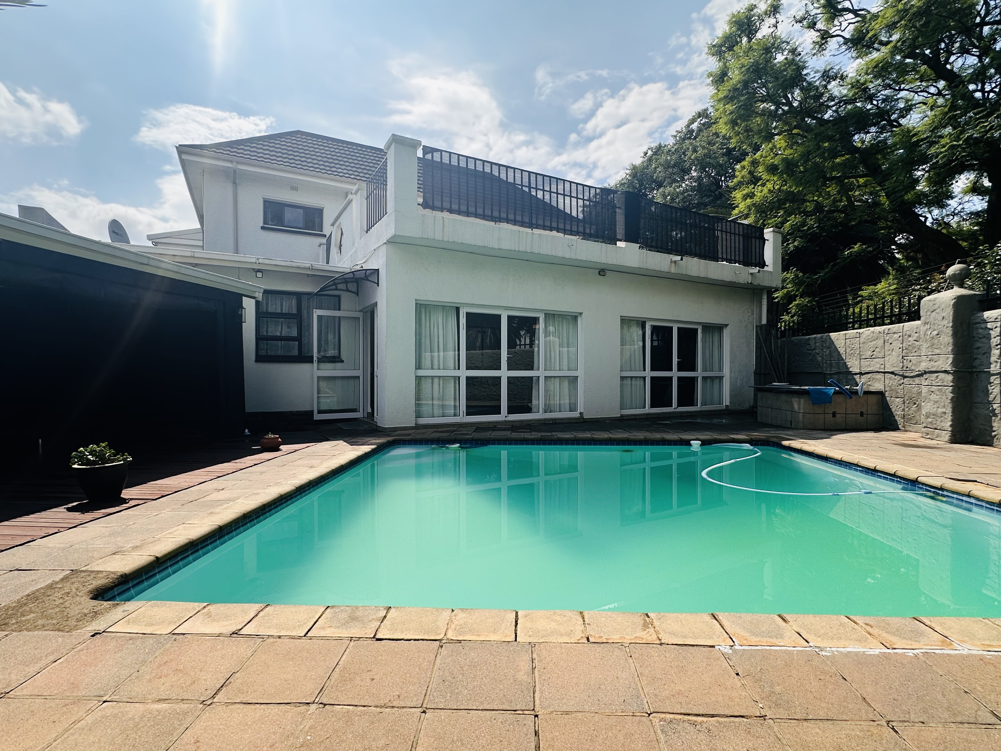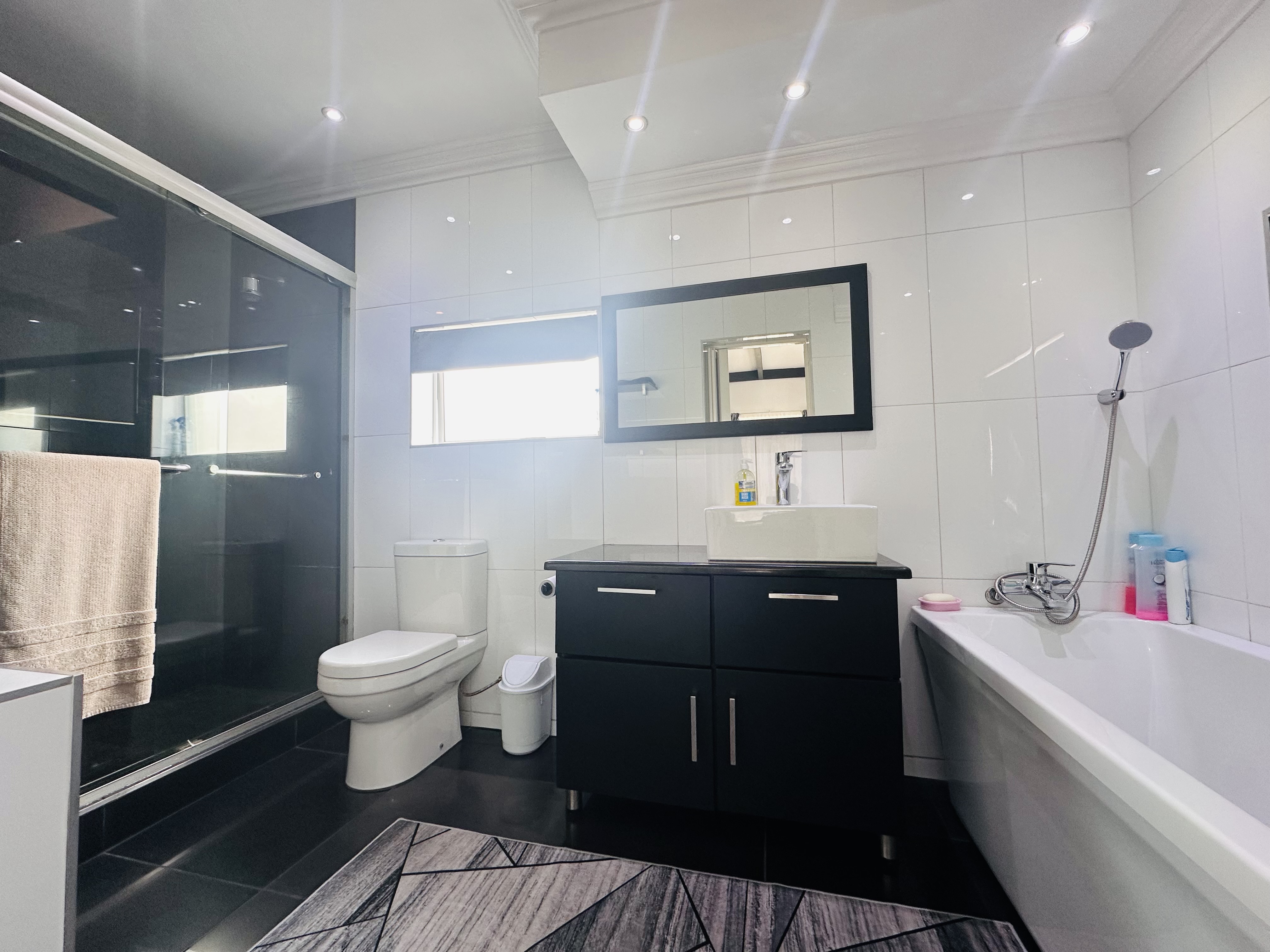 The outdoor entertainment area boasts a 4-seater jacuzzi overlooking the sparkling pool, a fully enclosed entertainment space with surround sound, a gas-built-in braai, and a stylish built-in bar that opens up to the pool area. Inside, you’ll find a spacious lounge with underfloor heating, a modern kitchen with granite countertops, ample cupboard space, a double oven, and a sleek 4-plate glass-top stove—perfect for any home chef. The main entrance welcomes you with a formal lounge with a fireplace (convertible to gas), a separate dining area, and a guest toilet for added convenience.