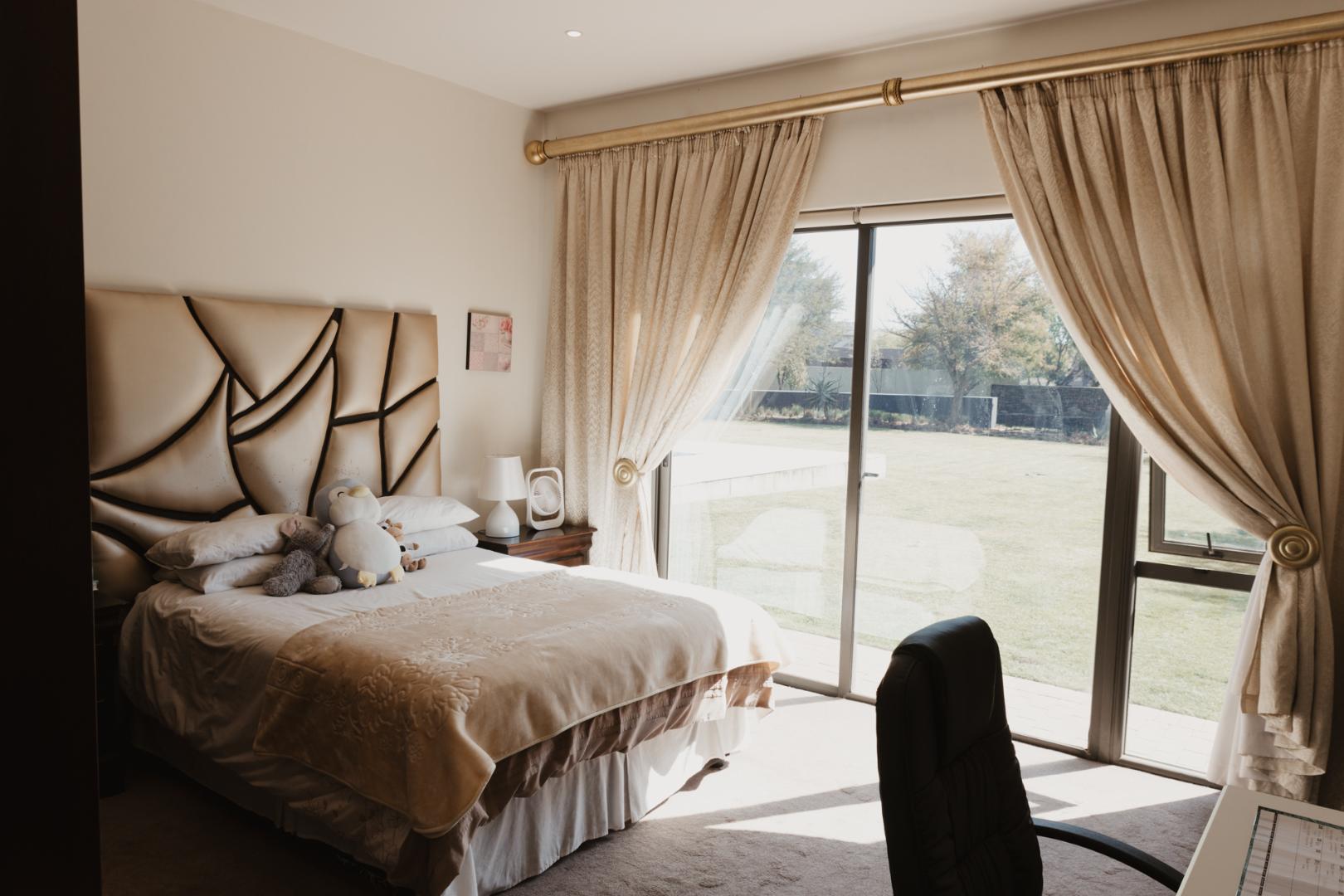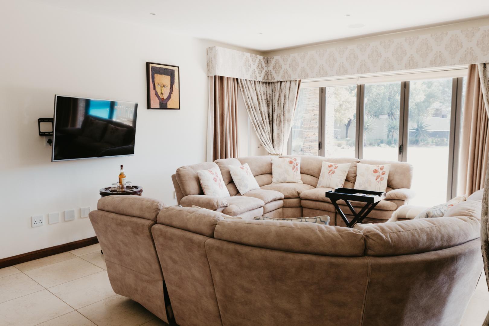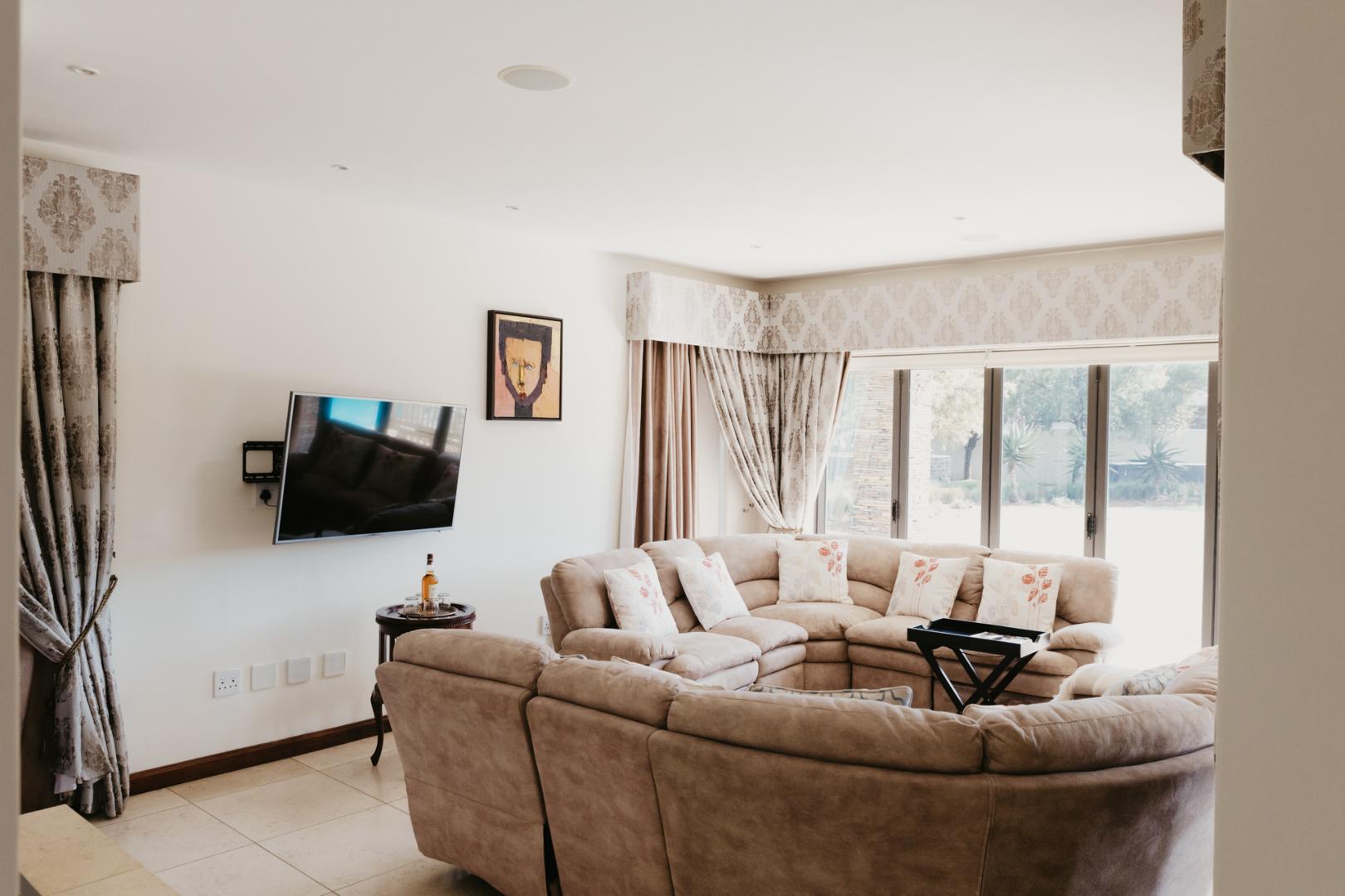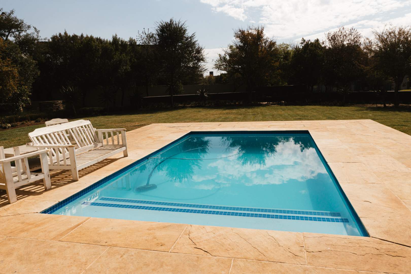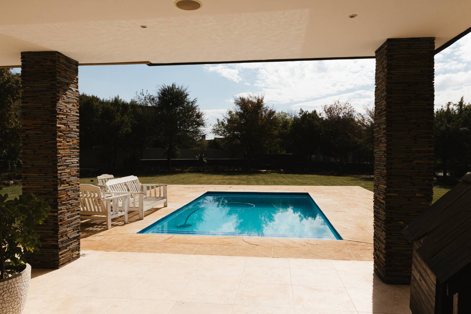 It also offers an integrated sound & technology system, a large covered patio with a build-in braai overlooking an inviting pool that is surrounded by a magnificent manicured lawn area. The opulent garden is simply a riot of color as the sunlight plays off the petals and leaves of the plants. The sound of birds and delightful mix of fragrance that is brought alive, that only Mother nature herself can create.