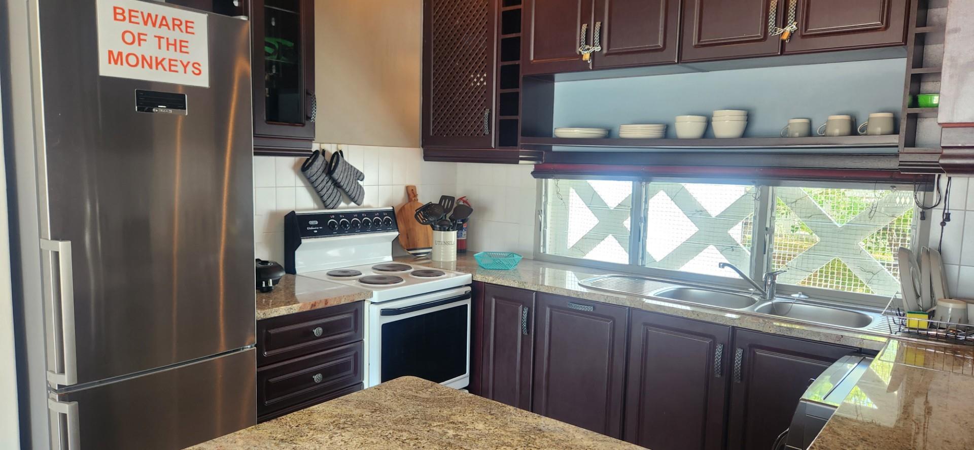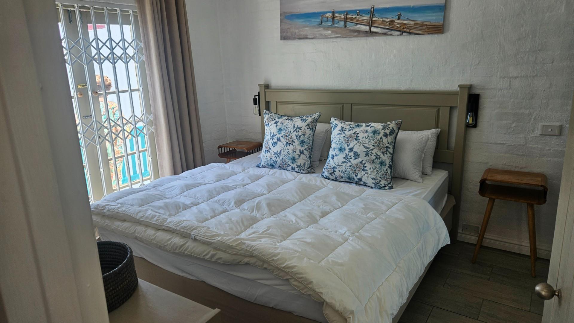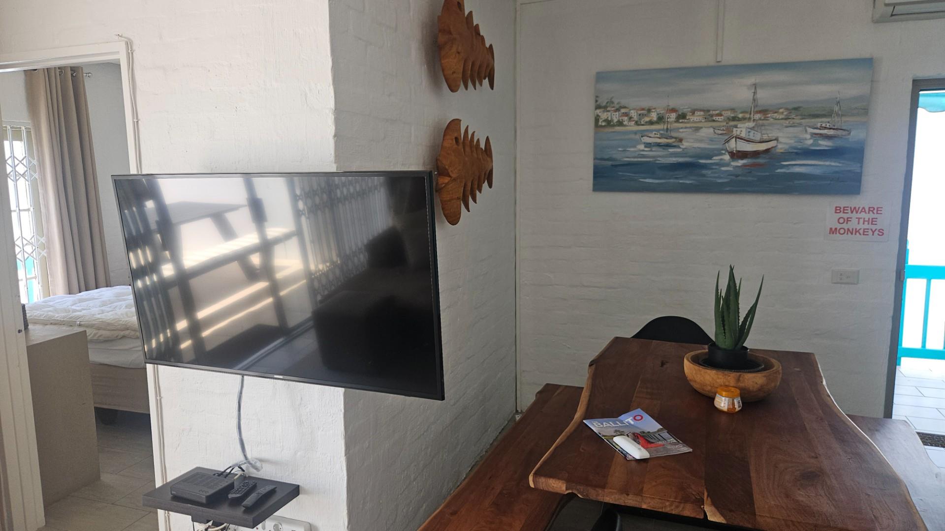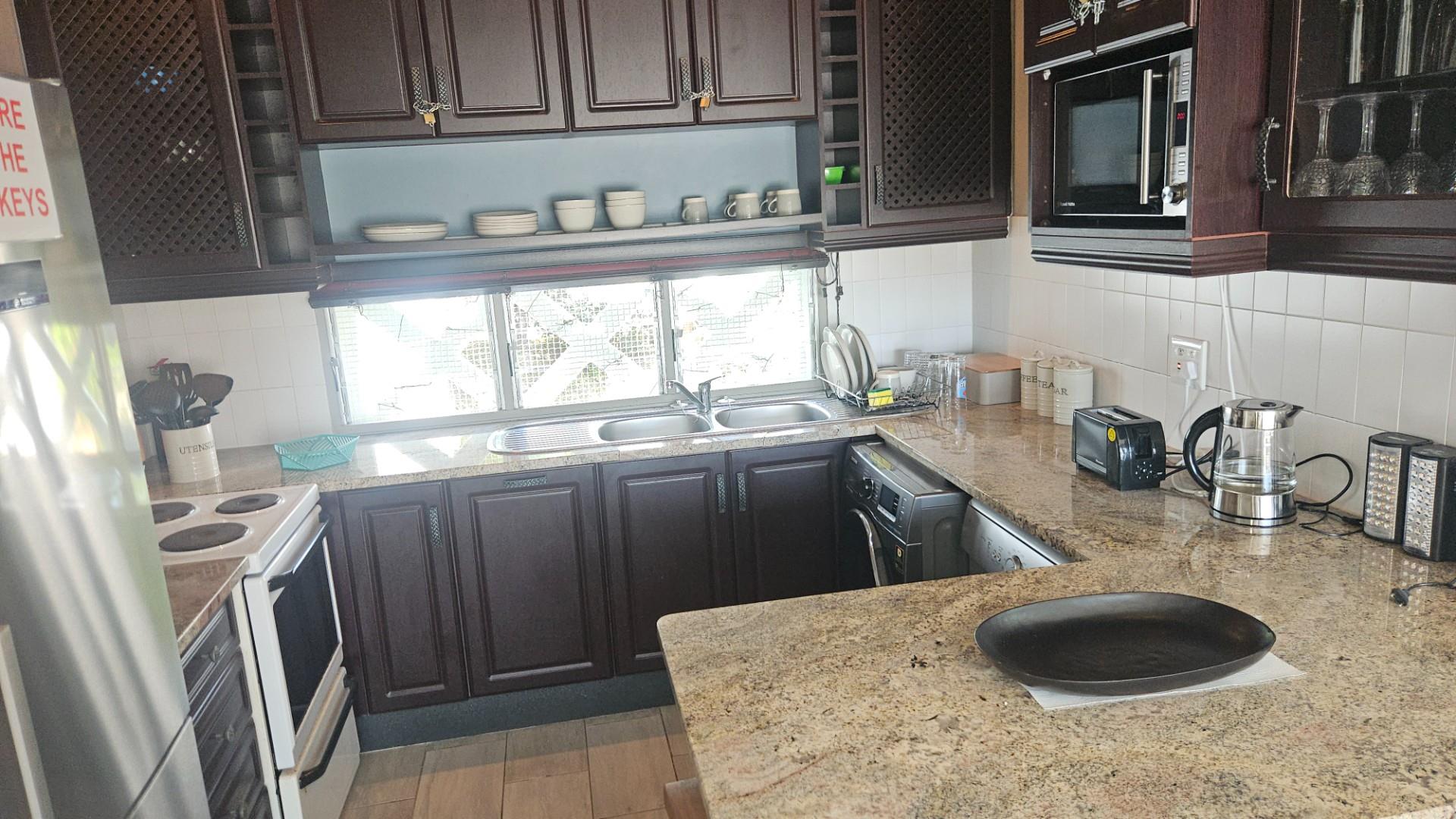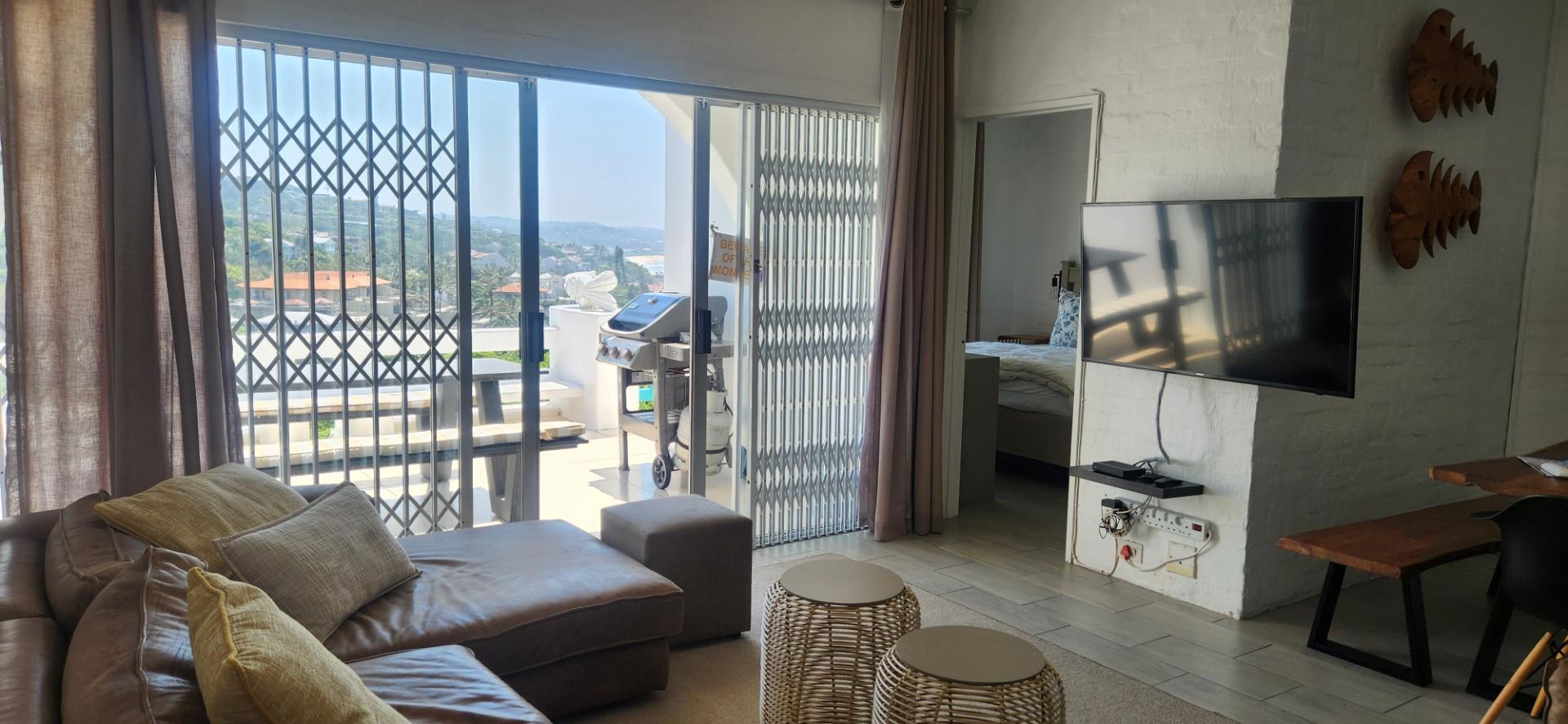 The apartment features two spacious bedrooms with built-in cupboards and is fully tiled throughout for easy, low-maintenance living. The open-plan lounge, dining, and kitchen area creates a comfortable and inviting living space, flowing effortlessly onto a generous sea-facing balcony. Here, there is ample room for a gas braai while you relax and take in breathtaking sunsets over the ocean. The kitchen is fitted with granite countertops, a standalone electric stove, and ample cupboard space, while the dining area is conveniently positioned alongside the lounge for easy entertaining.