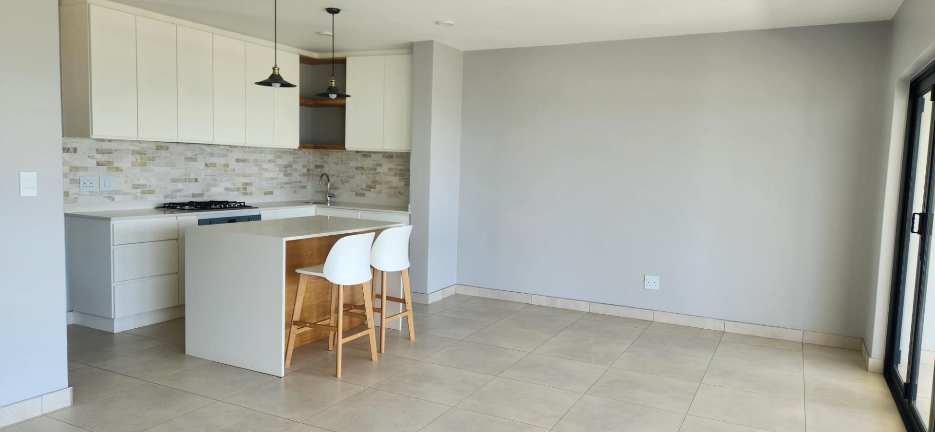 The spacious open-plan lounge and dining area flow seamlessly into a modern kitchen fitted with granite countertops, ample cupboard space, and a convenient breakfast counter. Culinary enthusiasts will appreciate the gas five-plate burners paired with electric Smeg oven and hobs, delivering both performance and elegance. A separate scullery accommodates three appliances and leads out to a generously sized private courtyard, adding practicality to the home’s thoughtful design.