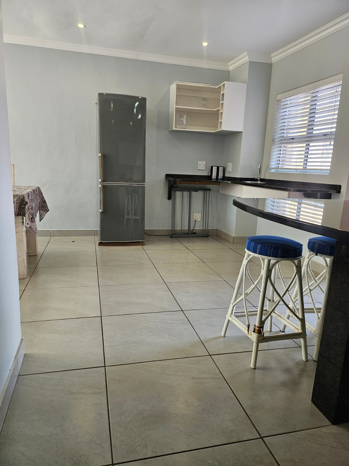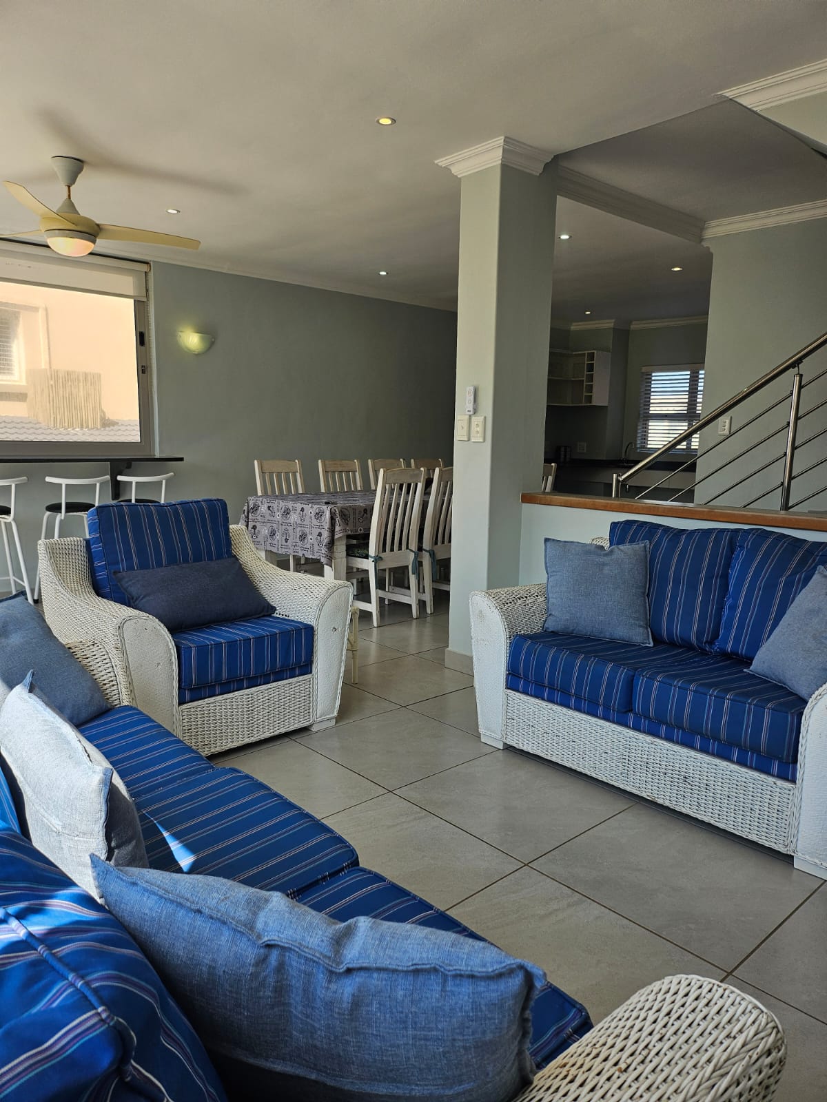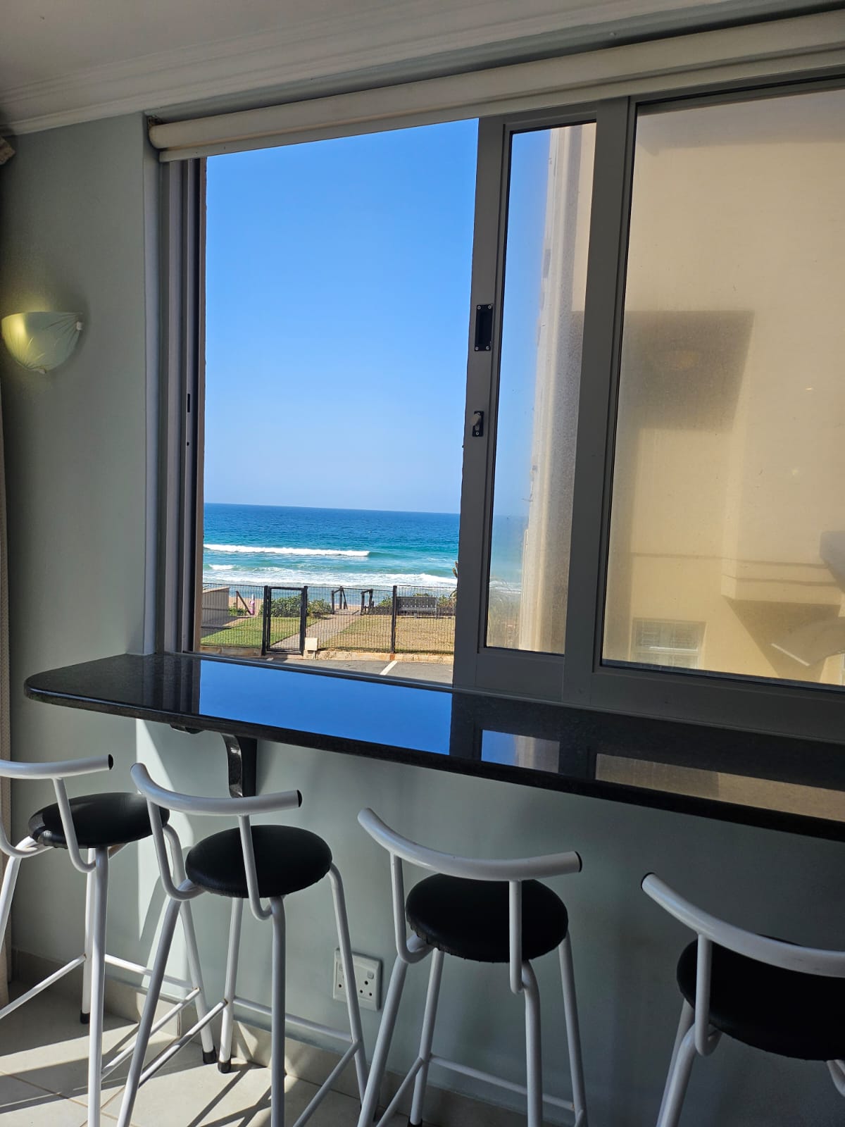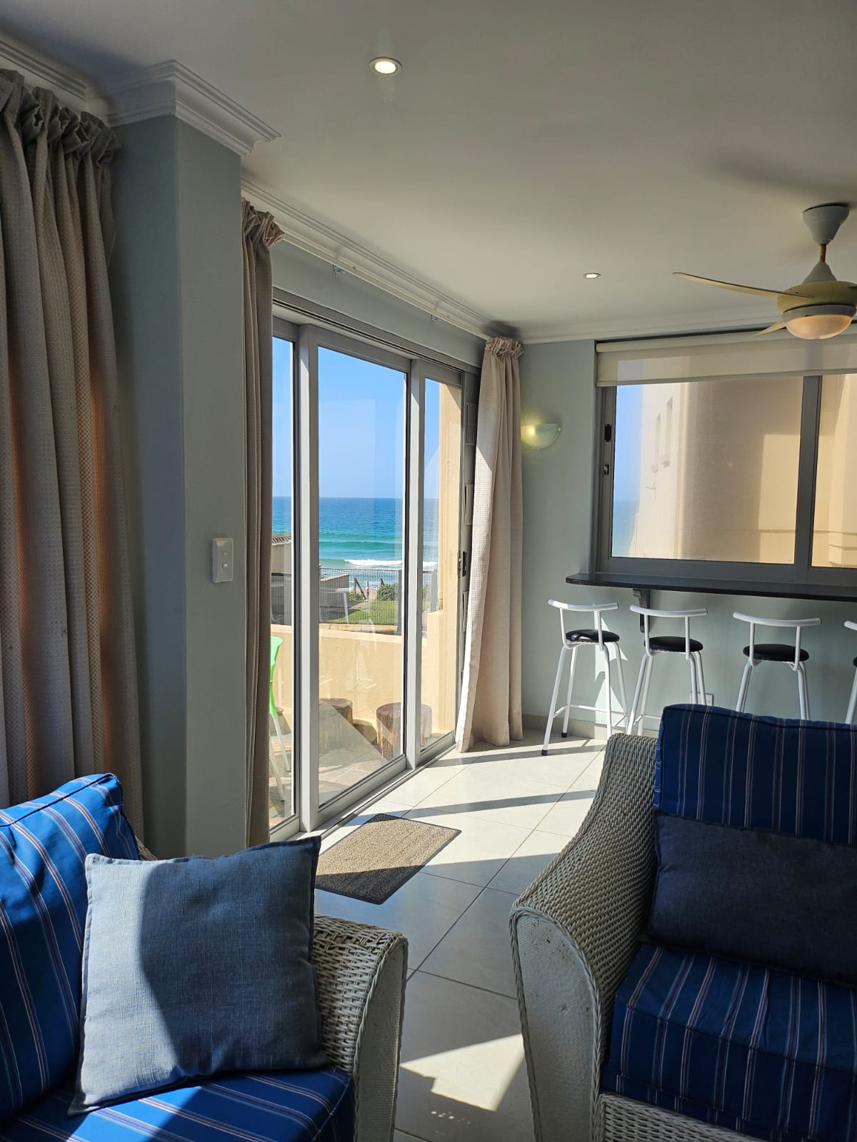 The light-filled open-plan living area is designed to maximize natural light, featuring an expansive picture window, sliding glass doors, and a serving hatch above the cocktail bar that frames stunning ocean views. The lounge flows seamlessly to a sunny outdoor patio with a built-in braai, creating an ideal space for entertaining while listening to the soothing sound of waves.