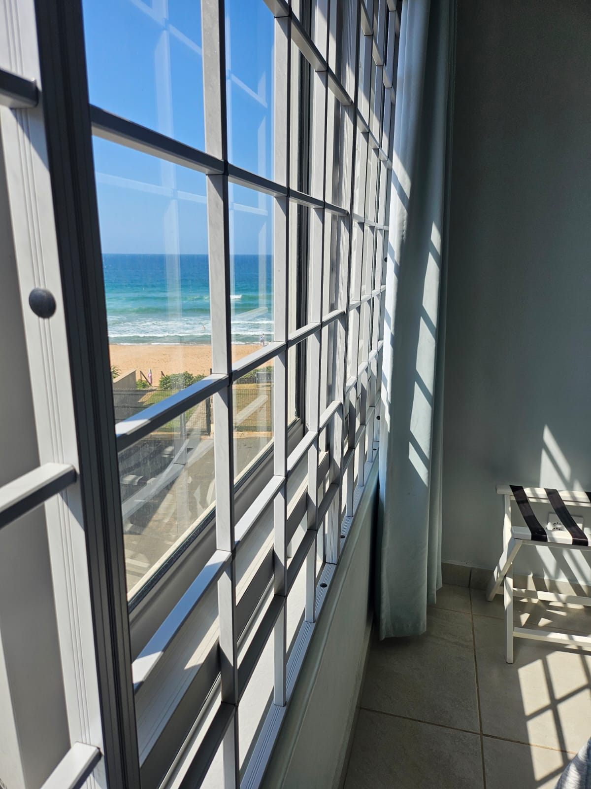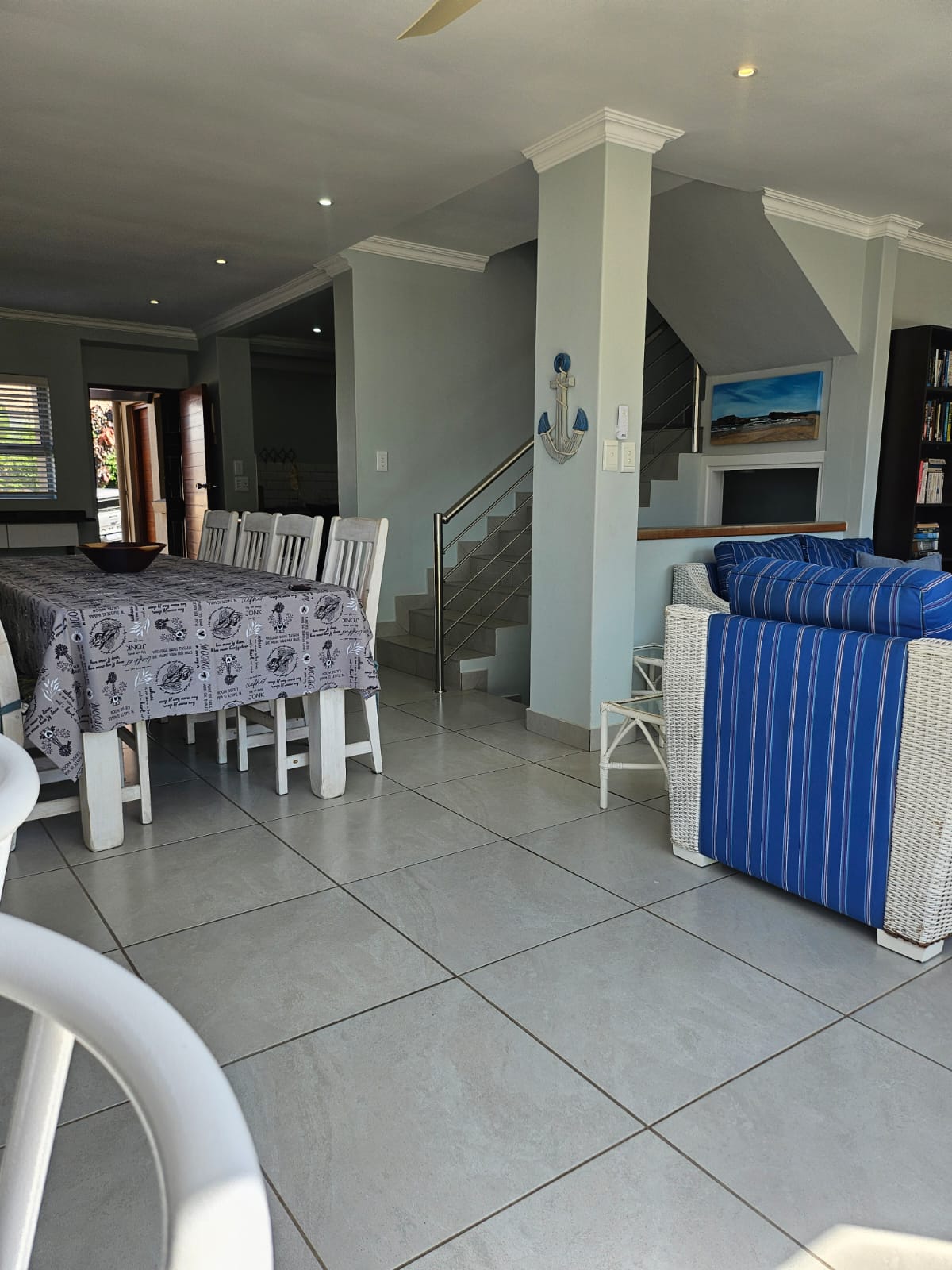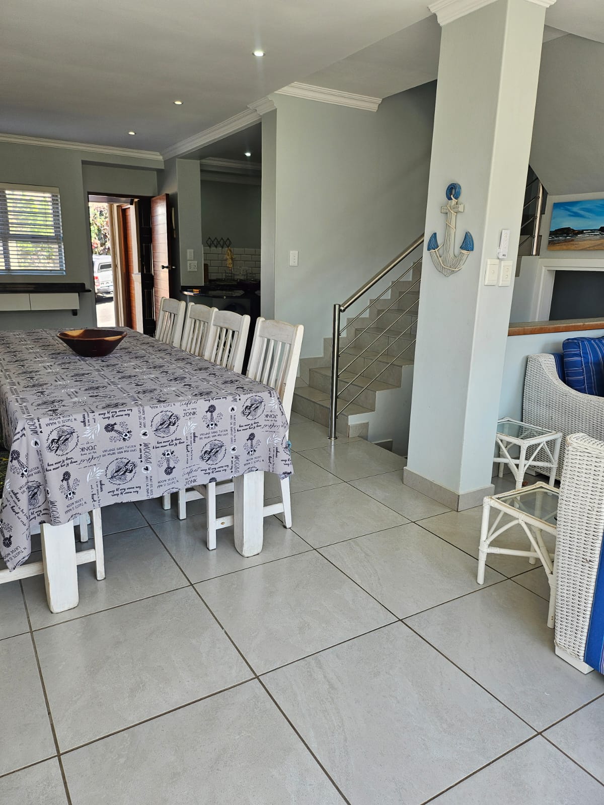 The light-filled open-plan living area is designed to maximize natural light, featuring an expansive picture window, sliding glass doors, and a serving hatch above the cocktail bar that frames stunning ocean views. The lounge flows seamlessly to a sunny outdoor patio with a built-in braai, creating an ideal space for entertaining while listening to the soothing sound of waves.