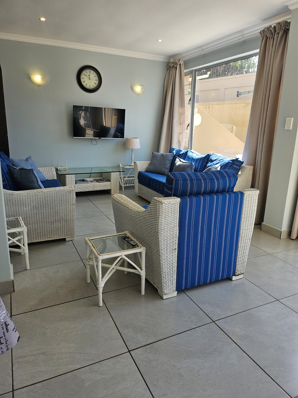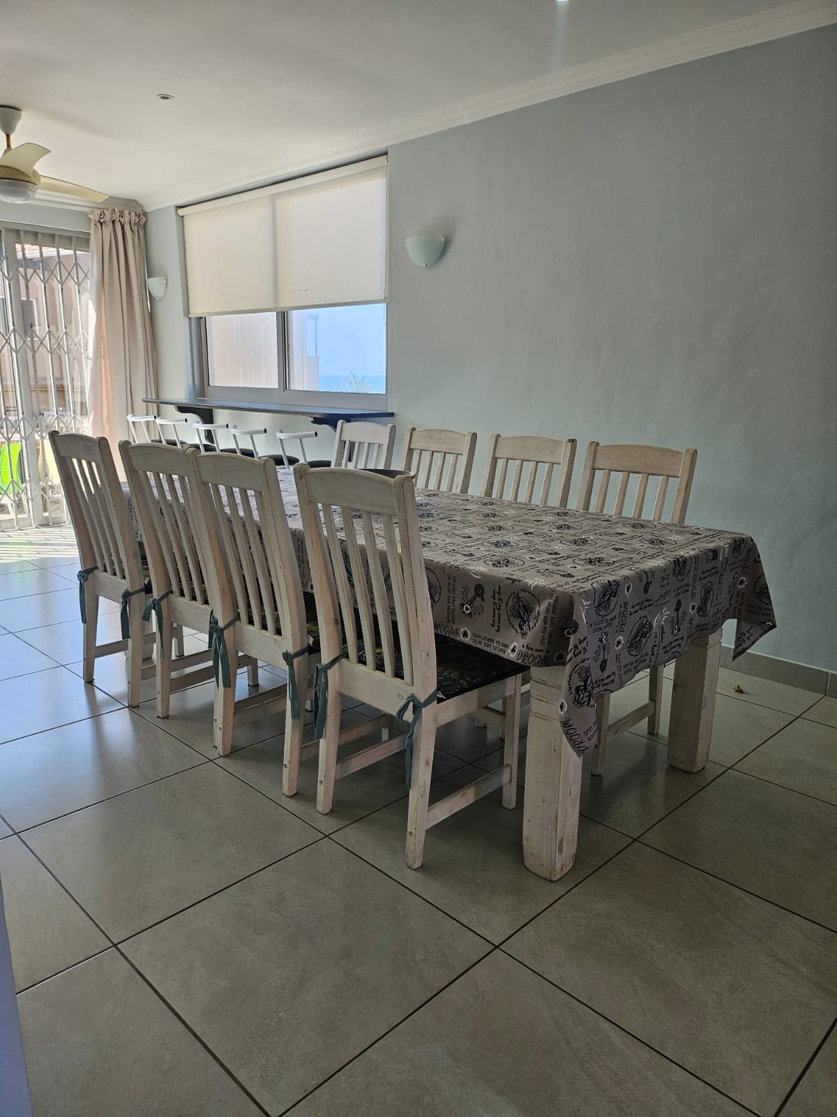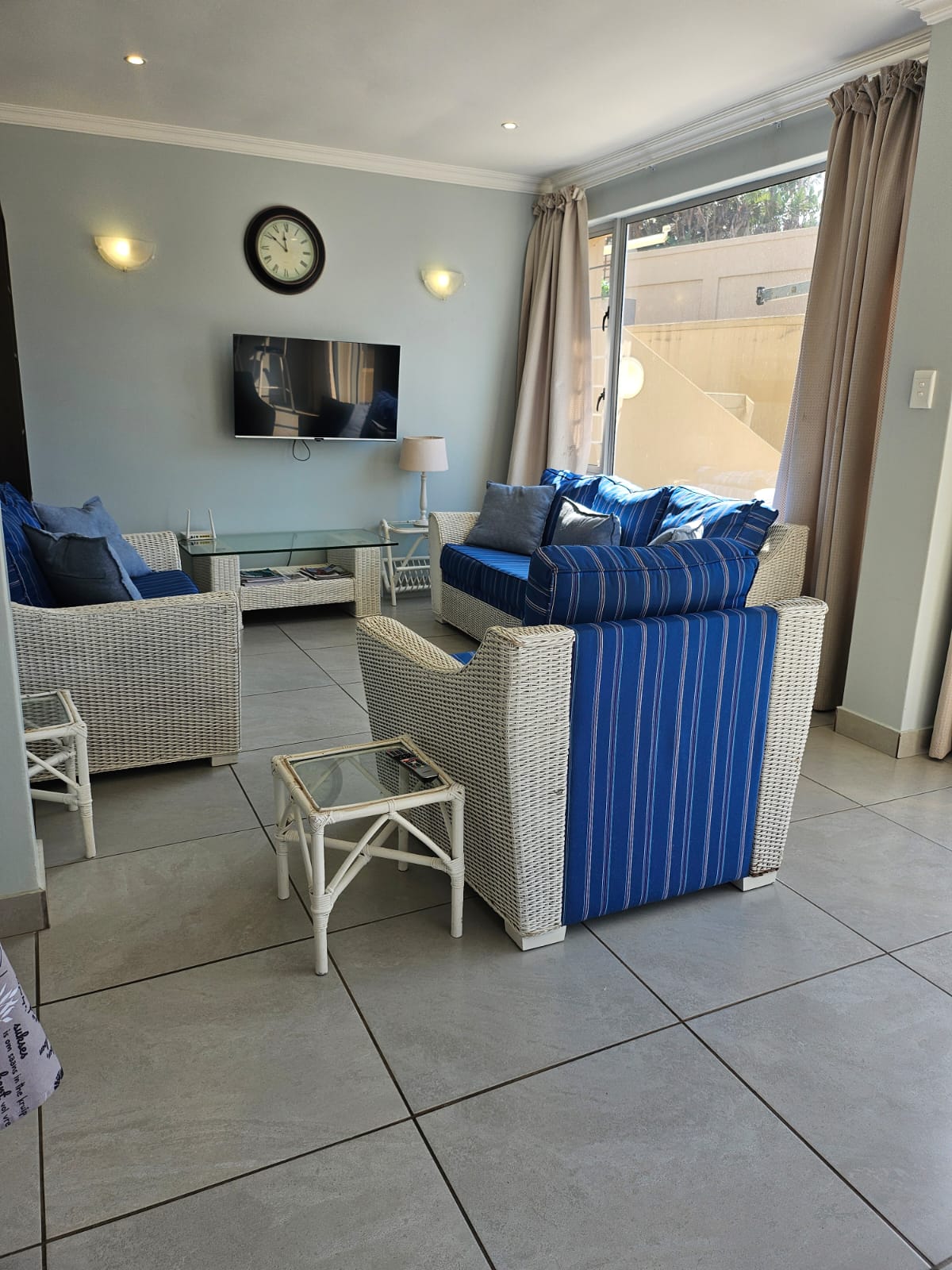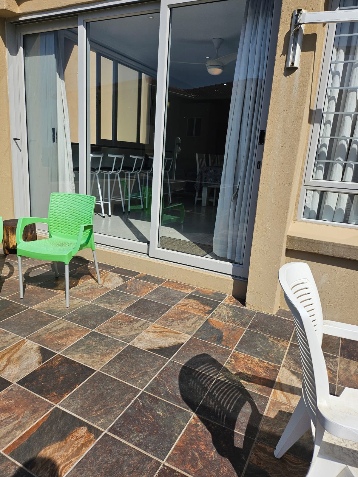 The light-filled open-plan living area is designed to maximize natural light, featuring an expansive picture window, sliding glass doors, and a serving hatch above the cocktail bar that frames stunning ocean views. The lounge flows seamlessly to a sunny outdoor patio with a built-in braai, creating an ideal space for entertaining while listening to the soothing sound of waves.