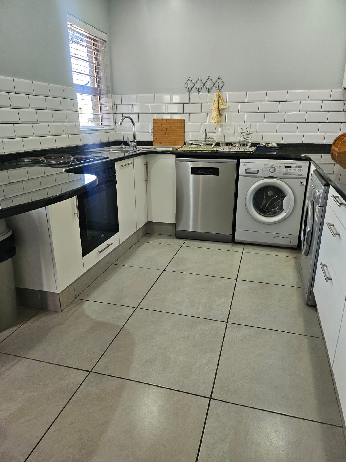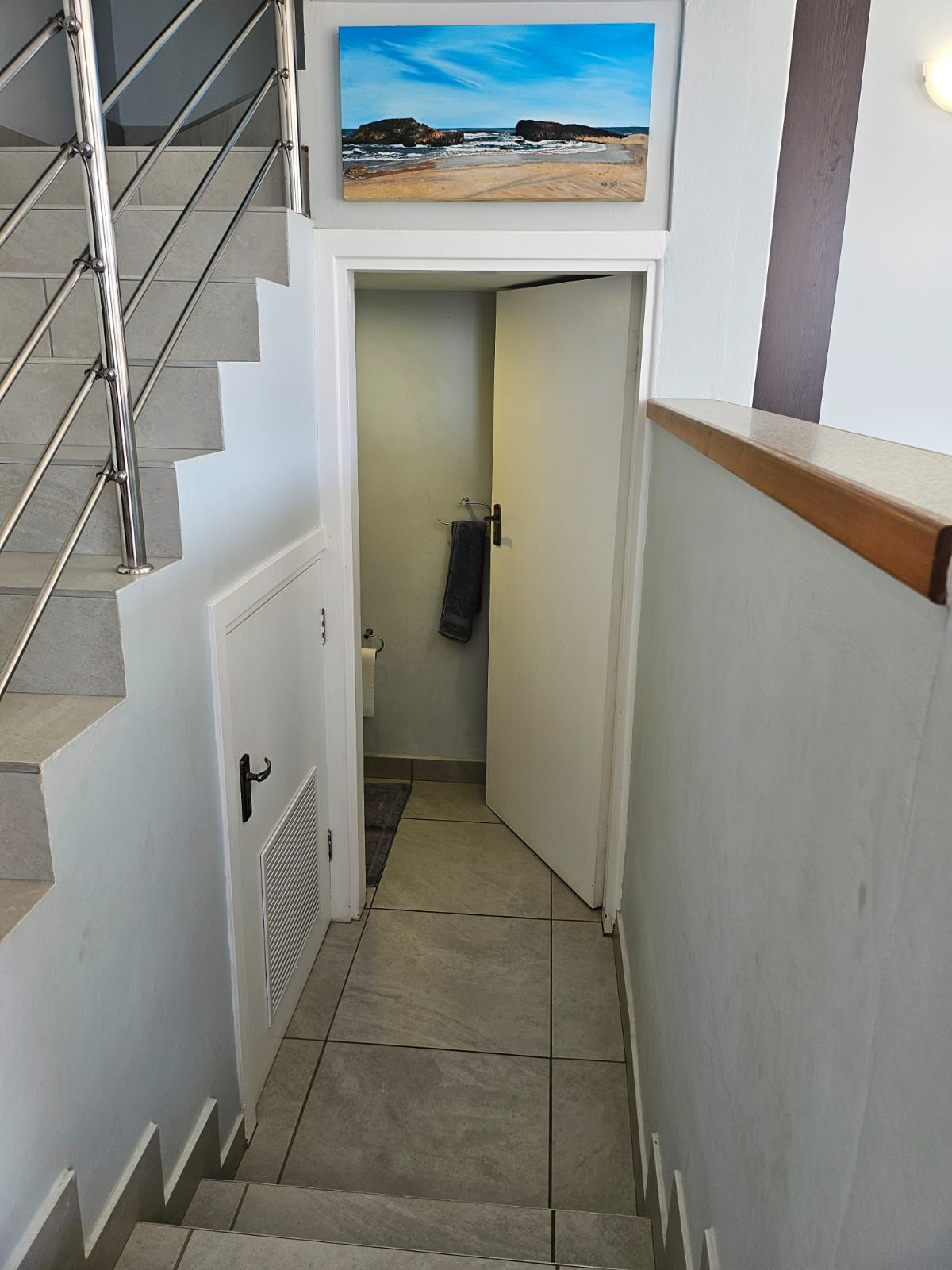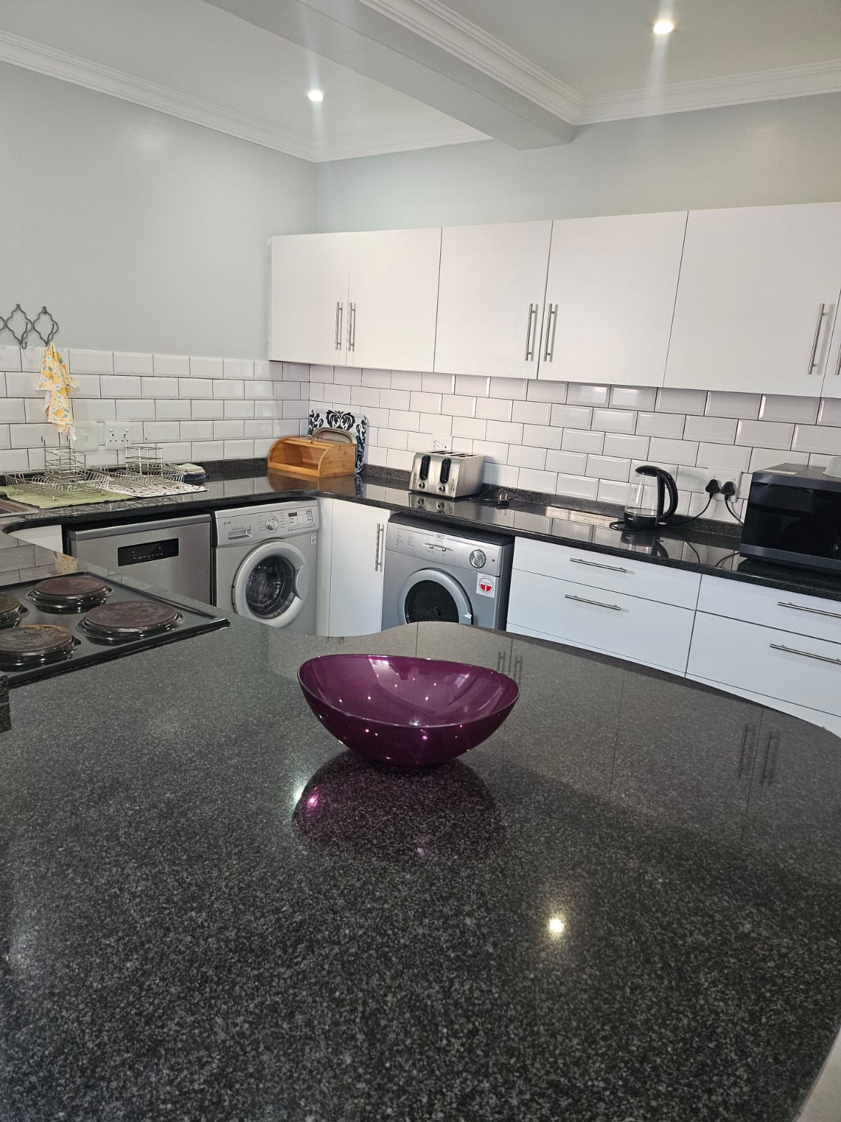 The modern kitchen is thoughtfully designed with generous counter space and room for three appliances, complemented by a separate drinks station and dedicated fridge space. A convenient guest toilet is also located on the lower level.