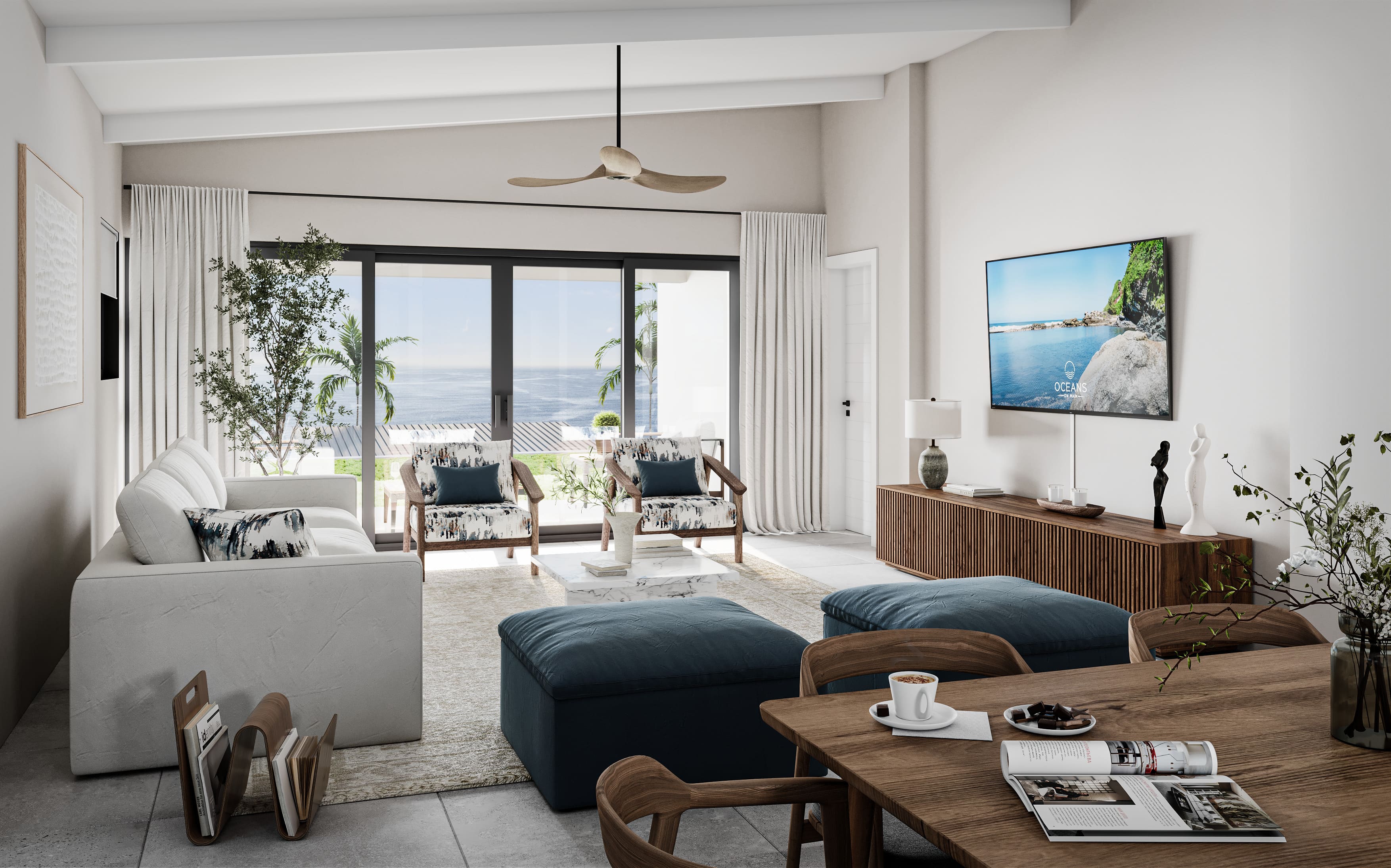 The generously sized master bedroom exhibits floor to ceiling windows, the same spectacular panoramic view of the ocean, ample closet space and a stylish en-suite bathroom.