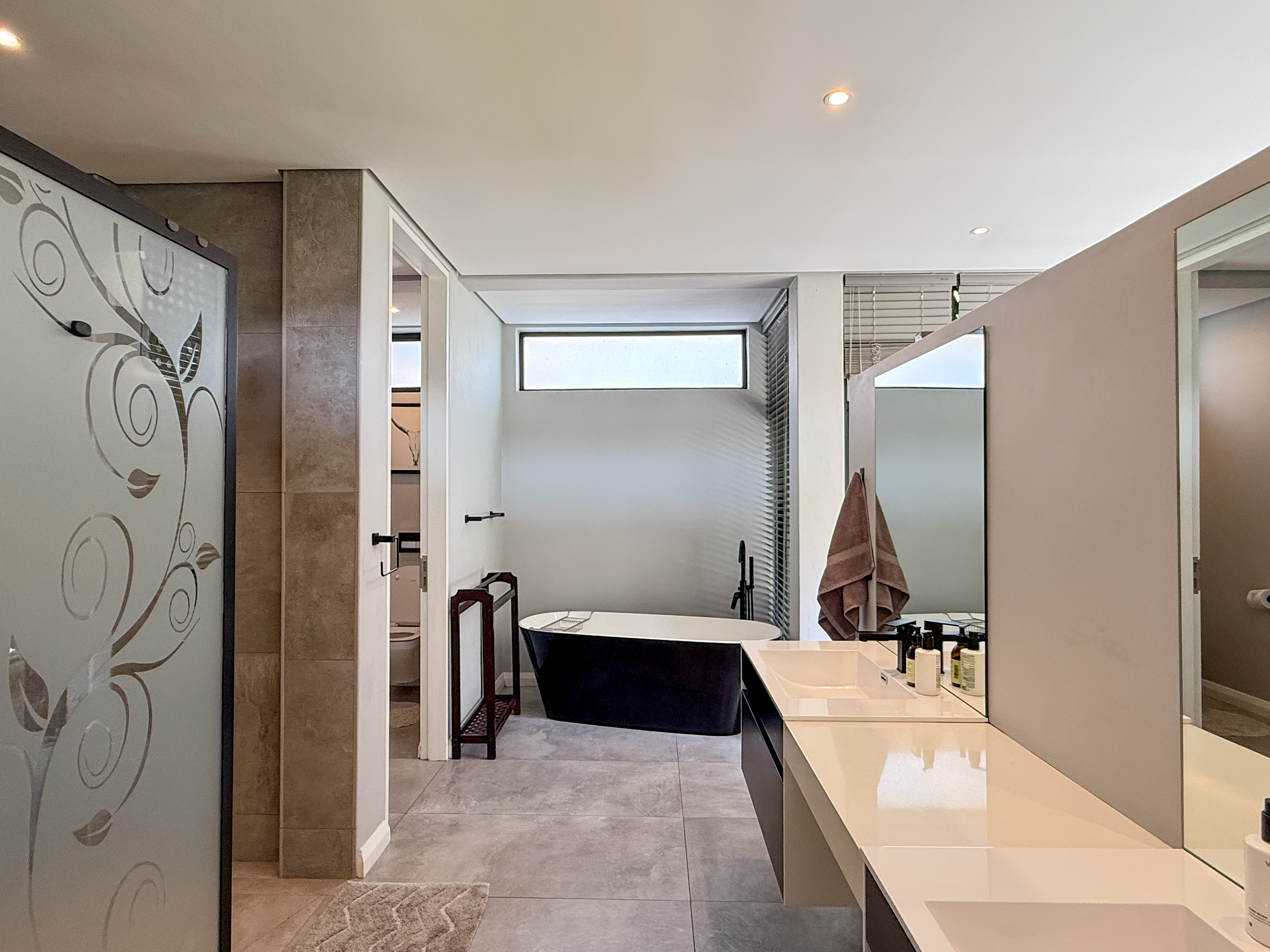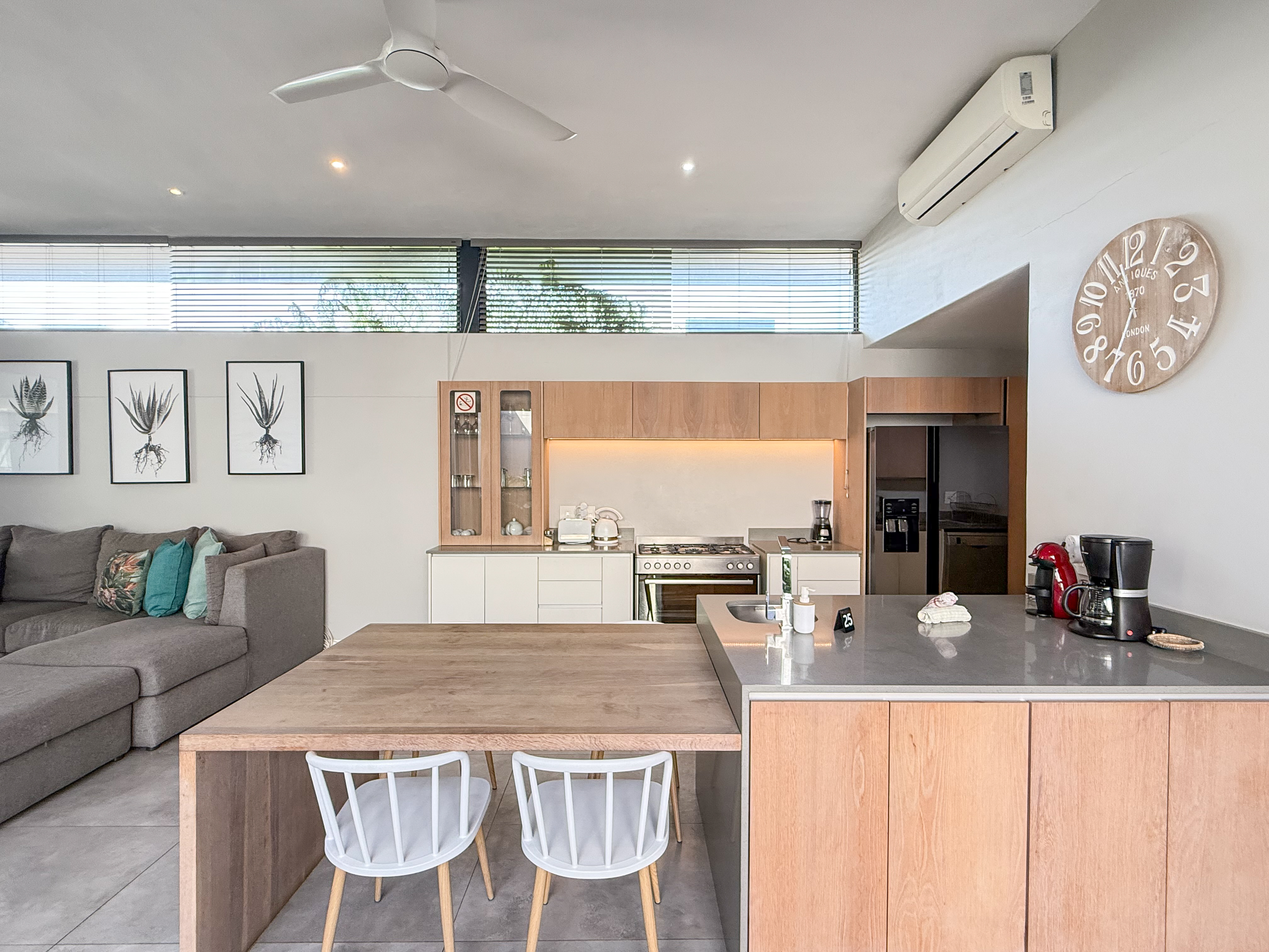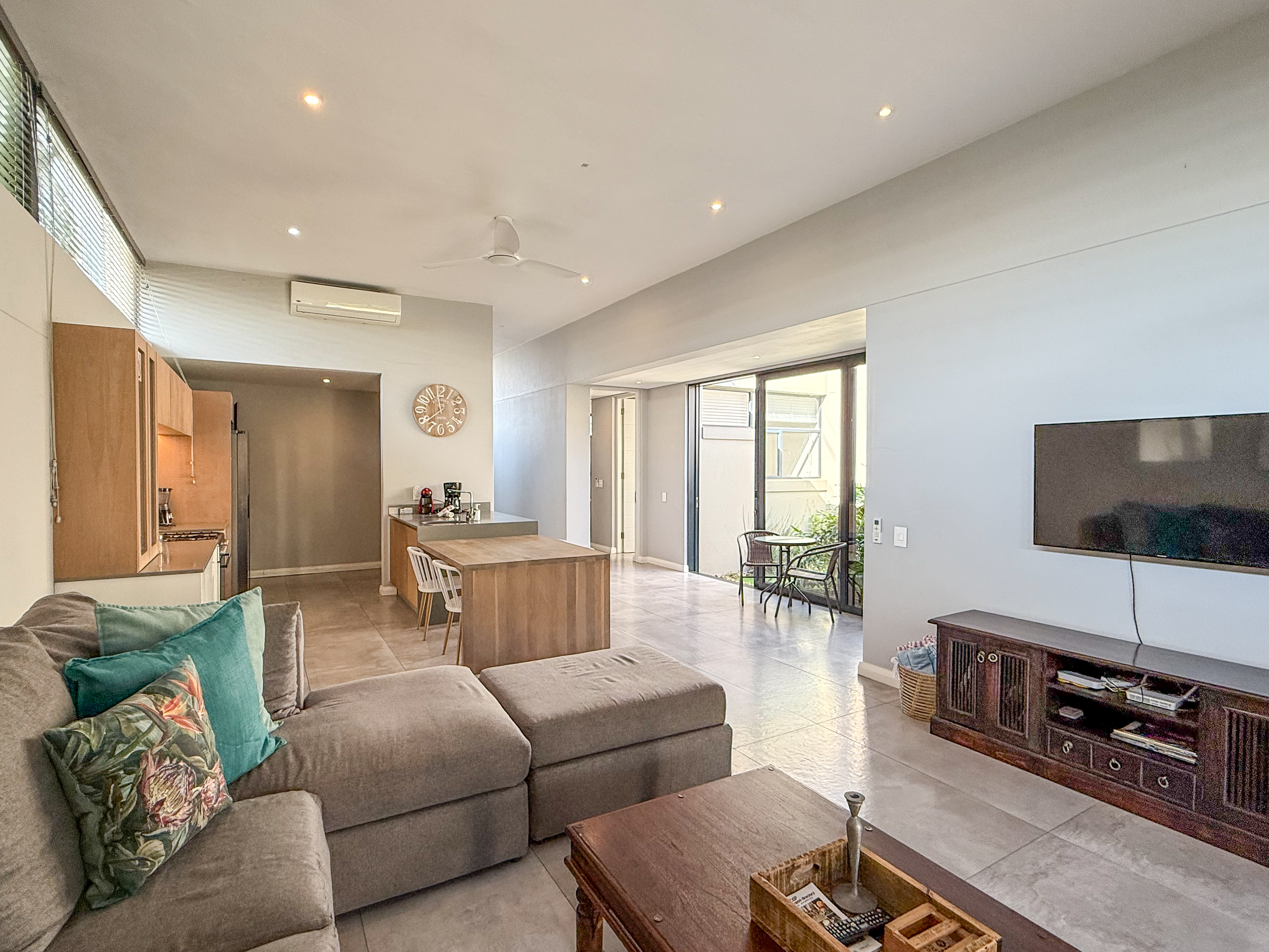 The spa-like master suite overlooks lush tropical gardens and features a beautifully appointed ensuite bathroom with a bath, large walk-in shower, double vanity, concealed toilet, and a dressing area with ample cupboards. The second bedroom is well-proportioned with its ensuite bathroom (shower and toilet), plus there is a separate guest toilet for added convenience.